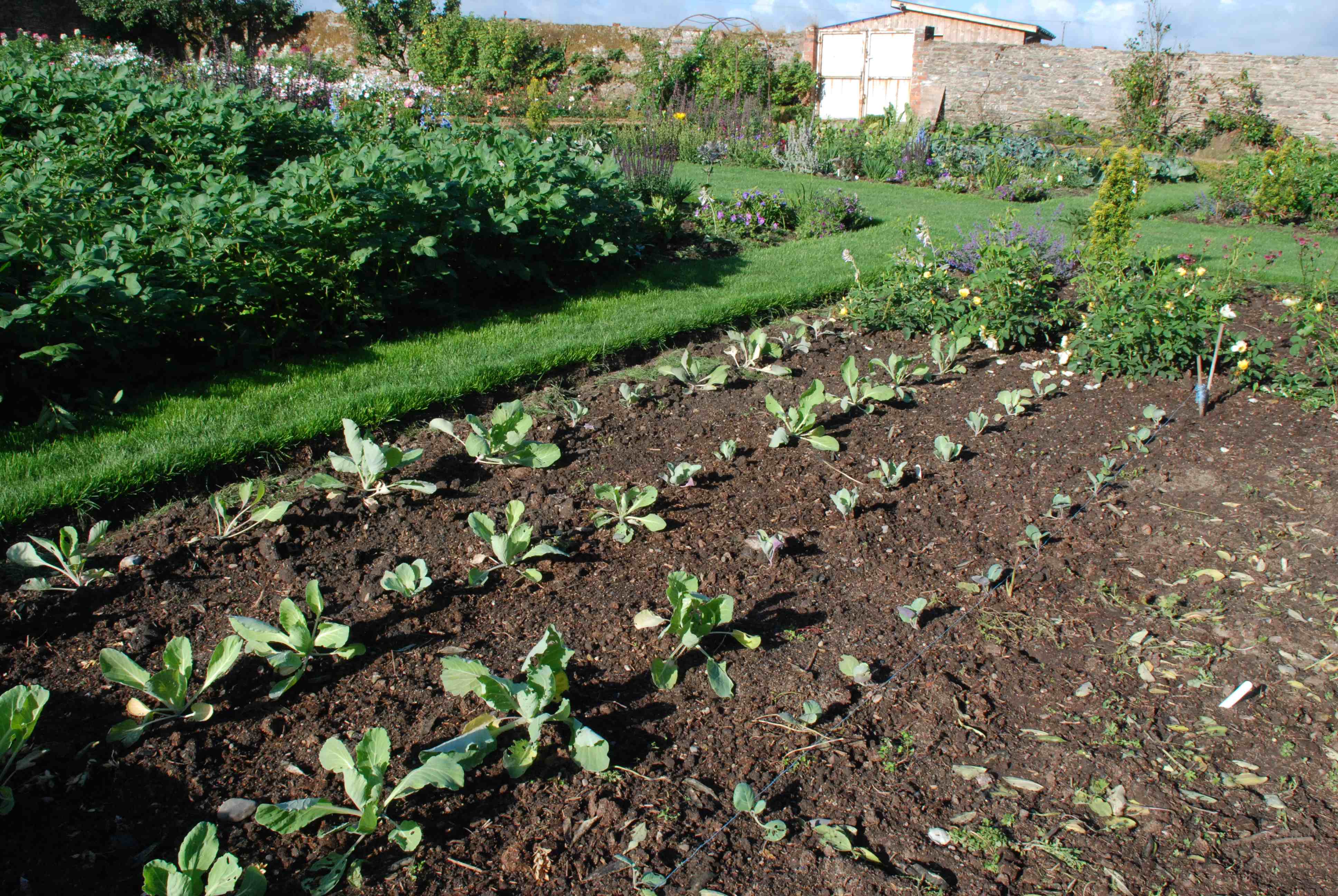 The young plants in 12-cell trays were rather late going in the ground and some had rooted through the drainage holes into the gravel below, while others had not, so the plants were of two distinct sizes when planted out in late July. The bigger plants obviously suffered root damage in the process so they needed thorough watering several times a week in the dry conditions in August until established. They were planted (about 60cm apart) in an area that had just been cleared of peas and broad beans. The bean roots were left in the ground in the hope that these would provide some necessary nitrogen. The ground was previously enriched with spent mushroom compost for the beans. After planting, once they were growing strongly, they were given a boost with pelleted chicken manure.