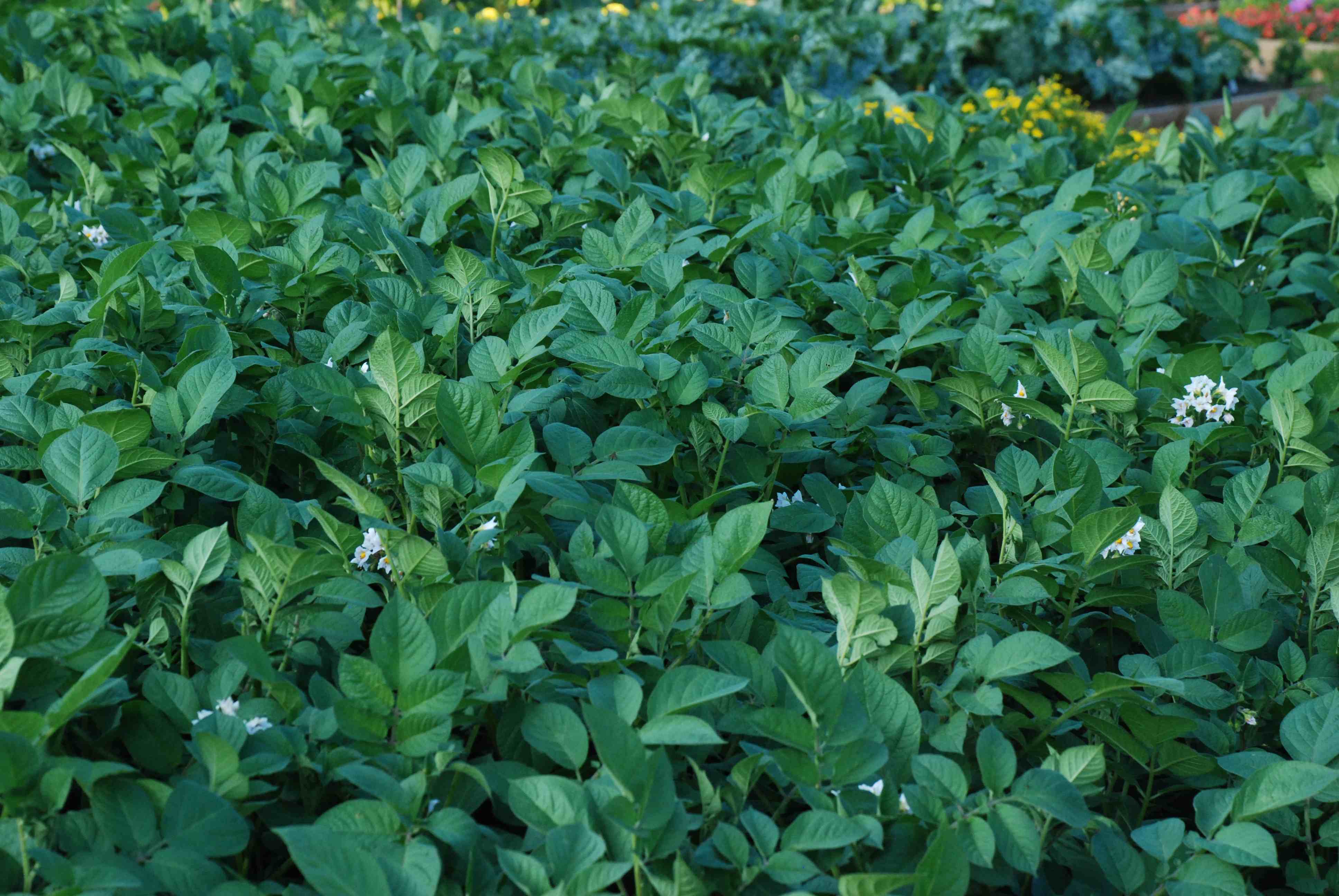 This is a vigorous variety – and vigour is good. The seed potatoes (small tubers and not seed as we usually know it) were planted in late April, later than usual because of the late spring. The shoots soon appeared and when they were about 15cm high they were earthed up, to cover the shoots with soil. This helps protect them from late frosts, helps prevent light getting to the developing tubers and can increase yield because the tubers form on the stem, not the roots. The tops quickly reached at least 1m high and as they fell over at the edges to cover bare ground the holes were quickly filled in with more foliage. It is superb, weed-suppressing ground cover!