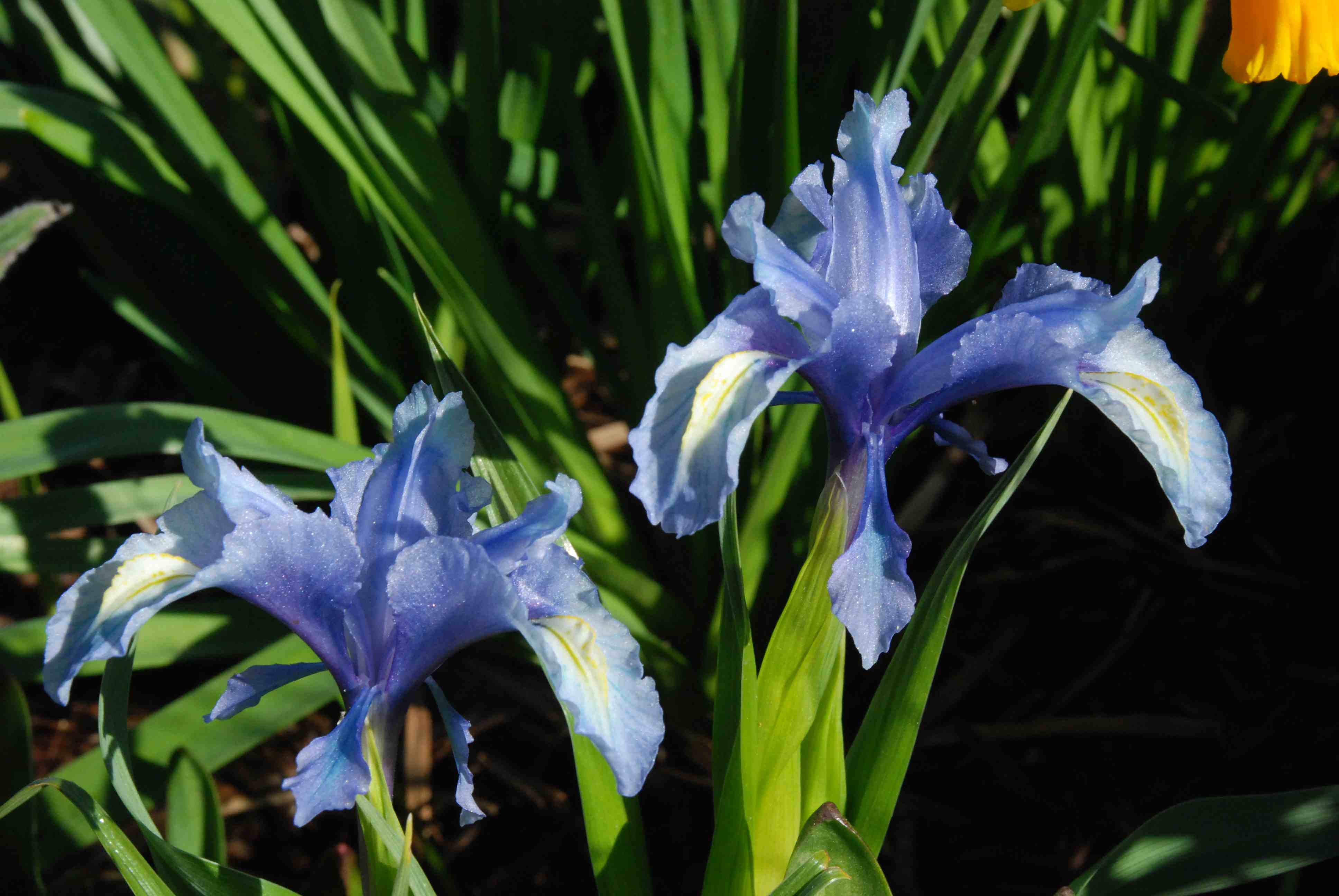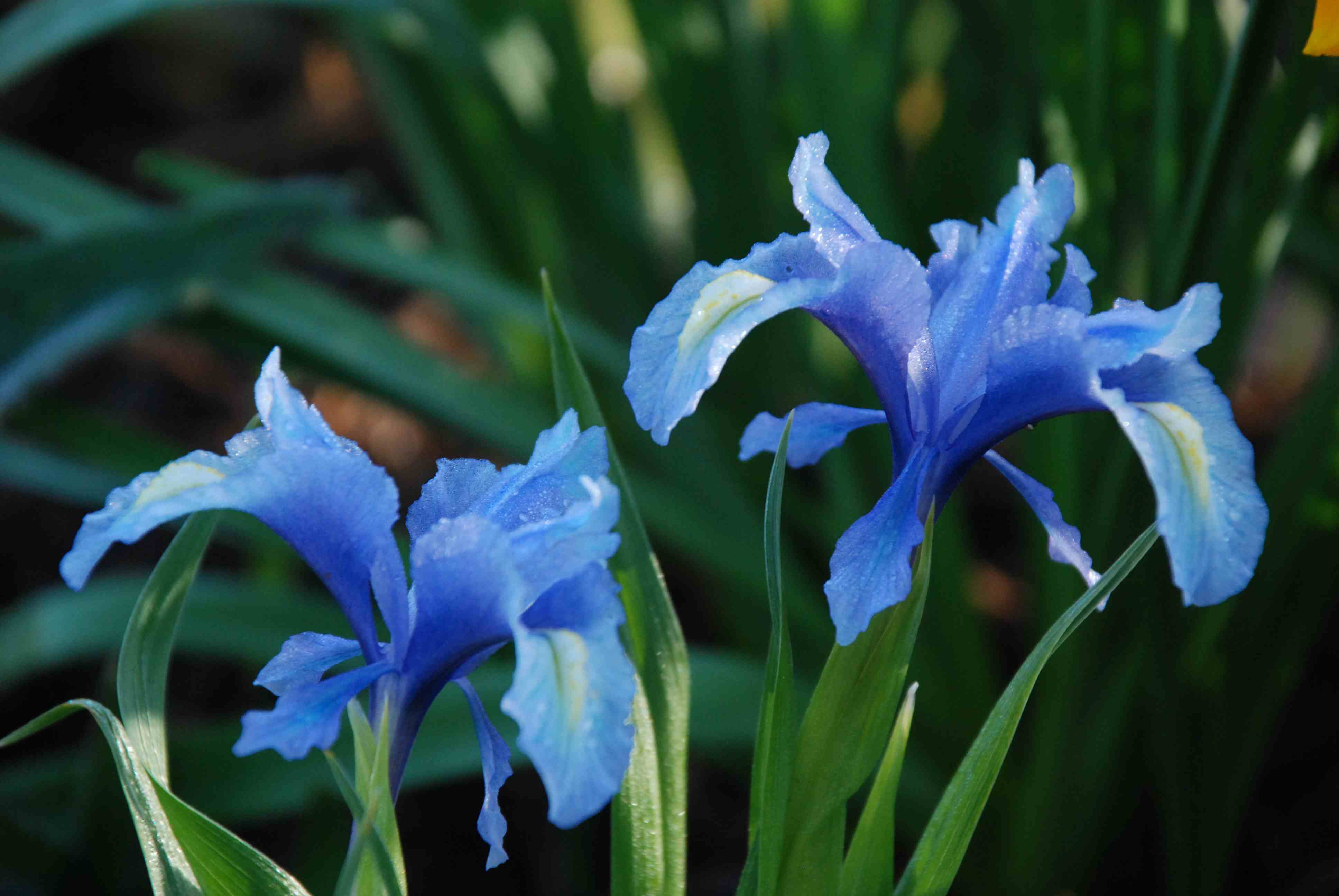 The Juno iris are very special and do not have normal bulbs and have thick, fleshy roots that should be healthy when you plant them. The plants look a bit like leeks and flowering -size bulbs produce a central stem with one or more flowers that open from the top down. Juno iris have standards that are small and hang down or horizontally and have a crest on the falls where the beard would be on a bearded iris.