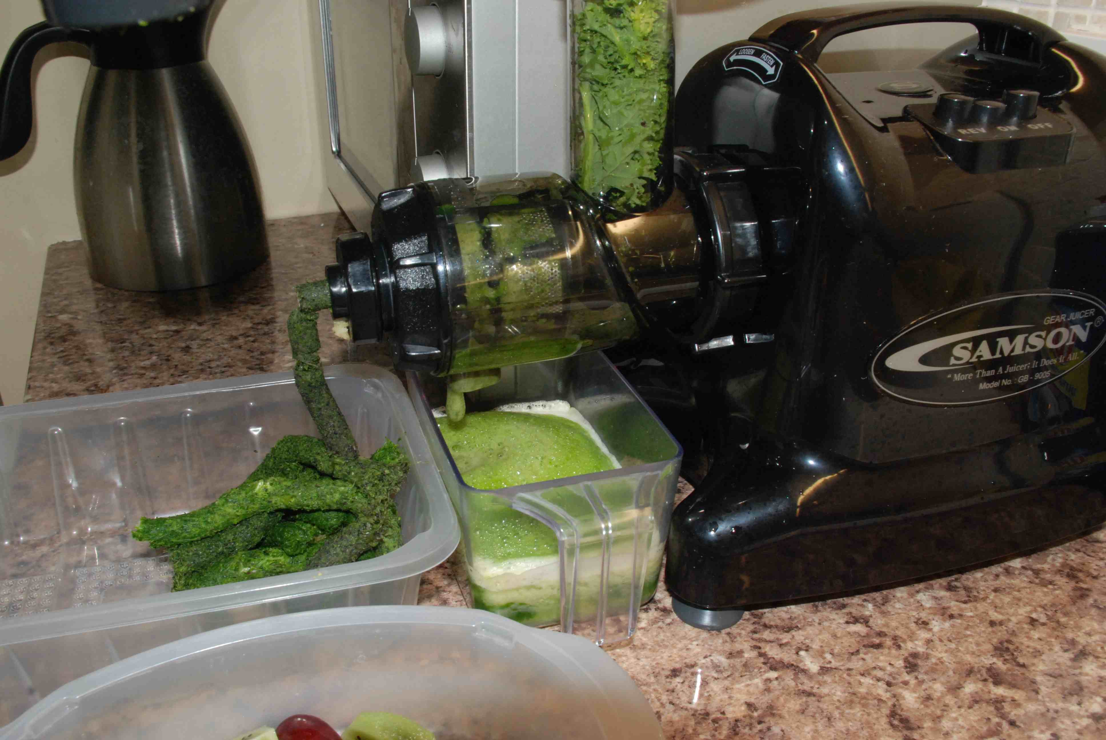 So a juicer that could turn old cabbage and kale leaves into nourishing juice seemed a good idea. I hesitated for a while because I have had a juicer before and while it worked on fruit well enough it took longer to clean the ******** thing than to drink the juice. Reading up on the subject also suggested that ‘fast’ juicers that spin at high revs damage the juice and the newer and more expensive ‘macerating’ juicers that grind up the veg and fruit at slow speeds give a better juice. I am not a sucker for kitchen gadgets but I thought this might be a good idea so I spent 249 euro on my Samson. This is not an advert so I won’t go on about the model but it really is quite easy and quick to clean and it deals with all the veg I have put through it. It can even handle pine needles (I haven’t tried that yet) and wheat grass (nor that) but it whizzes (slowly) through carrots, greens, ginger and everything else. I did try spring onions but slimy lumps when through which were not very pleasant. I could add that I have discovered a few things that I don’t like in the juice; onions for a start, celery, and cucumber. Look at the promotional videos and they throw all manner of green things in and drink the juice as though they are guzzling nectar – they are good actors! I have found that if I include some lime or lemon and some ginger along with some apple and/or kiwi I can put all manner of greens in and I can drink it.