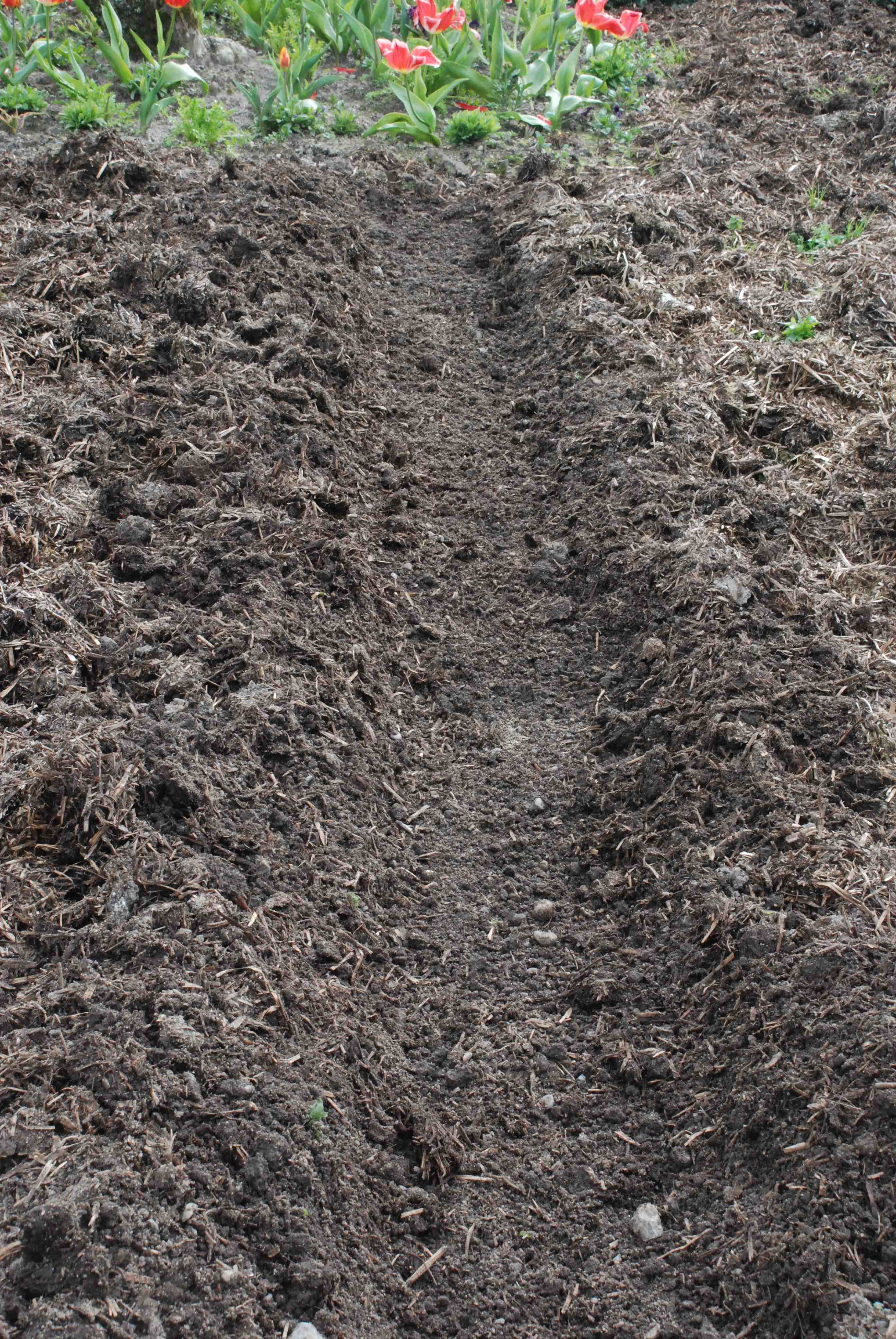 I have found from experience that if I sow half rows, with labels set halfway along the rows I cannot find them. So it would be sensible to put the labels high, on canes. But because I am not pushed for space and because I like to mix flowers with all the veg I simply ended the rows, if there was not enough seed for a complete row with, in this case, calendulas. If the weather is dry it is important to water the rows regularly until the seedlings appear. If the germinating seeds dry out they will die.