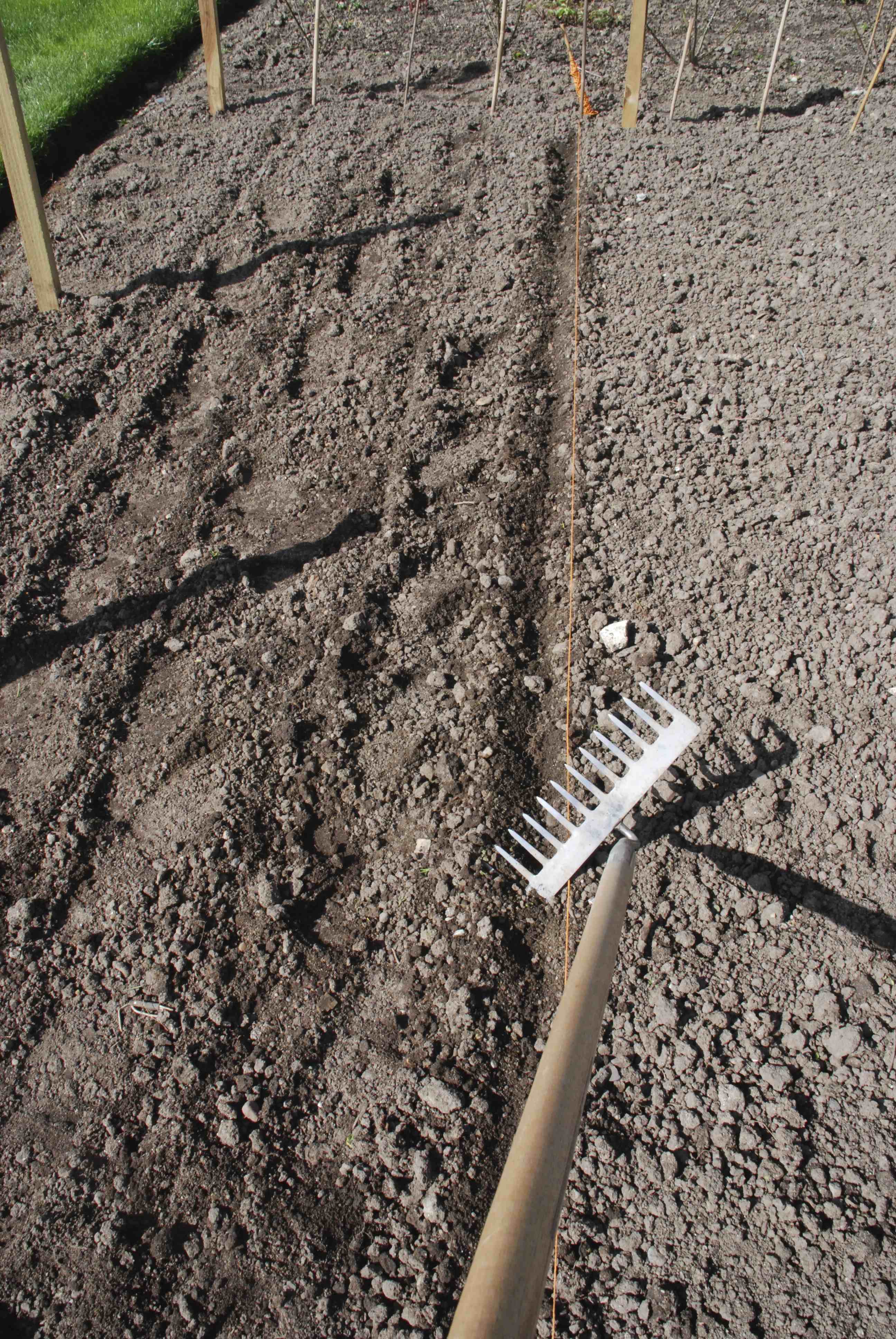 The area where the carrots have been sown is where I had a crop of peas and beans last year, followed by a crop of cabbages. It is important that carrots are not grown in recently manured soil and, of course, you should not grow any crop on the same soil for two years running. Although the soil is heavy (clay) it had a lot of mushroom compost and sand dug in last spring. This plot was dug in winter, rotavated in early March to break up the surface and then ‘broken down’ with the Wolf soil miller last week. It was then raked but I did my best to avoid walking on it where possible. I worked across the plot from left to right so I did not walk on the soil before I sowed. The sowed areas have been walked on but the soil where the seeds have been sown have not been walked on to prevent soil compaction.