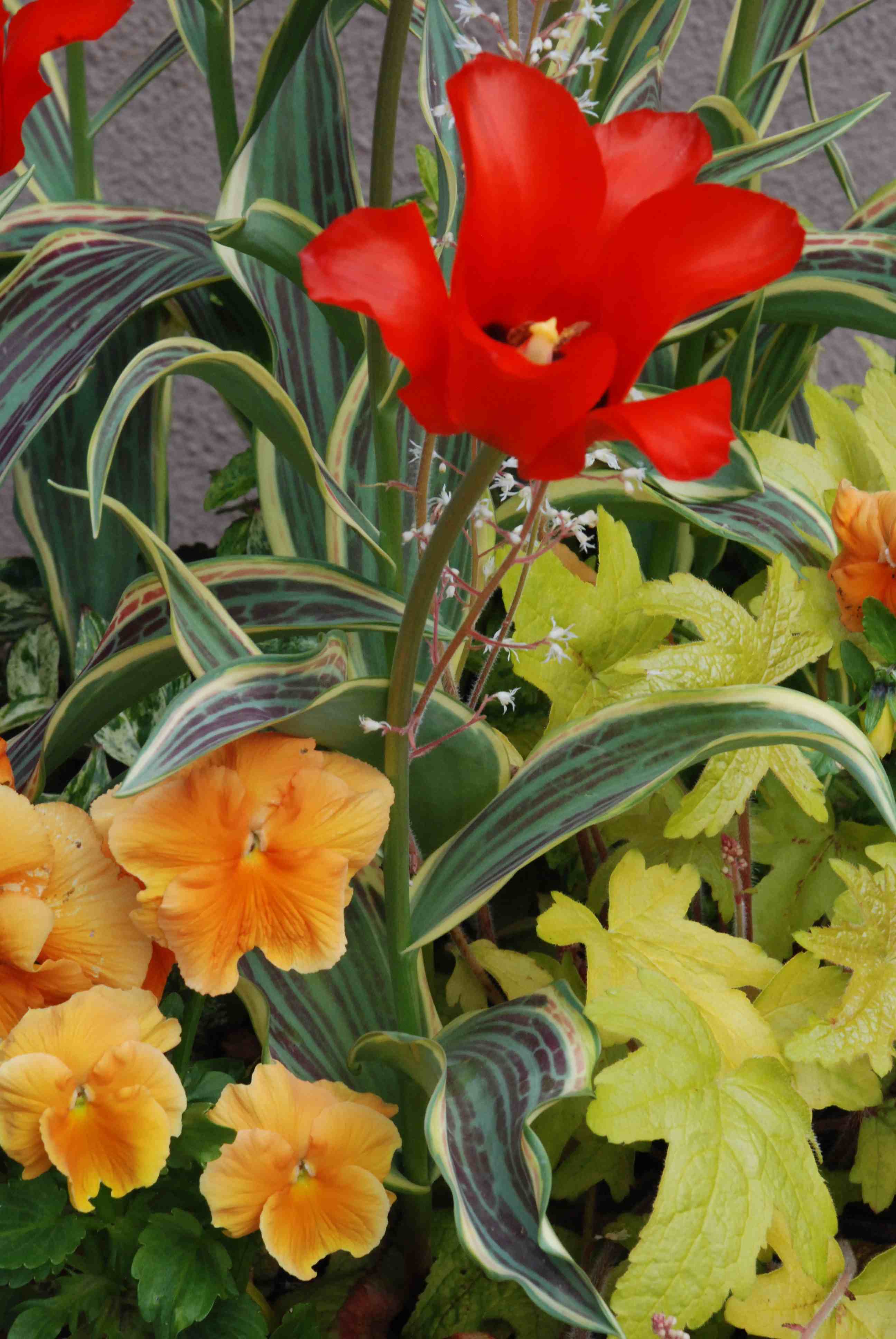 As expected, the flowers on this beautifully foliaged tulip suggest that it is a sport of ‘Red Riding Hood’. The flowers are slightly angular, as is common in Greigii tulips, and bright red. I am not sure now whether having the red flowers on such a concoction of foliage is a bit too much. I think it is a keeper but I think it needs a very simple background and I will save the bulbs and make sure I put them with something simple next year!