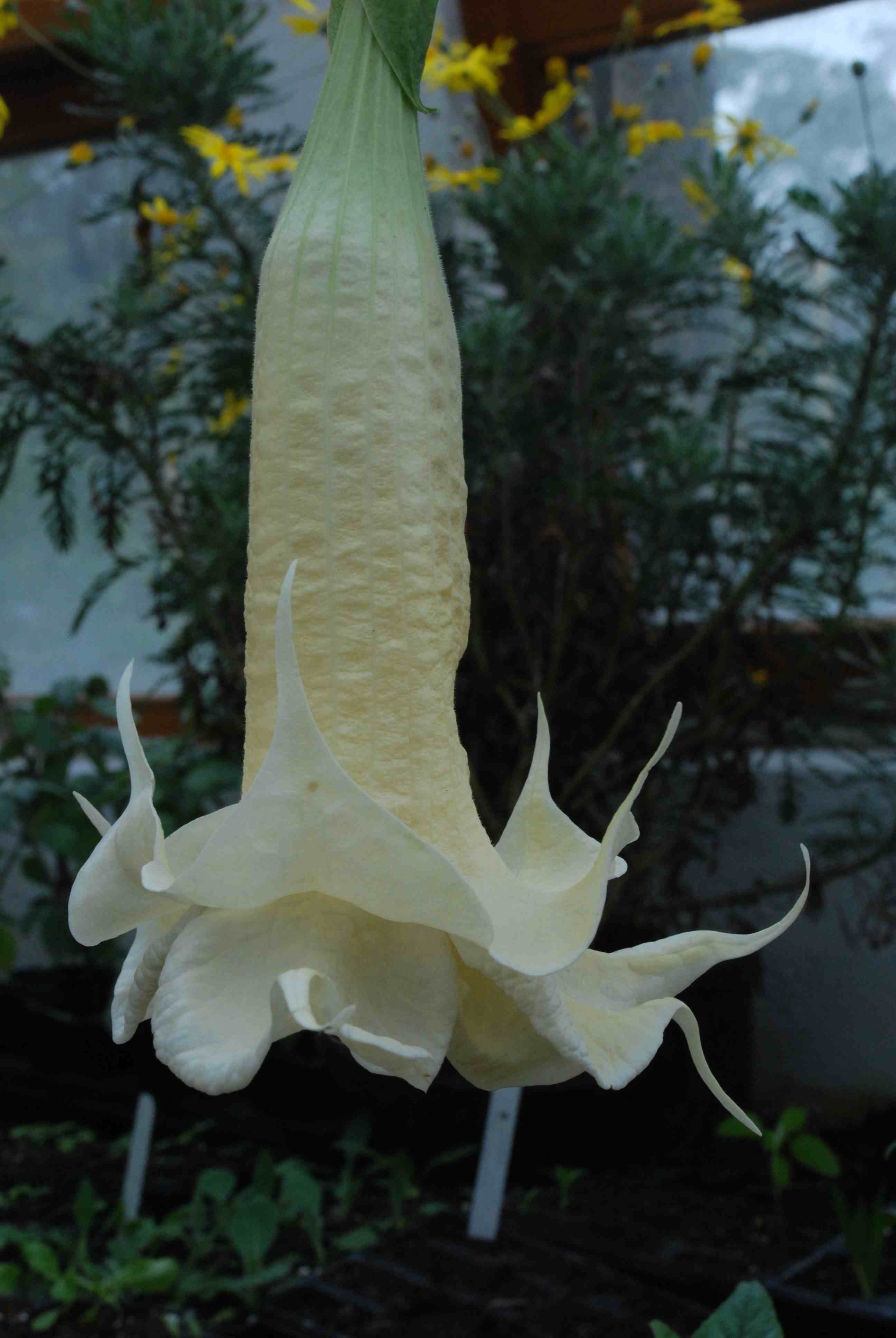 The first of the new ones to bloom is B. x candida ‘Angel’s Love’. Brugmansia candida is a hybrid of B. versicolor and B. aurea. ‘Angel’s Love’ is a huge flower, fully 40cm long and has two rows of petals, the inner ‘bloom’ is as big as the outer one and the flower started cream, opened to almost white and is maturing to cream again and has become pale apricot. The most notable aspect is the perfume! Just the one bloom fills the greenhouse with scent. I am looking forward to it getting bigger and having more than one flower open at a time!