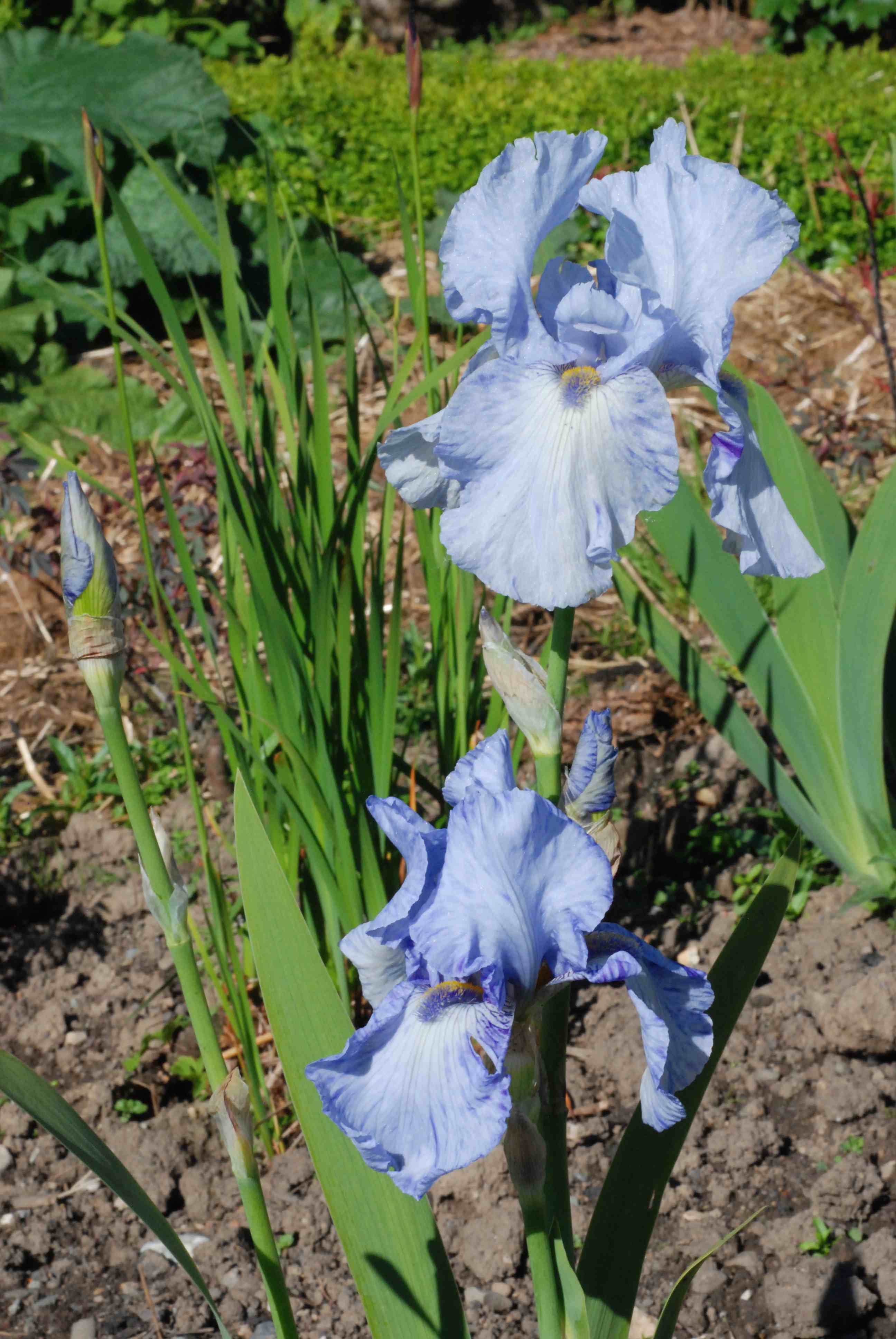 I received the iris for the garden (all bearded and mostly tall bearded) last August I have been impatient to see their first flowers. The poor plants had a tough start to life in Ireland. They were planted temporarily in a holding area and then moved again, when the summer flowers had been removed to make way for the permanent residents of this part of the garden, in October. This is much later than I would like because bearded iris make two lots of roots every year, in March and in August/September which is why August and September are the best time to plant them – so they get their roots down and hold the plants steady should they flower the next summer.