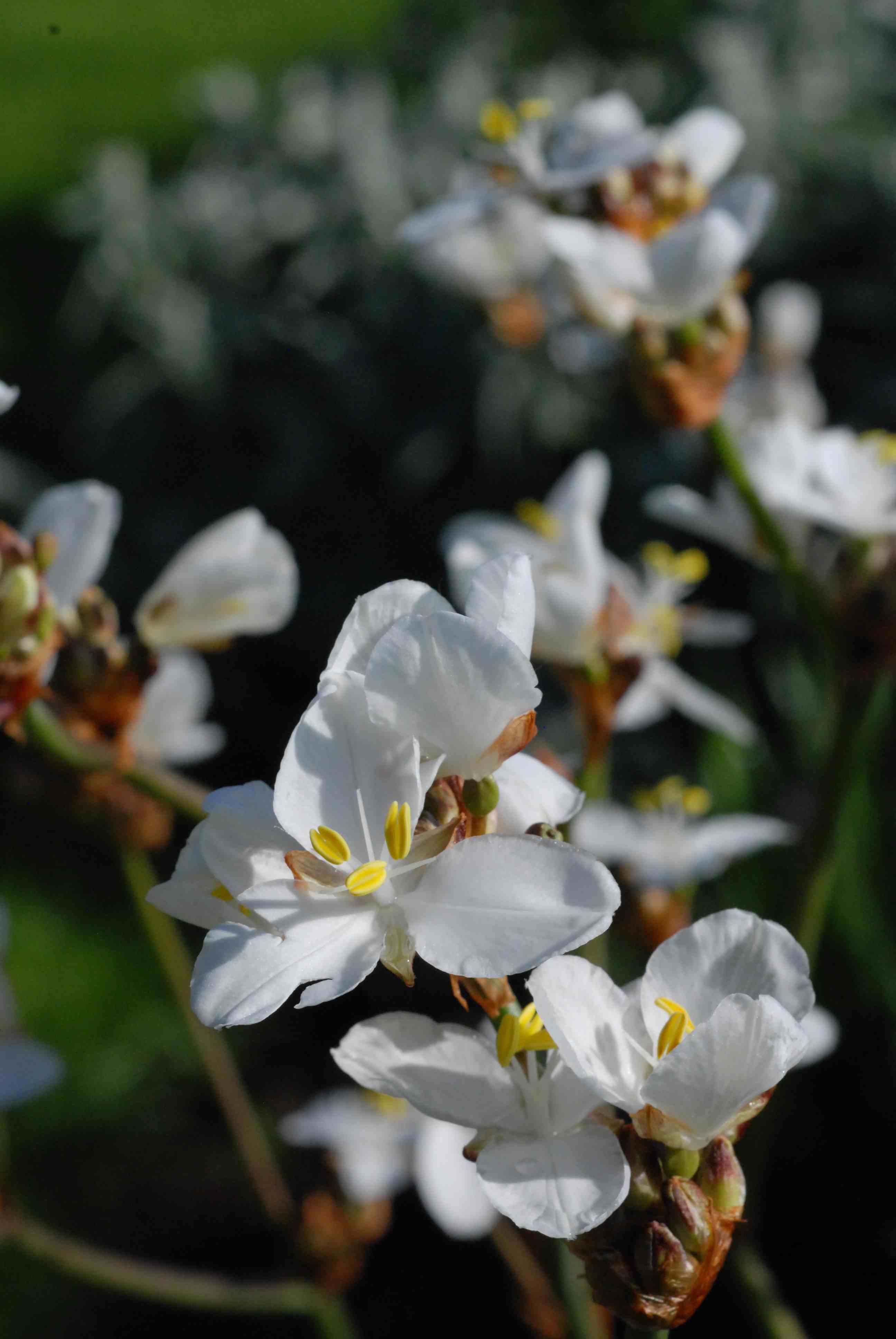 The three petals and three stamens confirm that this plant is in the iris family. It will grow in most soils and although it is supposedly drought-tolerant and often said to prefer well-drained soil it has done extremely well in the heavy soil here. The plants were put in a year ago and you can see how they have developed in the top photo. When the flowers eventually finish the stems carry attractive round seed pods. It may self seed if it is happy but I can’t see this plant ever being a nuisance. It will grow in full sun here though in warmer climates it should also do well in part shade. It is ‘normal’ enough to fit well into a traditional garden but it would also suit minimalist designs too and it would be striking in stainless steel containers. I would also love to use it in brick paving so soften a courtyard where its white flowers would lighten a small town plot.