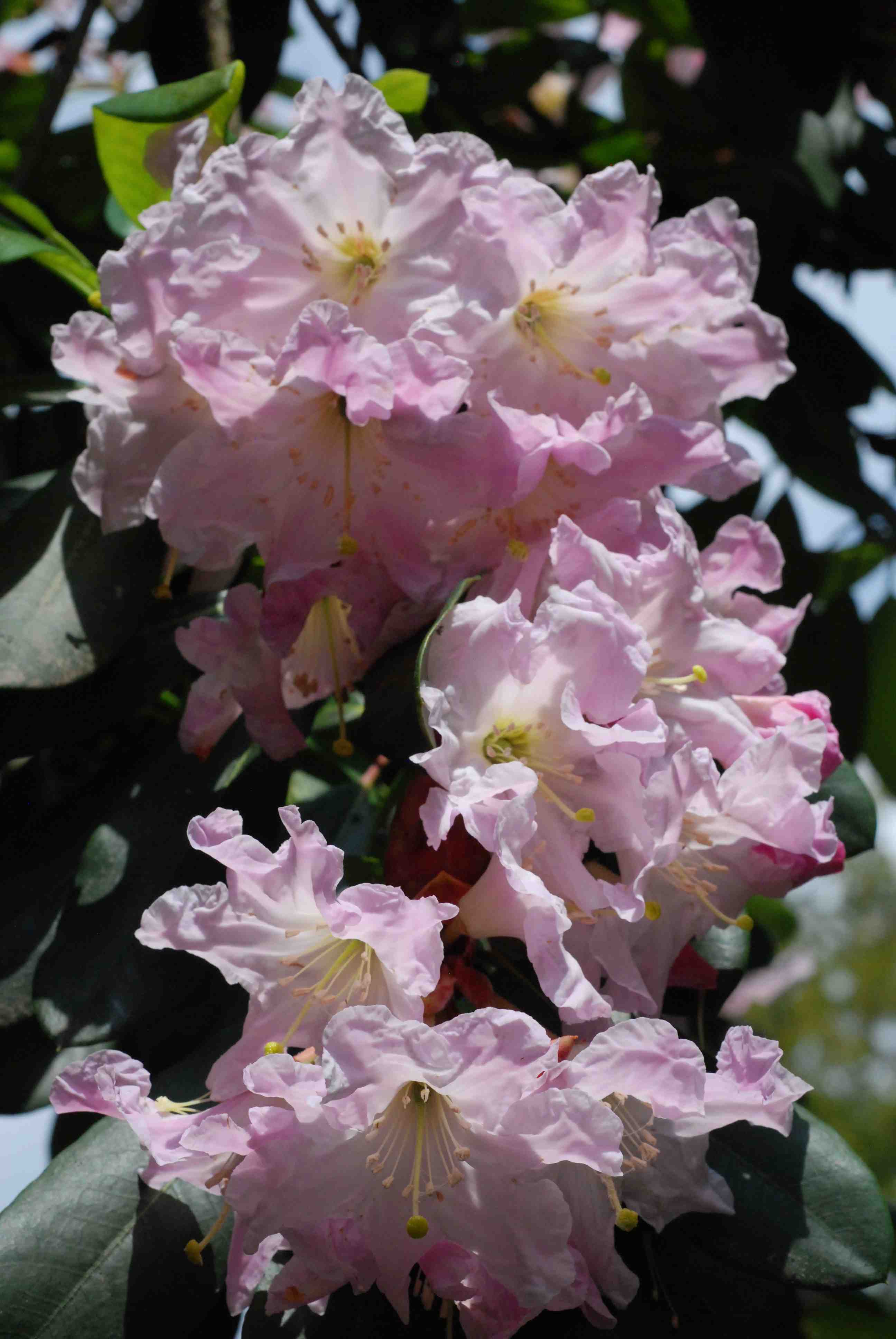 Rhododendron decorum is a big species from Sichuan, Burma and Yunnan and was introduced to the west in 1887. The pink flowers are lightly scented and very beautiful. It is among the latest to bloom and is a parent of the very late and notable white rhodo ‘Polar Bear’.