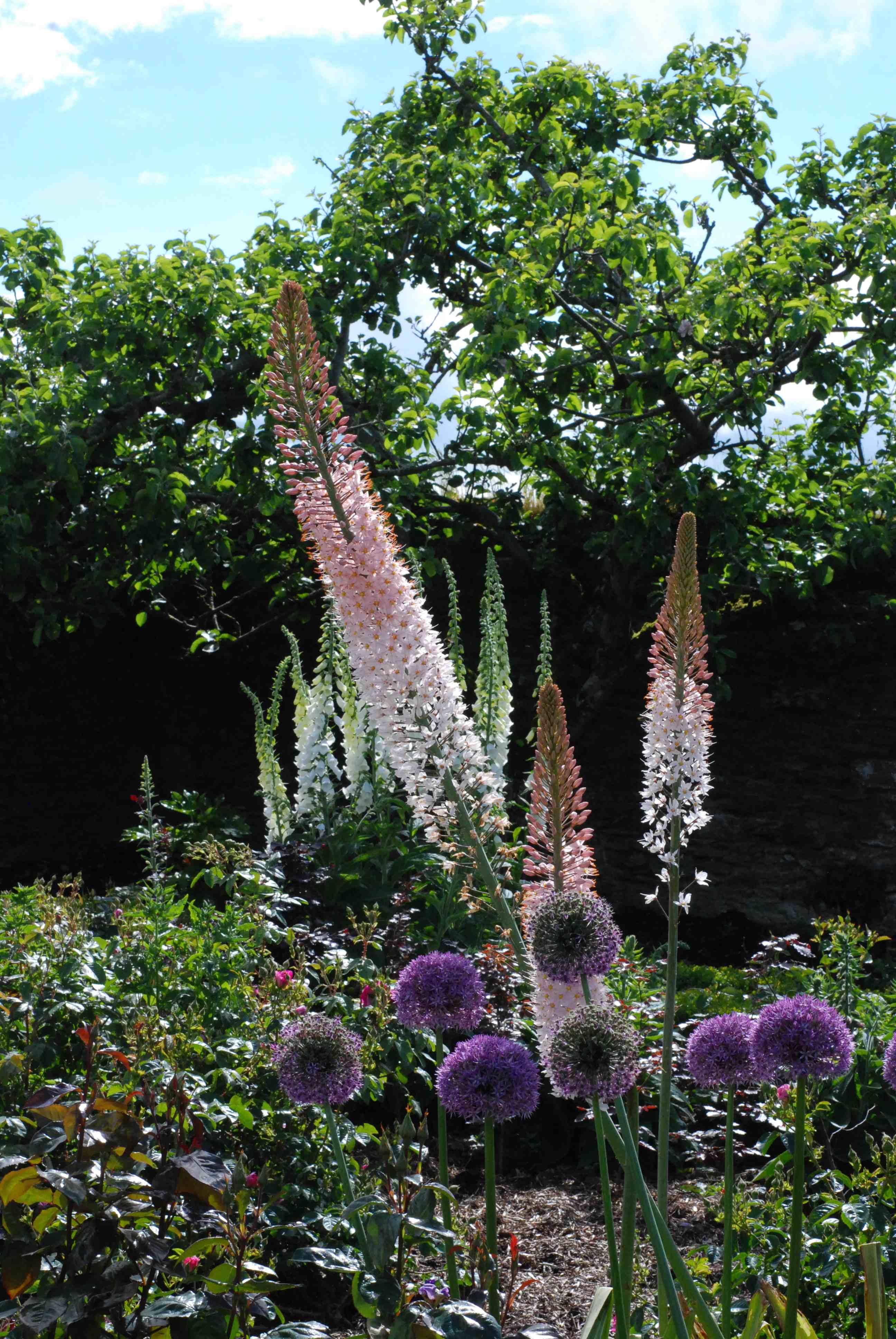 At the end of last year I posted about eremurus, with photos of the strange, deep-sea-creature-like roots and hoped that they would settle down and flower for me this spring. They were planted among the roses and my wish was that they would provide some height and glamour early in the season. I took out wide, shallow planting holes to accommodate the wide roots and planted them with some alliums for interest lower down. I am pleased to report that they have delighted me with flowers.