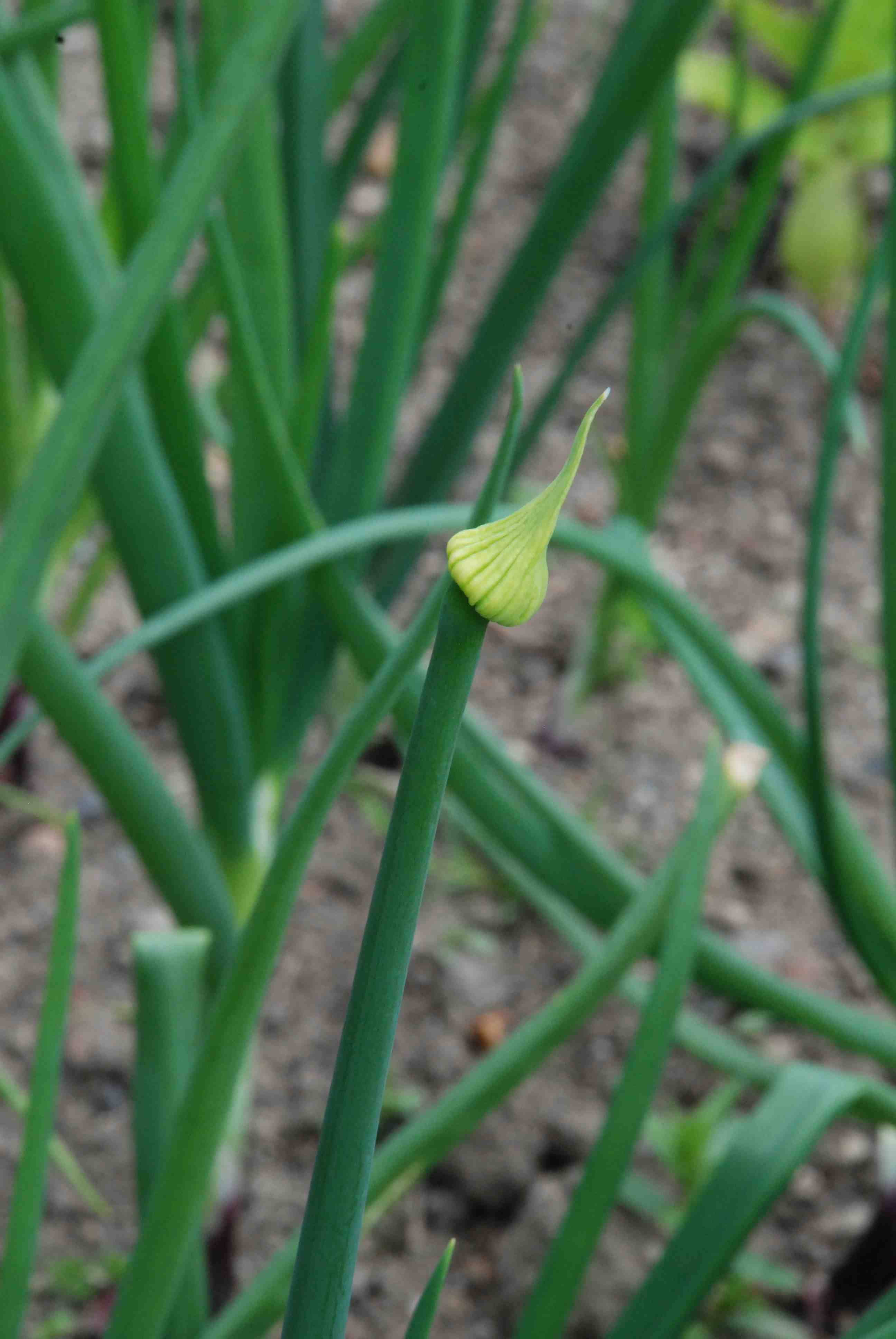 I like red onions and they are worth growing yourself because they are relatively expensive to buy compared to white onions. But they are more prone to bolting (sending up a flower scape). This seems to be a common problem among all onion sets but especially the red onions. A few more are sending up flower stems every day and I would say that 20% have bolted. The problem with this is that when they do this the bulb stops growing and the bulbs will have a hard stem in the centre. They do not store well and although parts of the bulb are edible they are not so good.