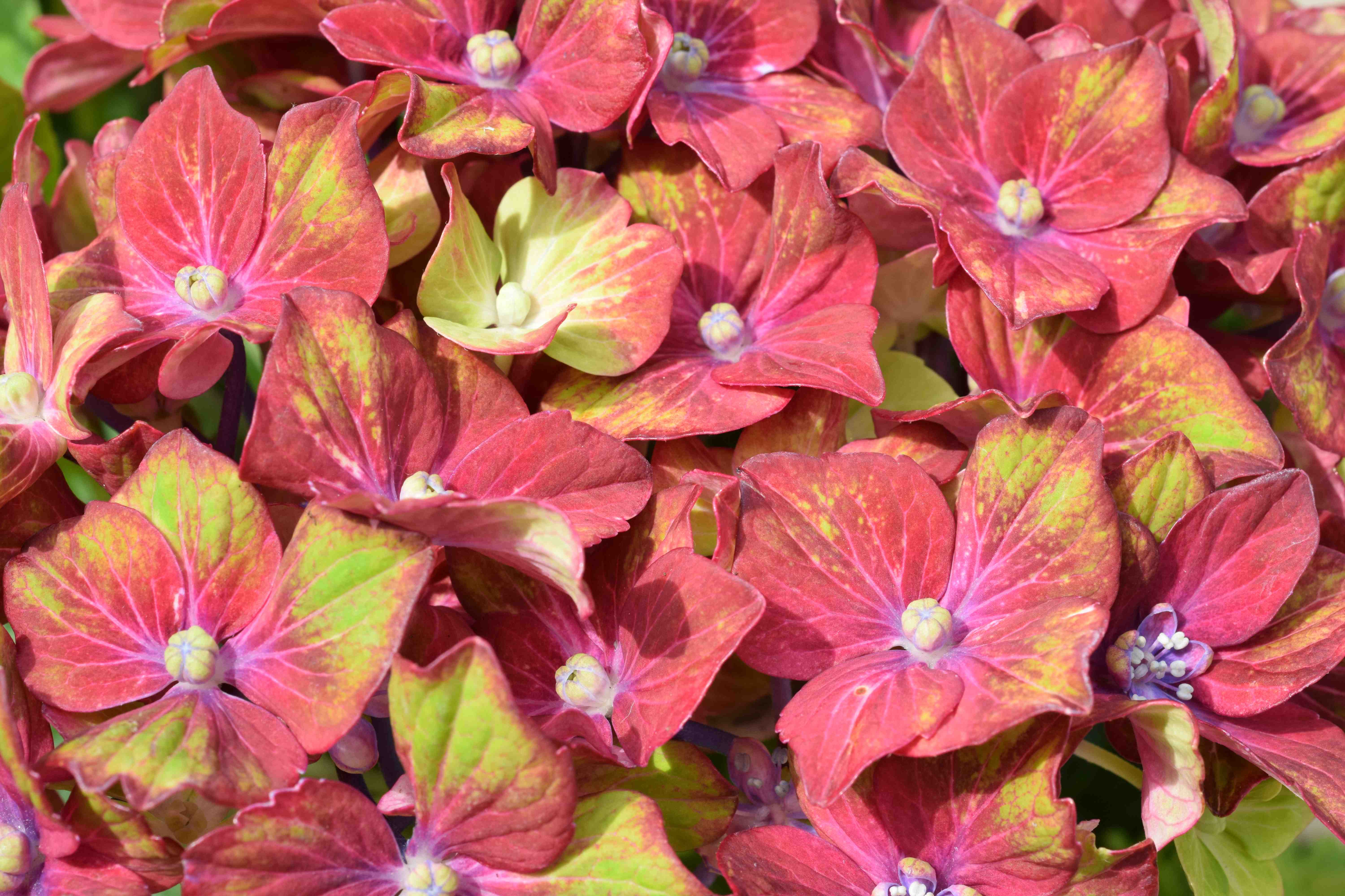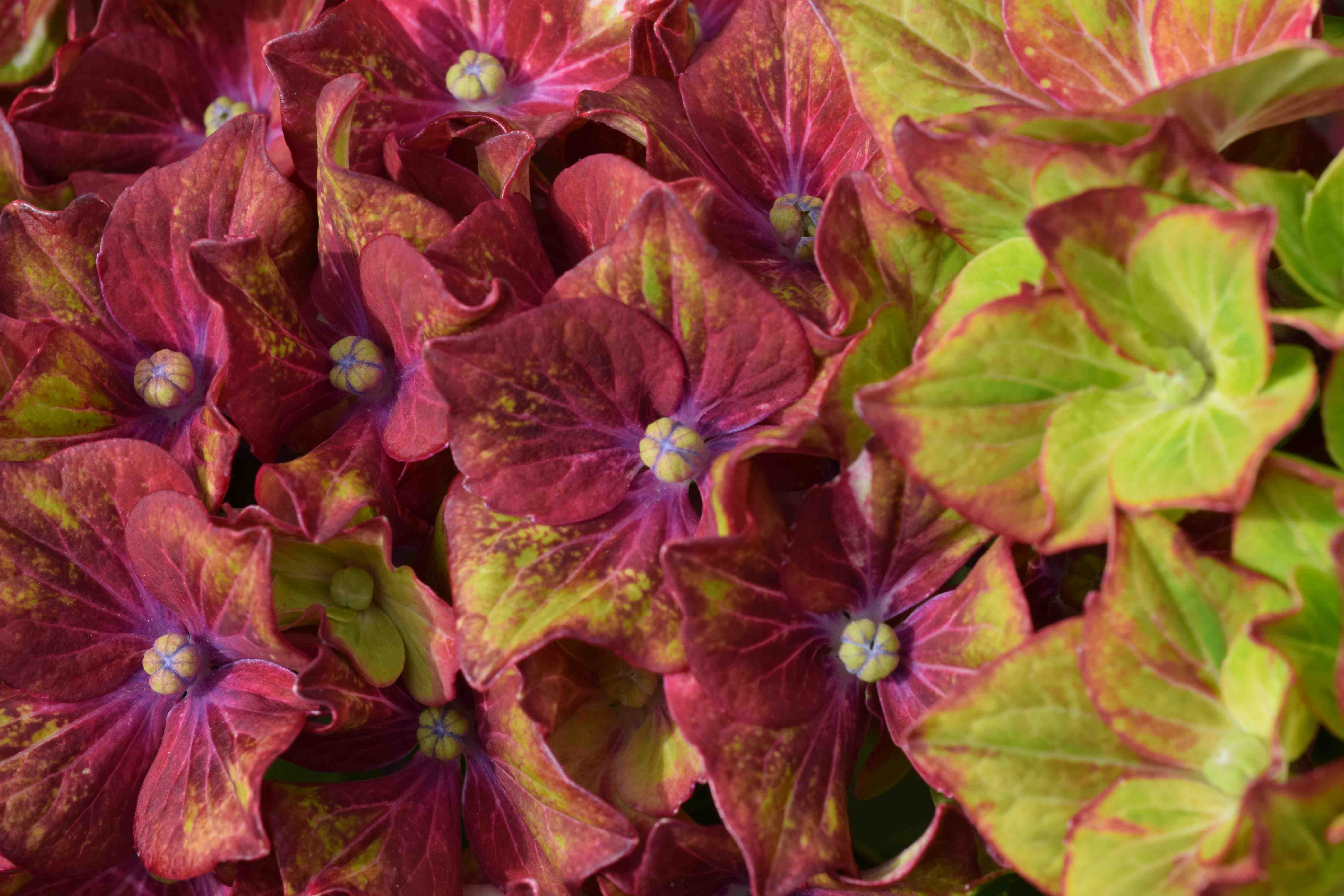 But this post is about a relatively new hydrangea that is either beautiful or awful – I can’t decide which. I think it was introduced to UK consumers by Thompson & Morgan who named it ‘Glam Rock’. It looks like no other and is a German-raised seedling that is part of the ‘Saxon’ range. It is compact but what makes it special is the colour of the flowers. They are deep pink/red with green streaks and tips to the sepals and in the centre of each individual ‘floret’ is the true flower which is blue. The flower stems are also purplish blue. The blooms start green but gradually develop their colour as they age.