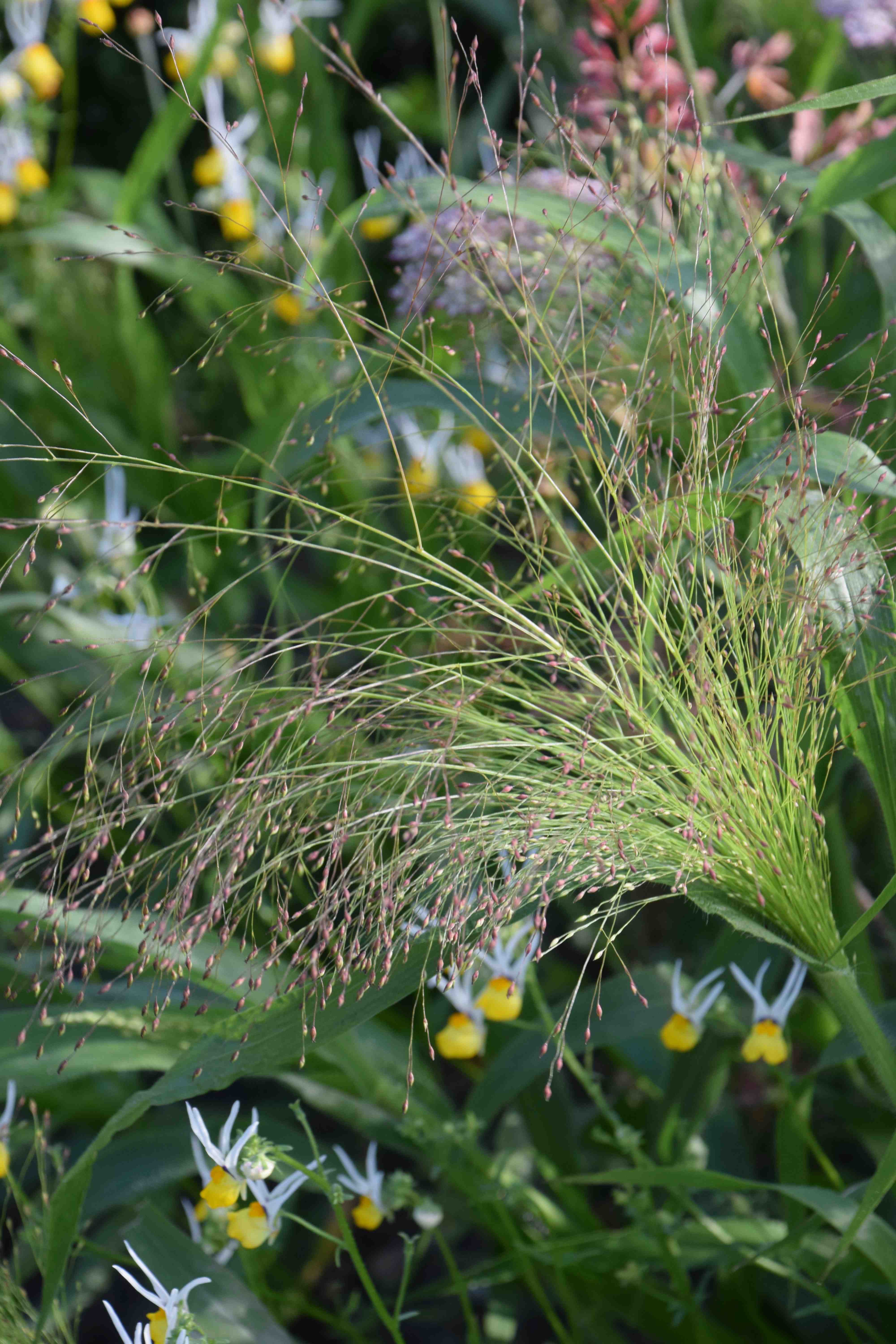 Panicum elegans is a beautiful grass that is apparently perennial in mild (frost-free?) parts of the USA where it is native but is most definitely an annual in the UK and, I suspect here in Ireland. In the past I have found that it selfseeds – but never enough! When young, the plants are unremarkable, with rather broad green leaves. I find that the seedlings grow painfully slowly when in cell trays and I will have to try them in a better-drained mix or with some loam because they definitely seem to struggle in standard multipurpose mixes. Grasses are heavy feeders so maybe I should feed them more. The seedlings seem to wobble on the compost and are attached to the compost only by painfully thin roots. So I took great care when planting them out in May. Fortunately, once planted out the plants seem much happier and they grow strongly, tillering and putting up many stems. Now, with summer in full swing, the fascinating flower heads are being produced.