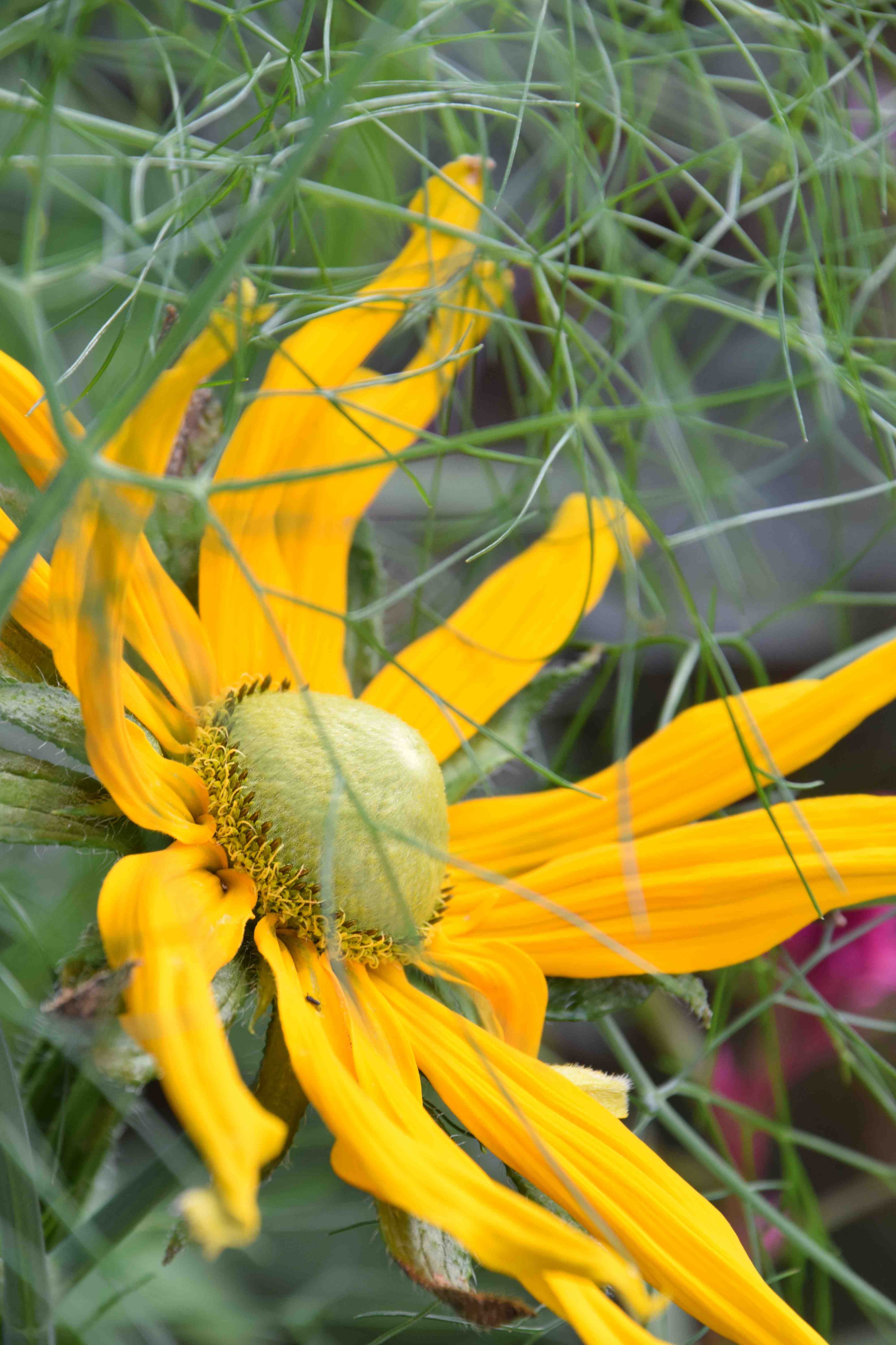 Although this is apparently a Fleuroselect winner, it seems to be very variable and I am not quite sure whether my plants are typical or not. Certainly lots of photos of ‘Irish Eyes’ seem to be more like ‘Prairie Sun’ which is a more sophisticated plant with more, smaller blooms that have more petals and are paler at the outer tips. ‘Irish Eyes’ is often recommended for containers but I don’t really agree with this unless it is a big pot. It is too rangy, it blooms too late and it is too tall to give the kind of effect I would want. But if you have a 1m high terracotta pot and you plant it with grasses, fennel and this rudbeckia you could have a ‘prairie’ effect 2m high in total. Impressive.