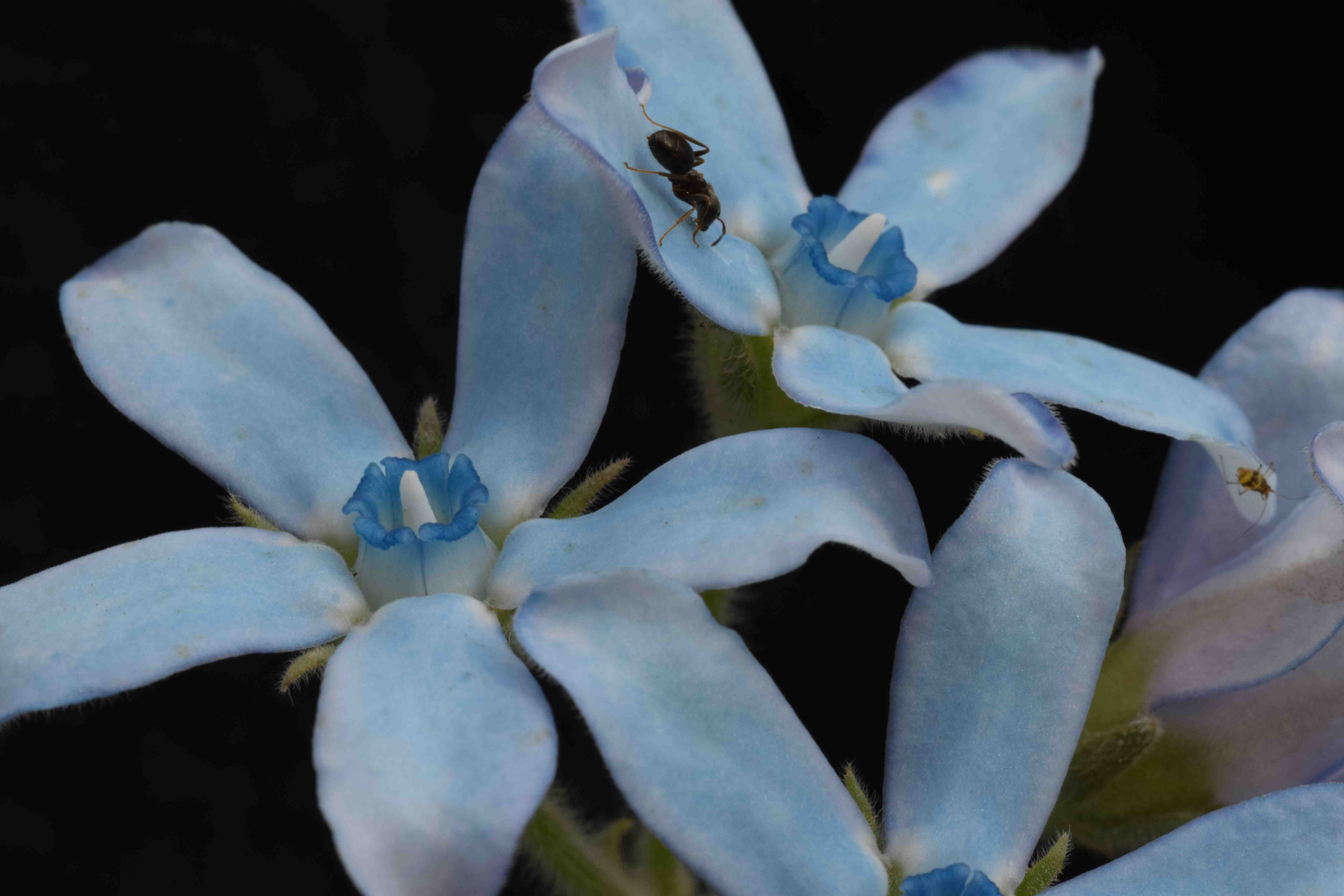 The plants themselves are willowy, with pairs of arrow-head shaped leaves and the whole plant is softly grey. The sap is milky and I guess mildly irritant but that doesn’t stop insects liking the taste of this and its relatives and apart from the ant, which was presumably after nectar, I noticed an aphid on the blooms too. In fact pests (or insects) are a feature of plants in this family – such as monarch butterflies on milkweeds. The soft blue flowers are about 1cm across and are carried in clusters of 3-5 on short stalks off the main stem. They sometimes develop a purplish tone as they age (which I dislike) but so far mine haven’t (which I am pleased about).