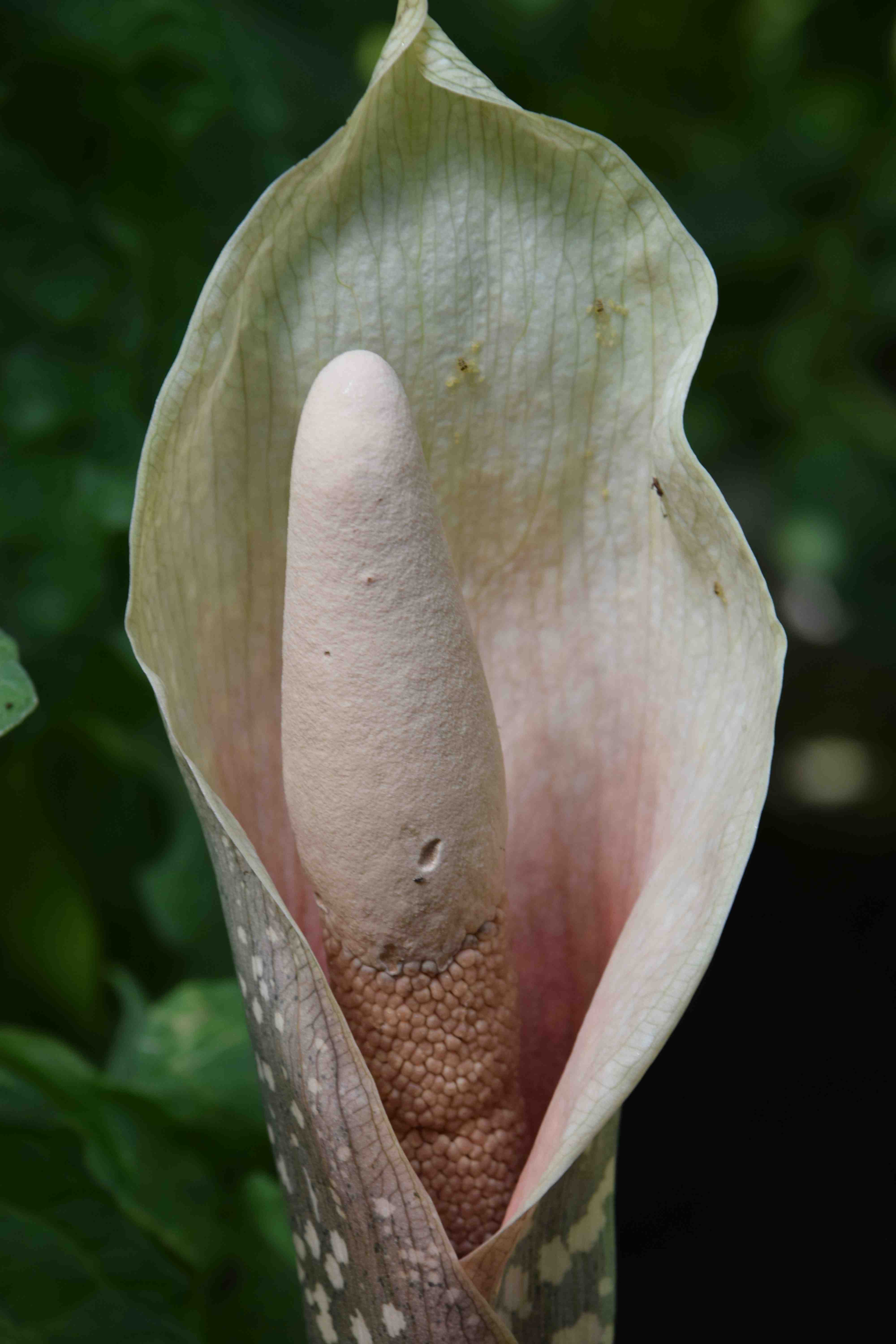 You just can’t hurry some plants. I planted this Amorphophallus bulbifer in March and have waited patiently for some sort of growth. Like many tuberous aroids amorphophallus appear late in spring and grow when they decide they want to rather than when you want them to! Kept moist in the greenhouse the large tuber produced nothing until a month ago and then a thick shoot appeared and today the flower (inflorescence) finally opened. The ‘flower’ is about 30cm high.