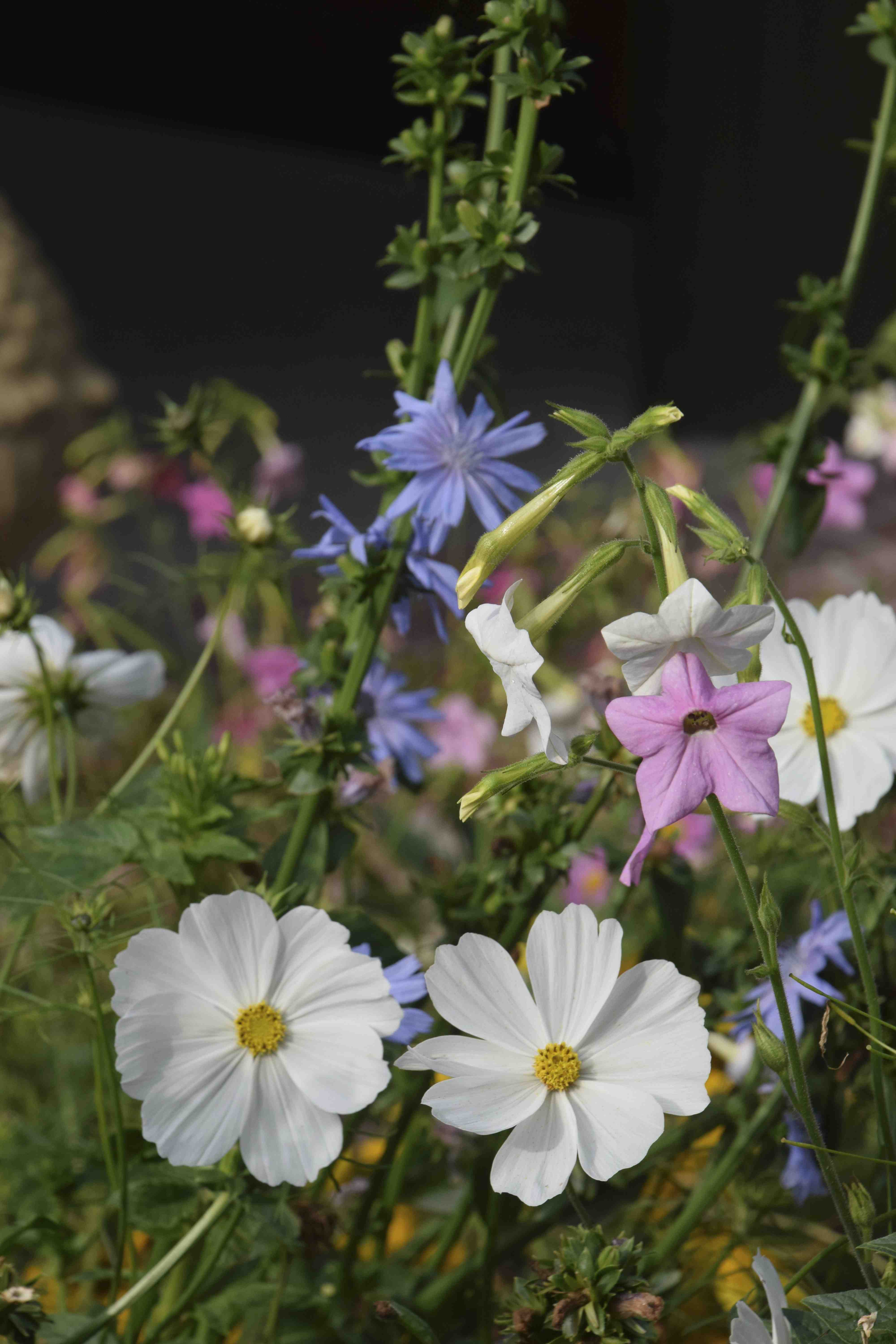 Around the cafe and shops was some interesting plating, repeated again and again. I thought this combination of white cosmos, Nicotiana mutabliis (or N. ‘Marshmallow’) and blue chicory was inspired