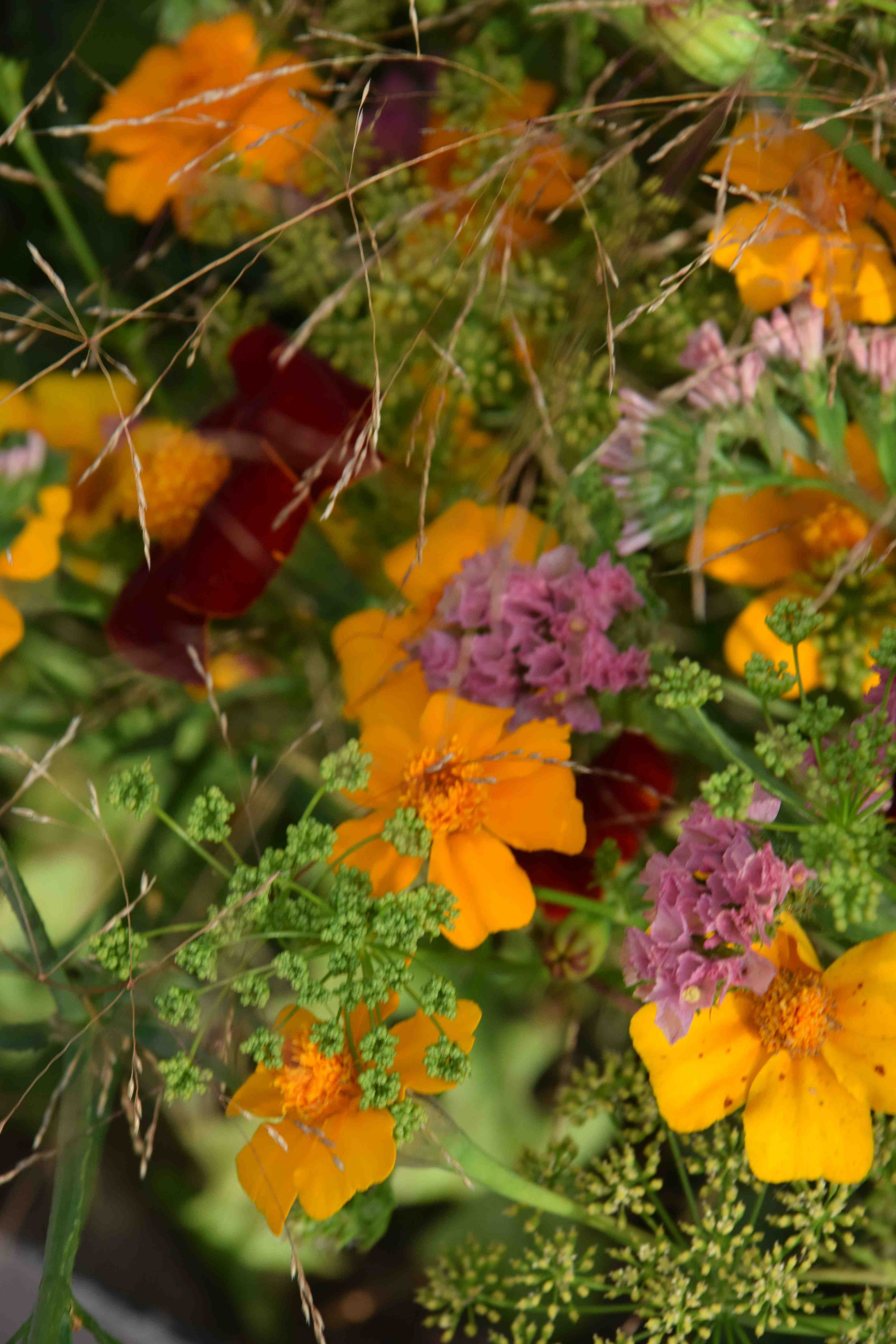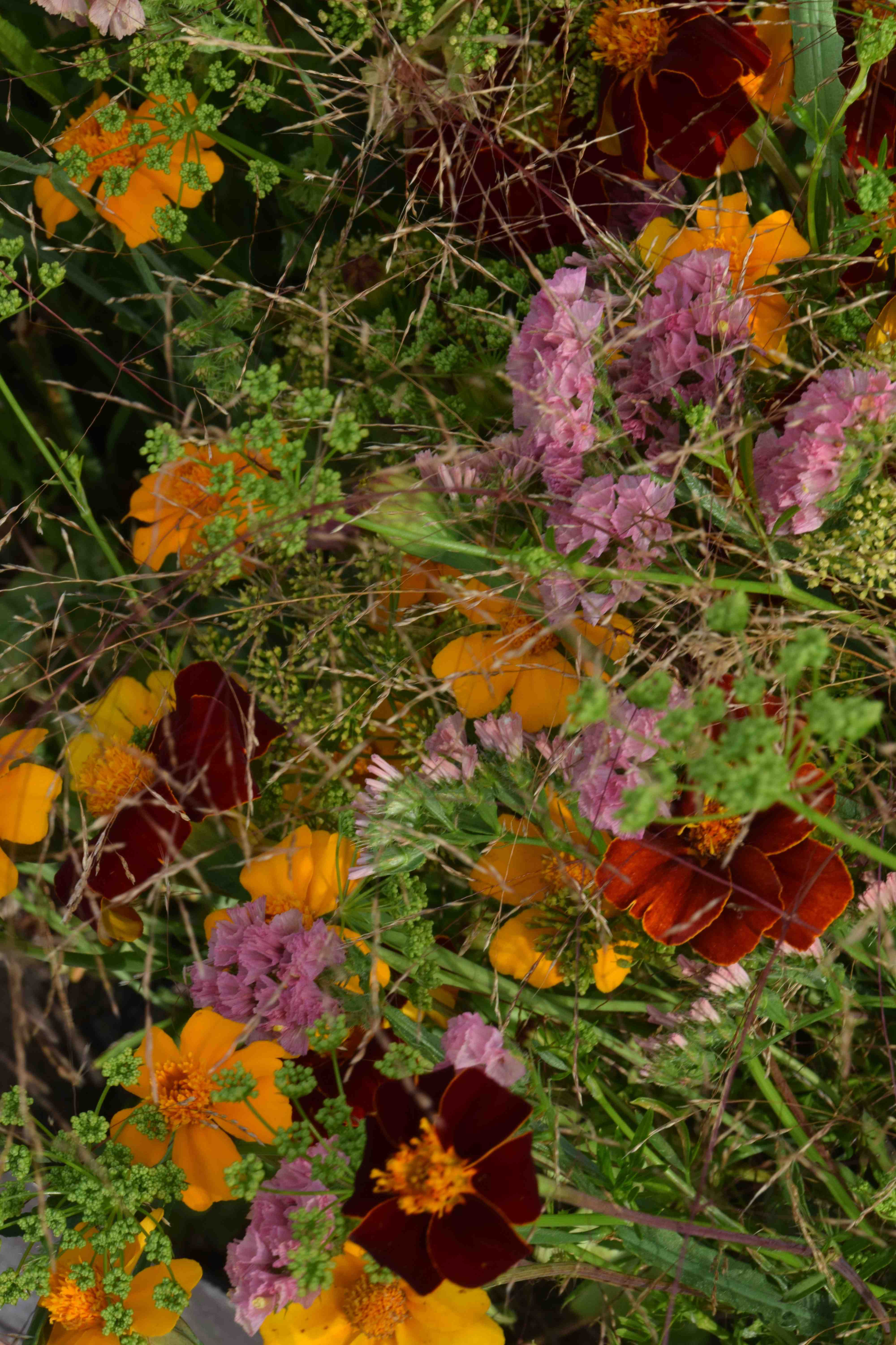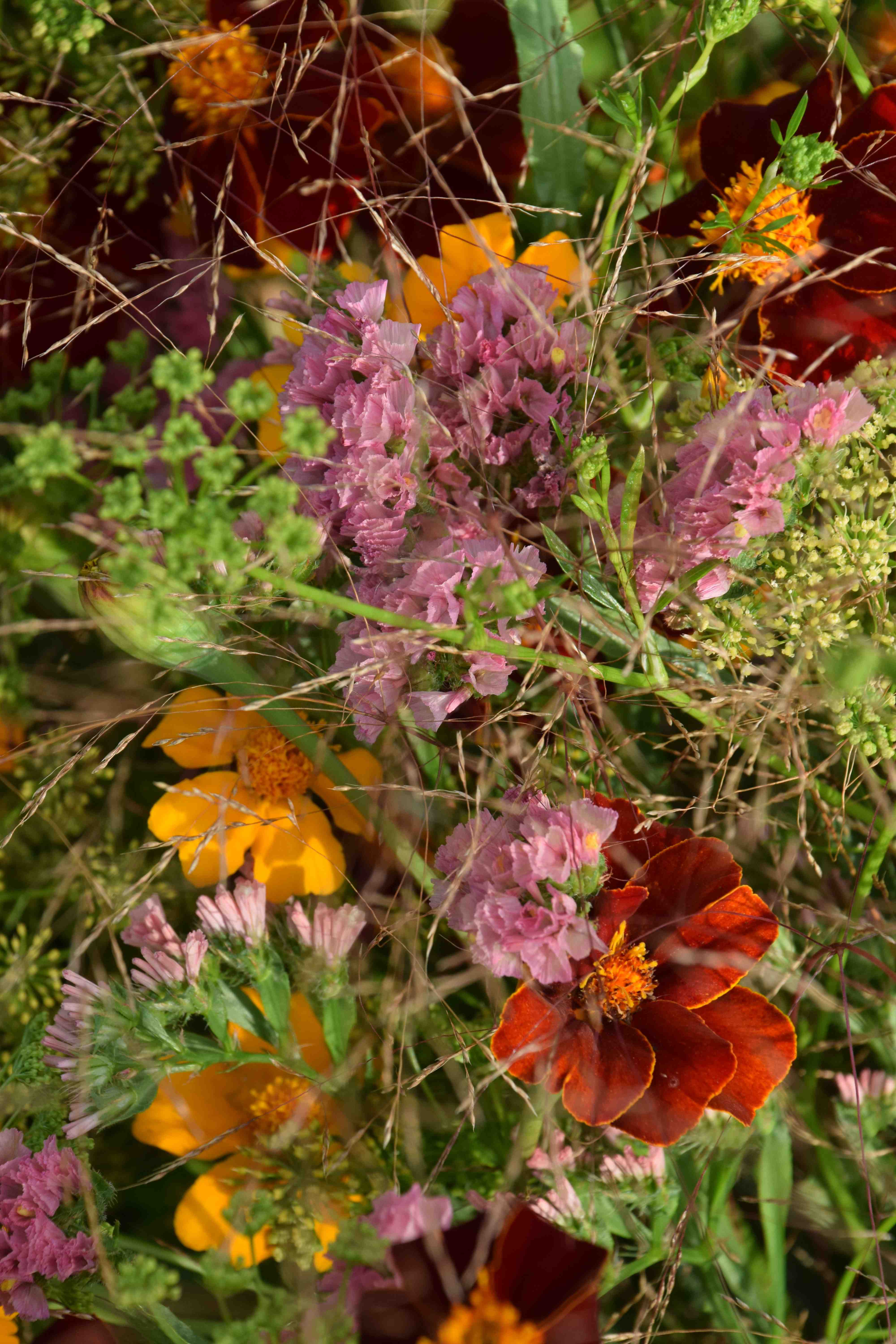 The bunch is a bit odd in that it is all small flowers and the statice is, I suppose, a bit on the pink side but it does pick up on the sheen on the grass so works in a way.