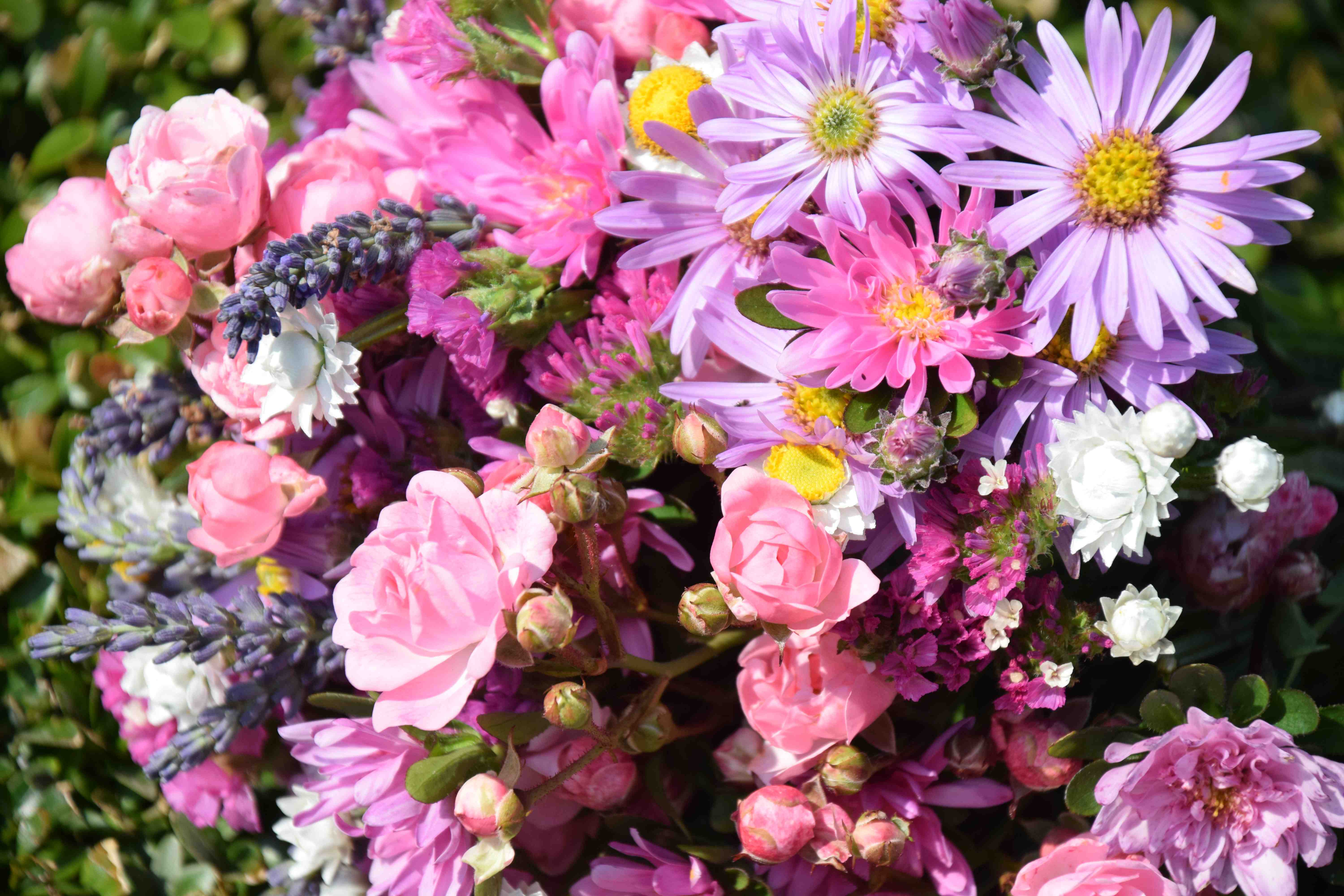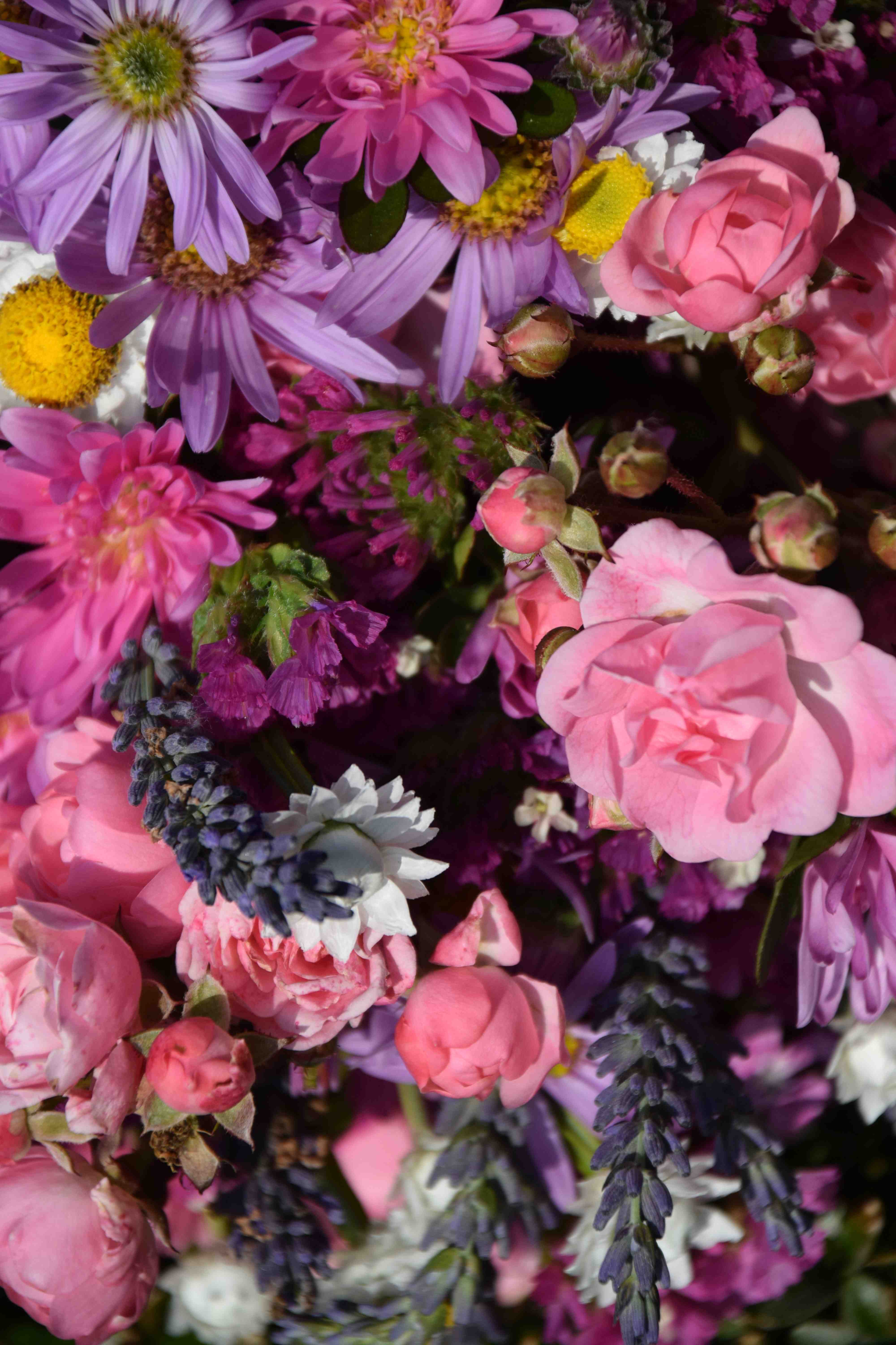 This week I managed to pull together a few pink bunches that made a change from all the autumnal shades. With a bit of picking over a few sprays of ‘The Fairy’ made a good basis to this bunch. I filled it out with some pink statice and, as the flowers have white flowers within the pink petals, some tightly closed ammobium (not showing their golden centres) picked up on their whiteness. More pink came from callistephus (China aster) ‘Nina Pink’. This is a lovely plant with dozens of small flowers on bushy plants. The only problem with it, for cutting, is that it branches all up the stems so that if you want long stems you have to waste lots of unopened buds – its nice though. Aster (true perennial) amellus ‘Pink Zenith’ is a great border plant but, when you put it with true pinks you realise just how close to mauve it really is. Because I had included some ‘blue’ into the bunch I decided to add a few stems of lavender which suited the aster and added some fragrance – useful because ‘The Fairy’ is more or less fragrance free.