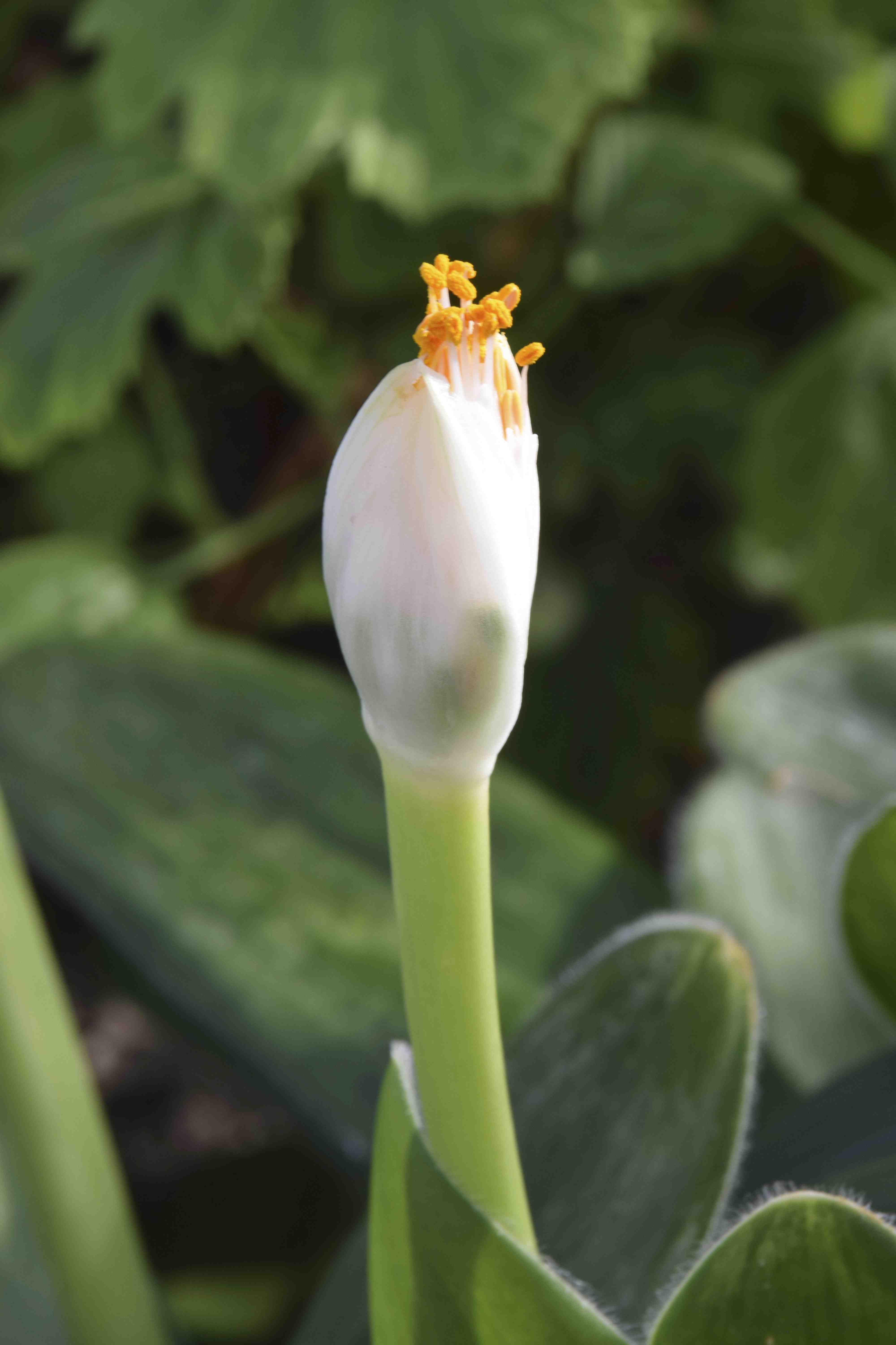 When happy and settled the plants produce their distinctive flower heads. Most haemanthus have showy clusters of bright flowers surrounded with large red bracts. But in this species the flowers, composed largely of white, gold-tipped stamens open as a tuft, with small, white bracts and they resemble a shaving brush. The flowers are usually produced in winter but they can occur whenever the plants feel like blooming. This plant at Glasnevin had two flower spikes in October.