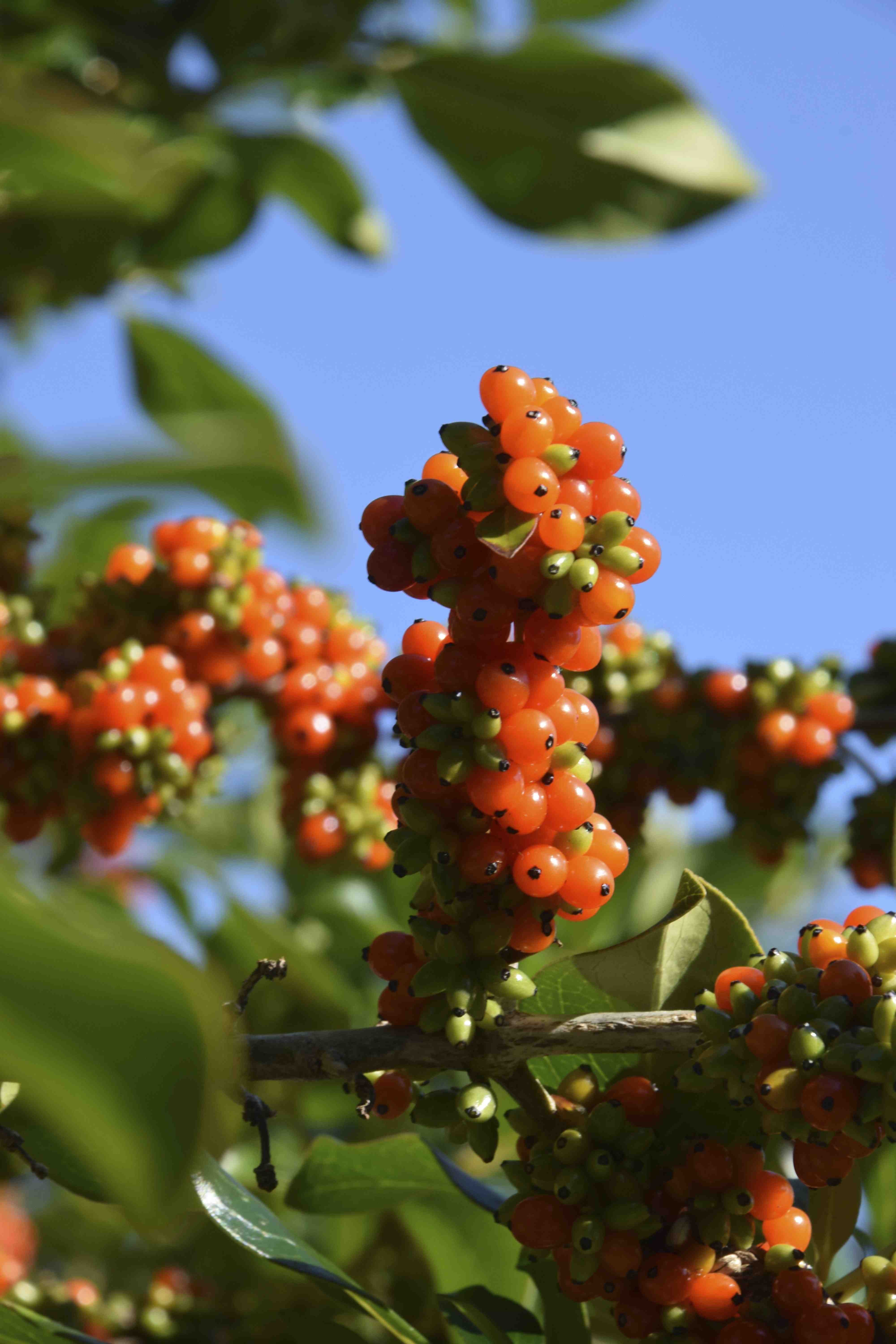 Oddly, the first I ever grew were some seedlings of C. robusta which is a very different plant. Coprosmas are in the family Rubiaceae which is not very important in temperate gardens but best known for being the family that contains coffee. The name ‘coprosma’ means ‘smelling of dung’ and the leaves of some species apparently smell unpleasant. Coprosma robusta is a large, bushy shrub with green, rather ordinary leaves. Like all coprosma, the flowers are dull and have no significant petals but the grey stamens are long and pendulous and while not exactly showy cannot be missed because the whole plant is covered in them (on male plants), almost as though covered in ash or cobwebs. The flowers are not the reason to grow the plant though, but the berries, on female plants, which are ridiculously abundant and although small, are carried in dense clusters and plaster the stems with orange fruit. Plants will grow and fruit better in full sun and will grow to 3m or more but can be lightly pruned to control their size.