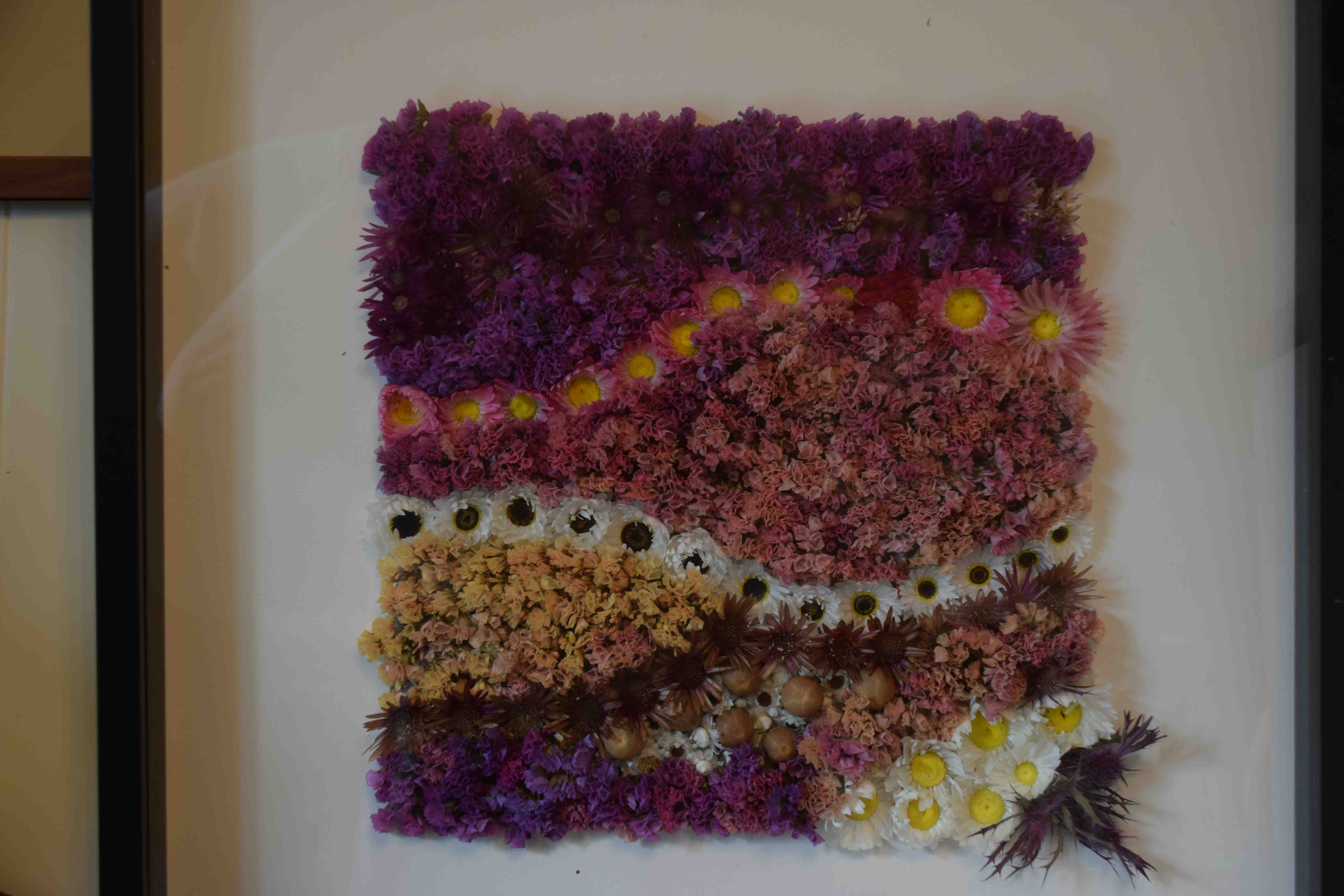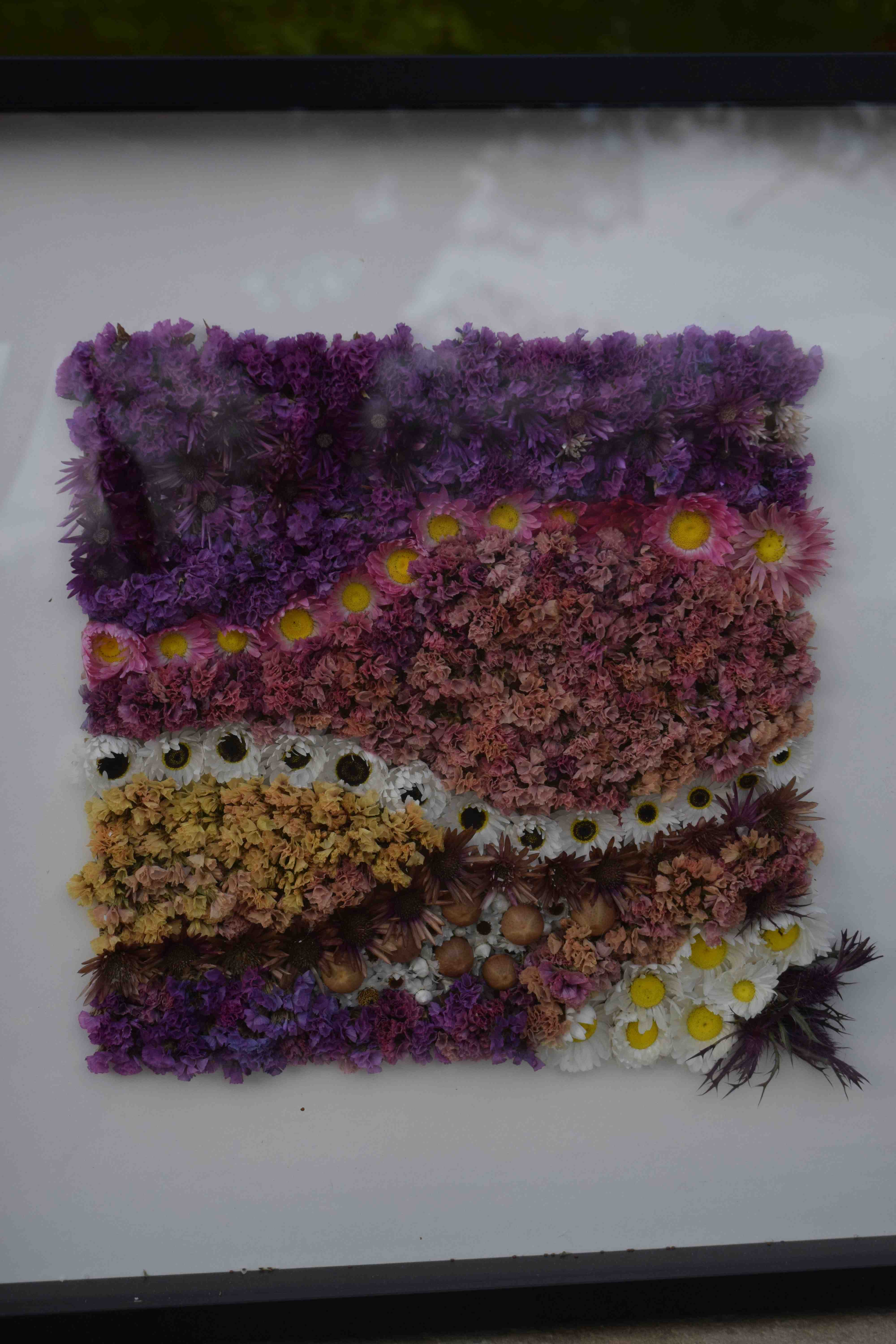 Starting from the top, the rows are purple statice, xeranthemum, statice, pink rhodanthe, statice, white rhodanthe, rather past it xeranthemum, statice, with a group of ammobium and nicandra pods (taken out of their calyces), white rhodanthe and Eryngium leavenworthii.