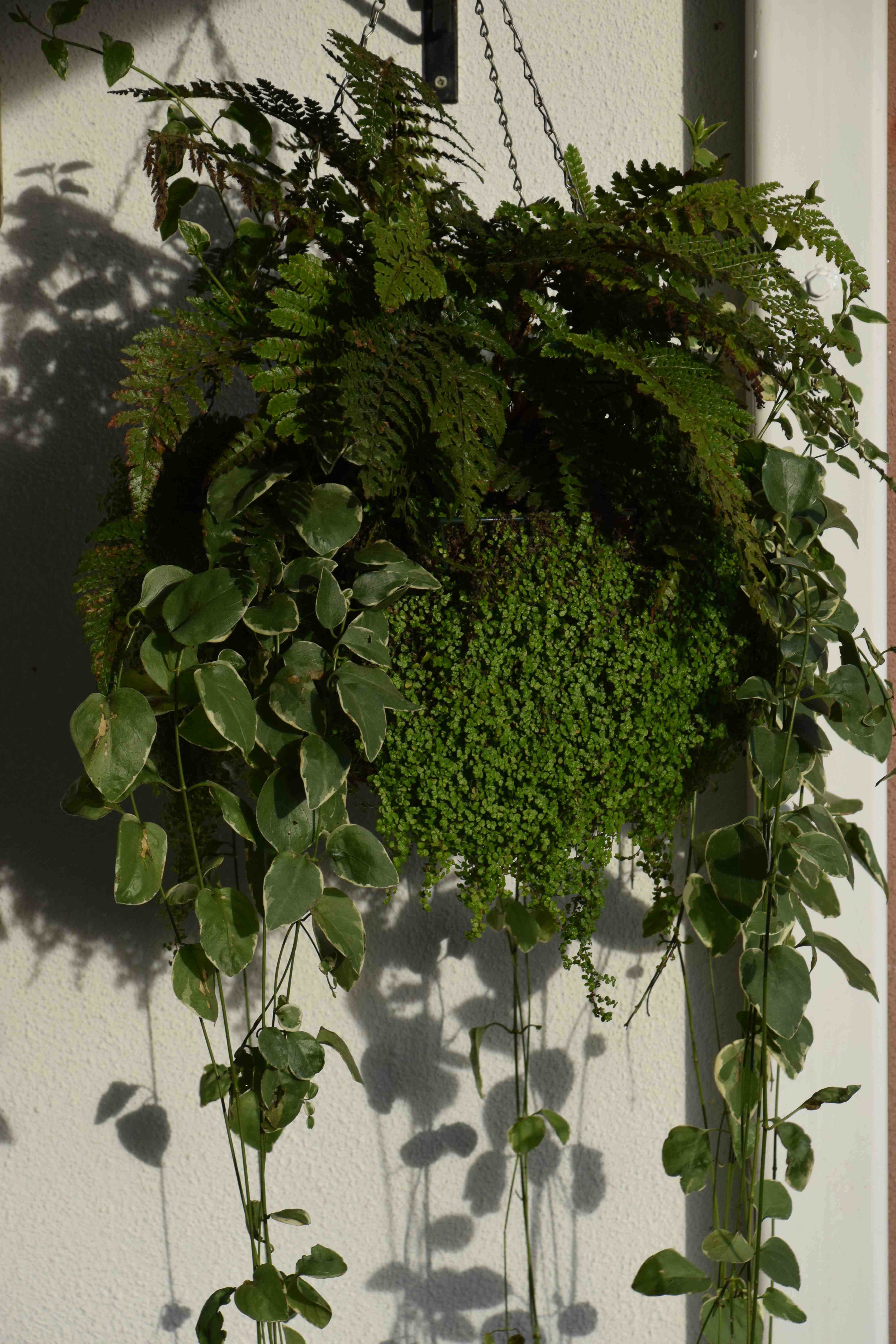 But back to the garden, mind-your-own-business is rampant in the garden, tucked into the base of the box hedges and laying in wait to make a dash for it across the gravel paths if I turn my back on it. Every now and then I have to clear it away. This spring I needed to make some hanging baskets for an outside area that gets no sun (except in winter when the low sun casts an hour of sun on it). It also gets no rain.