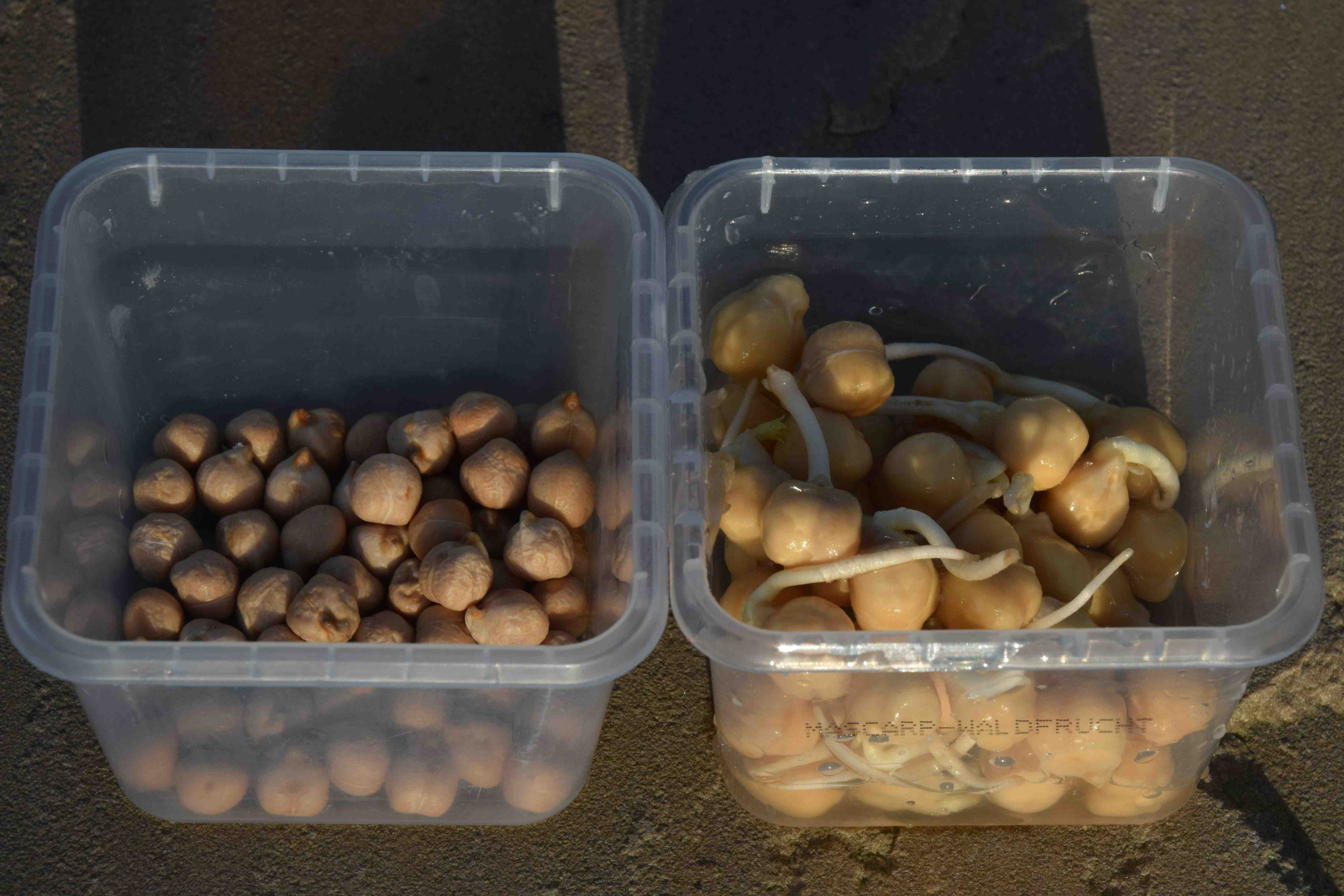 The biggest surprise when I was experimenting, was how good chick peas are. They also taste of peas. They are the easiest to grow because they are big and you can rinse them and strain out the water with your fingers and then put the lid back on the jar. It is worth soaking them for 12 hours at the start and then rinse and drain them. They are ready when the roots are 1cm long. Leave them longer and they become bitter. They are nice enough to eat as they are as snacks. They are cheap to grow – just buy a pack of dried chick peas from the supermarket. The third good sprout is lentils. Again these are cheap because you can buy a pack of green or puy lentils from the supermarket. Again they are best soaked for 12 hours and then rinsed and strained. Then rinse twice a day. Do not use orange, split lentils or split peas. Ready after about 4 days they have a slightly peppery taste. * Some people have problems eating raw pulses so be a bit cautious before eating large amounts of chick peas or lentils if you get indigestion eating raw peas or beans.