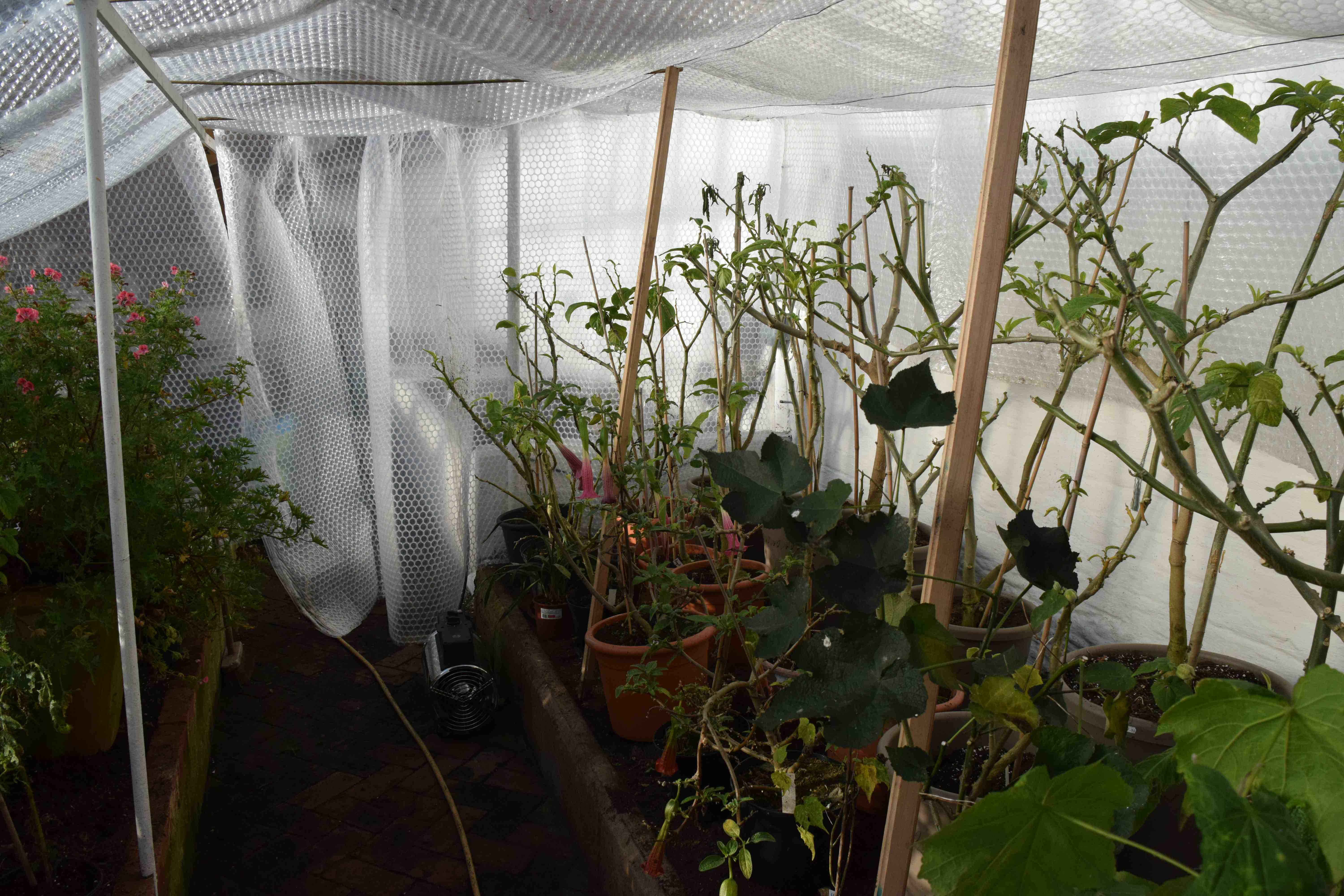 The bubble polythene will be taken down in late March or April, depending on weather conditions. Because it affects the ability to ventilate effectively temperatures can soar by then and it can be as harmful to the plants as winter cold.
