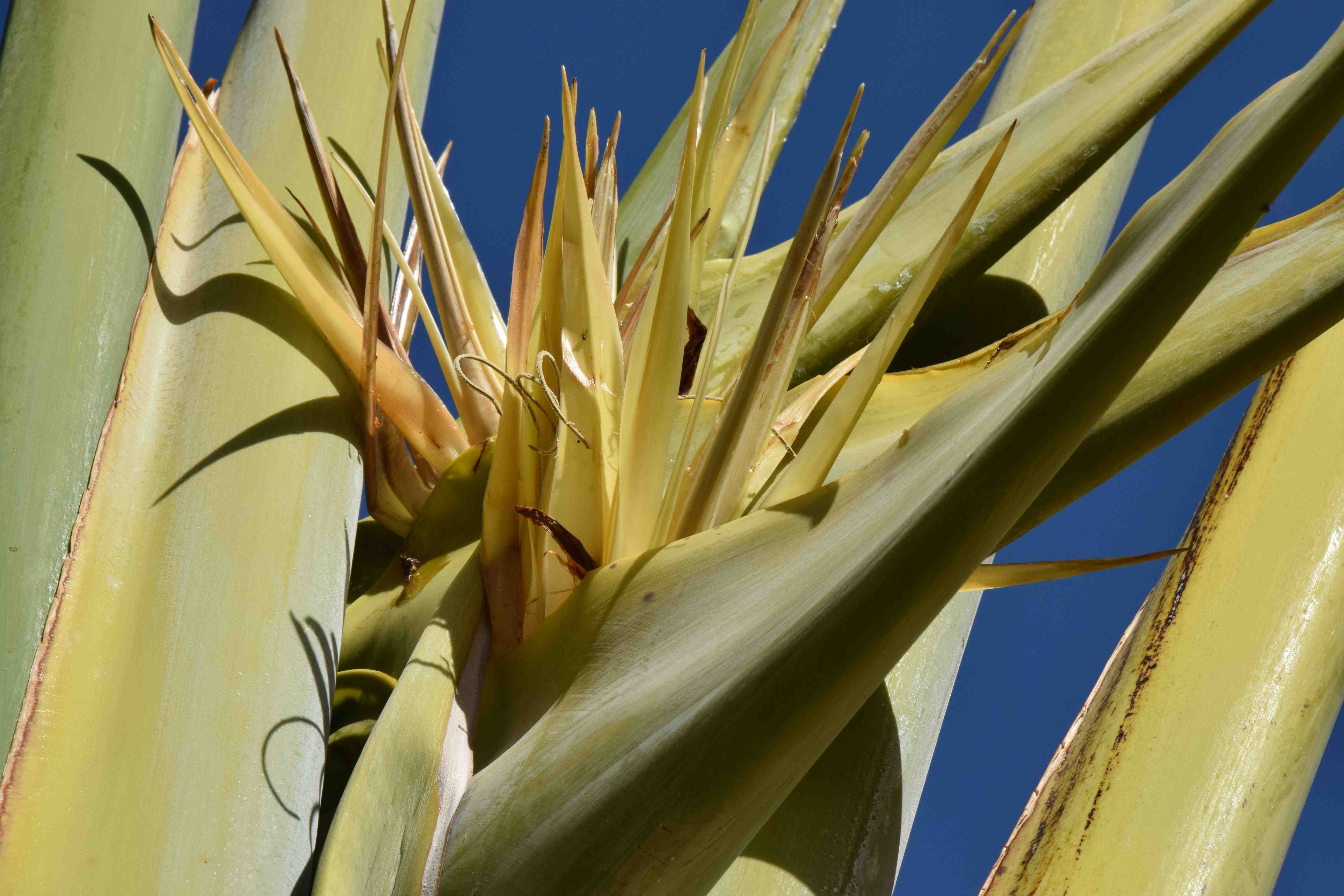 In suitable climates this plant can grow to 15m in height and produces up to 15 leaves a year – it is, of course, evergreen. I suspect that the flowers are produced all year and they open in a series of beak-like bracts, one emerging from another.