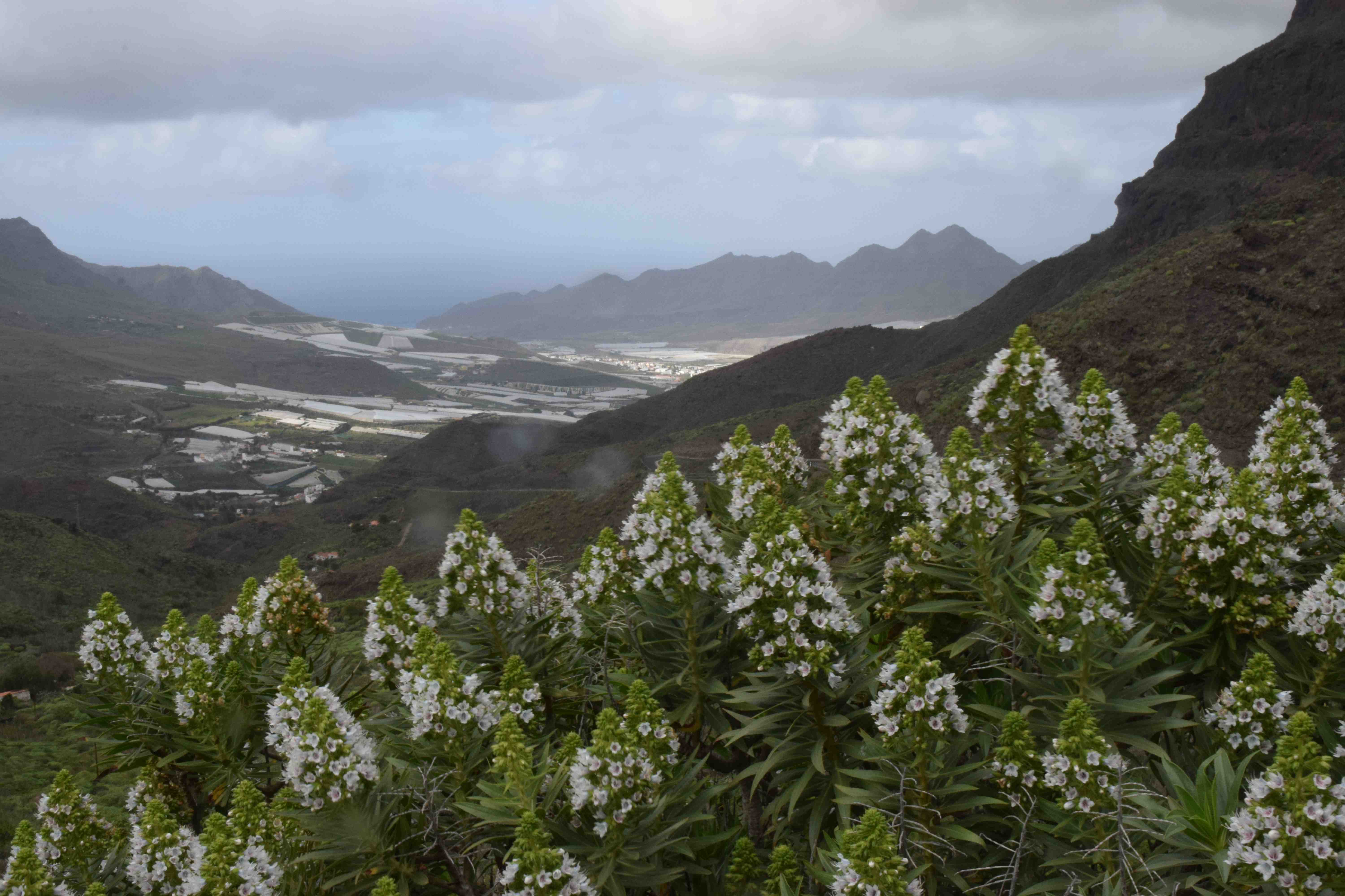 The Canary Islands are famous for echiums. The best known are the towering E. pininiana from La Palma and the beautiful red-flowered E. wildpretii from Tenerife. But there are many others and the west side of Gran Canaria is the home of E. decaisnei (although I think it is also found on other islands). It is a perennial, shrubby echium to about 1.5m high and grows on slopes and cliffs and in recently disturbed soils beside roads at cooler elevations. The flowers are white but there is pink or blue in the throat that must tell pollinators the age of the flowers or, perhaps, if the flowers have been pollinated. Echiums are in the Boraginaceae and a feature of many of the genera is that the flowers change from pink to blue – think pulmonaria and myosotis. This is another plant that would be a good addition to frost-free gardens – oh to live in San Francisco!
