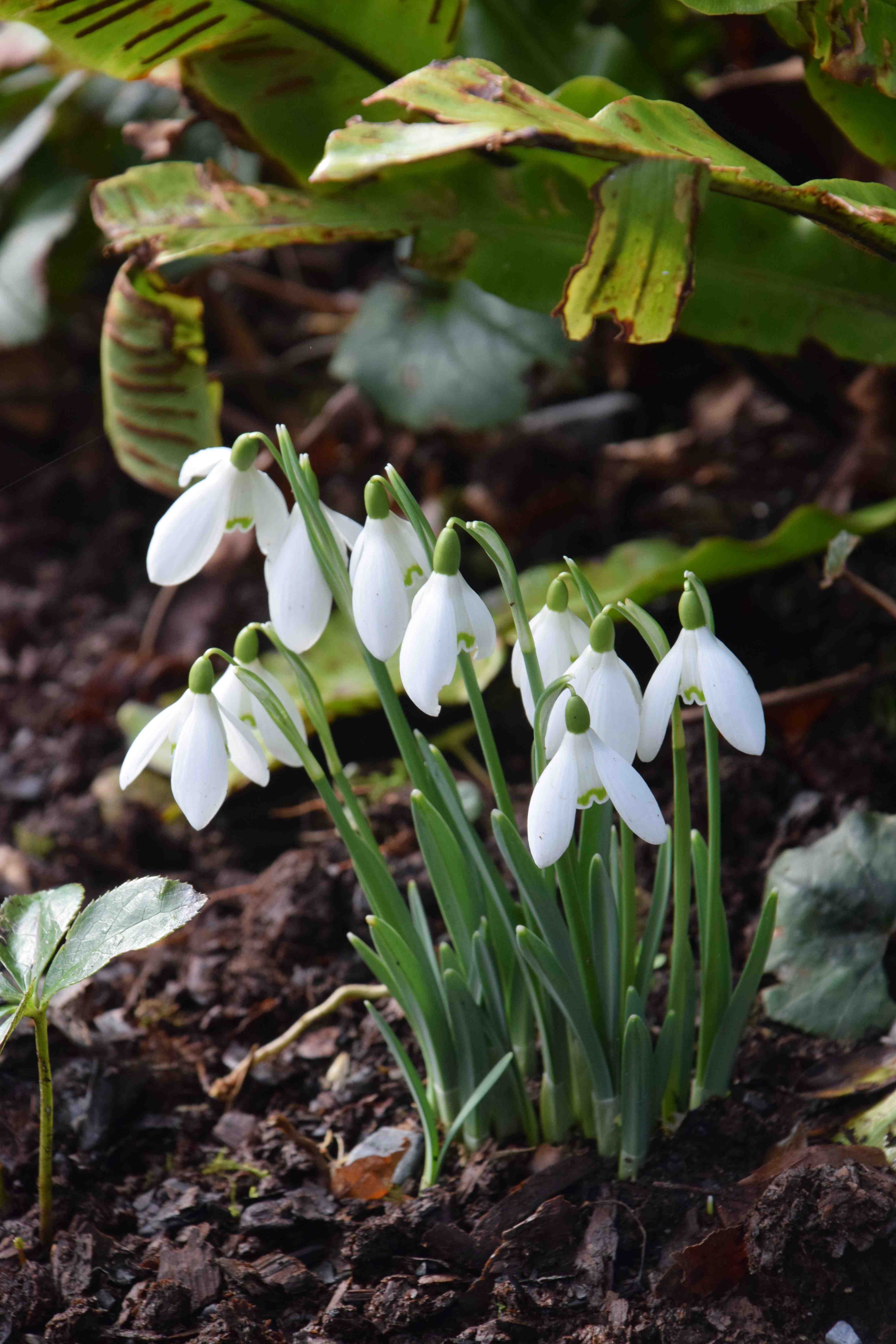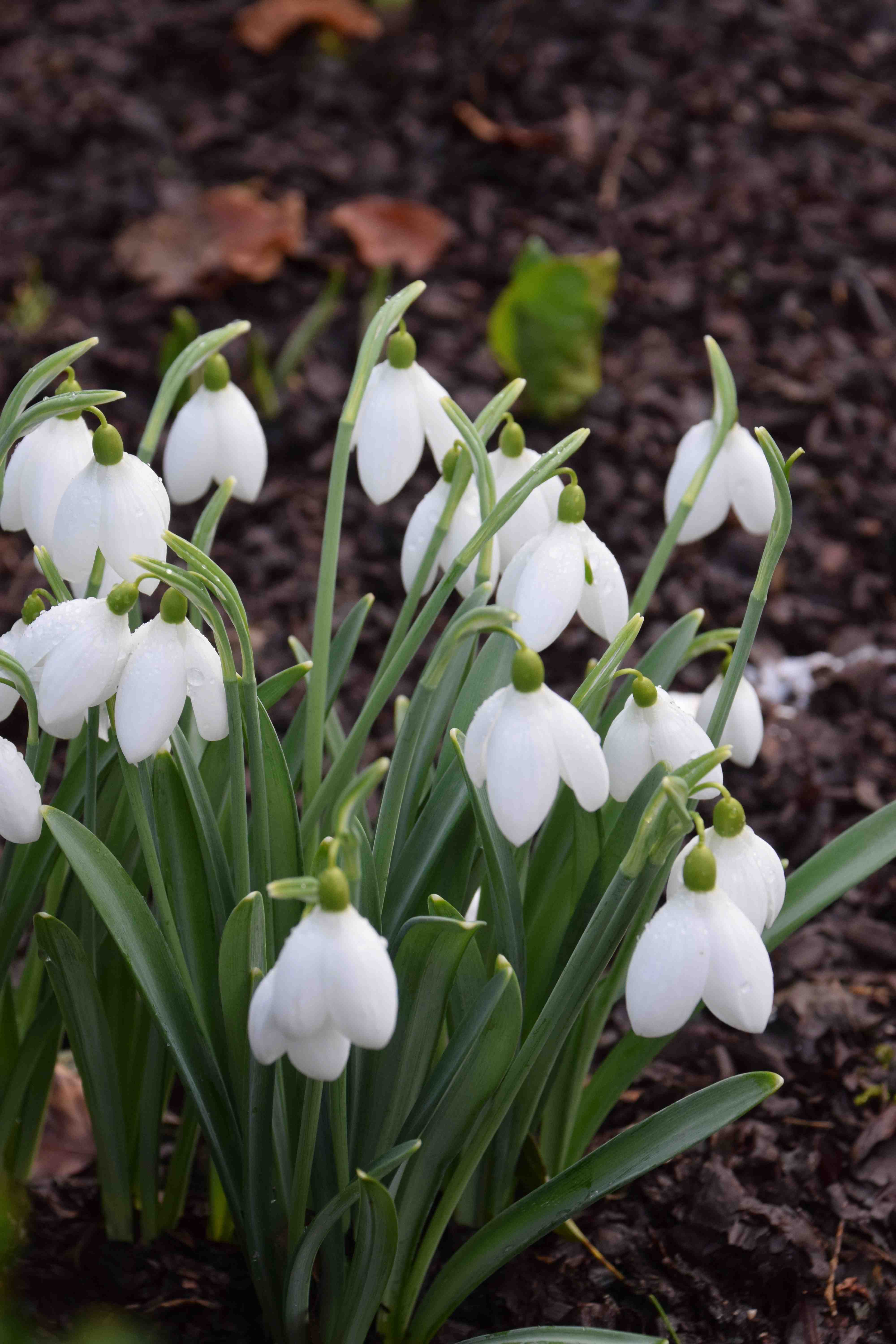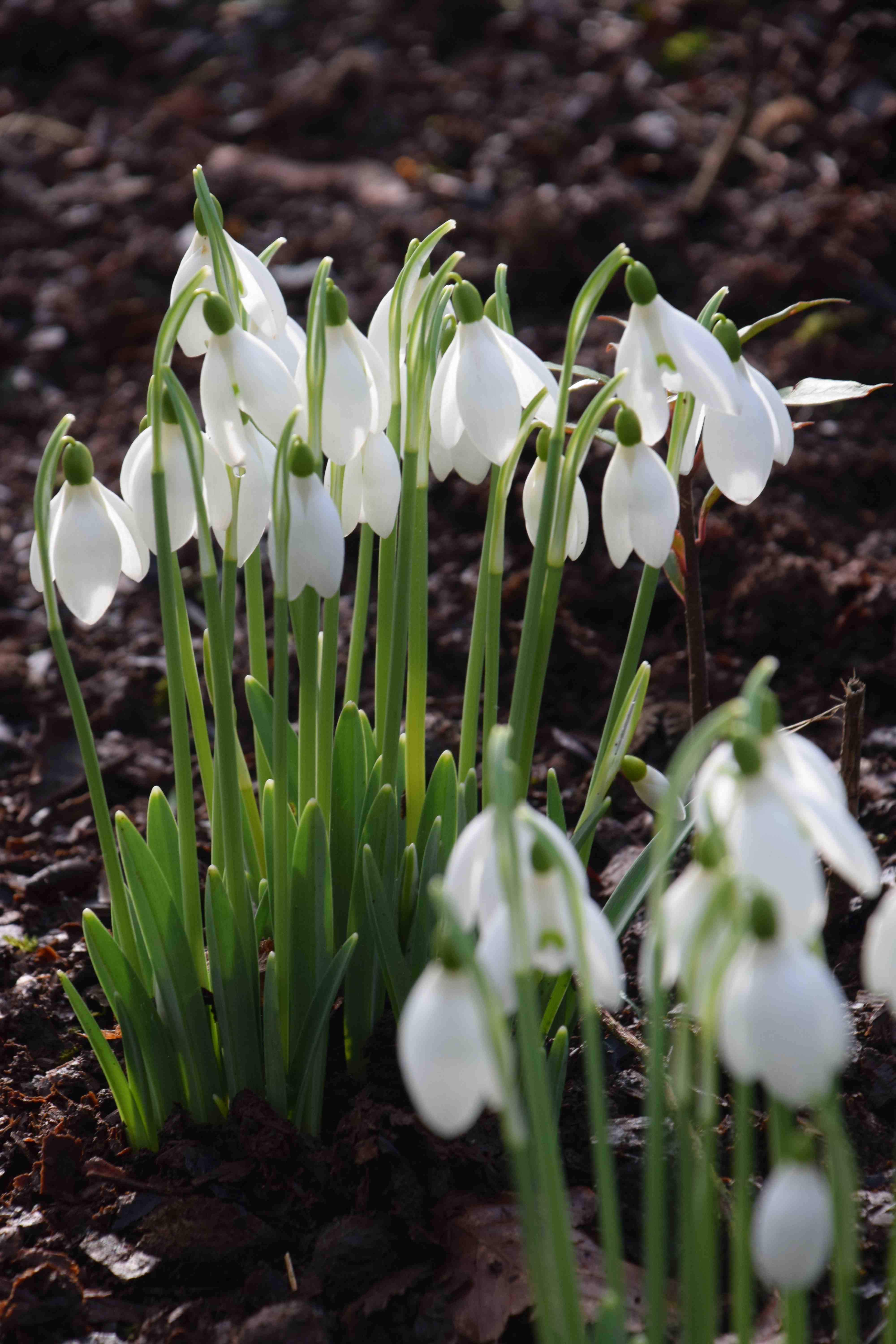 Most of the snowdrops are in the rose beds that run from the house to the lake and around the neighbouring lawns though it looks as though new plantings are being established in other areas. It is a lovely garden and they really go to town on the snowdrop week. Most of the beds are mulched with cocoa shell which is a useful product because it ‘binds’ when wet and its dark colour makes a good foil for the snowdrops. Talking of which…