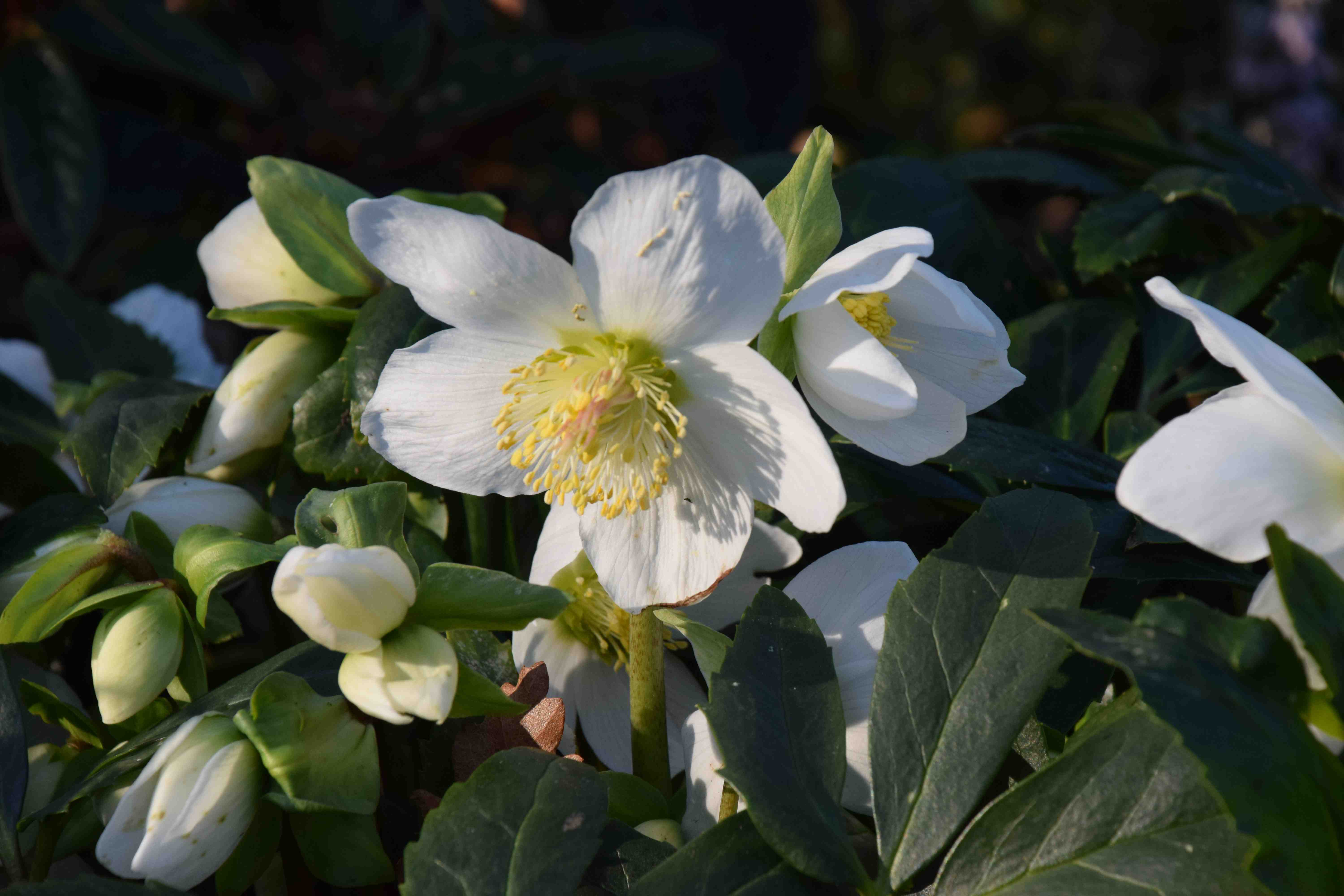 Since November there have been a few flowers but now the plants are going crazy with dozens if not hundreds of buds pushing through the dense, healthy, dark green leaves. Perhaps, after decades of trying to get the conditions right I have finally managed to get it right. Whether it is the masses of humus, the shady spot or the lime from the mushroom compost I do not know but I am grateful.