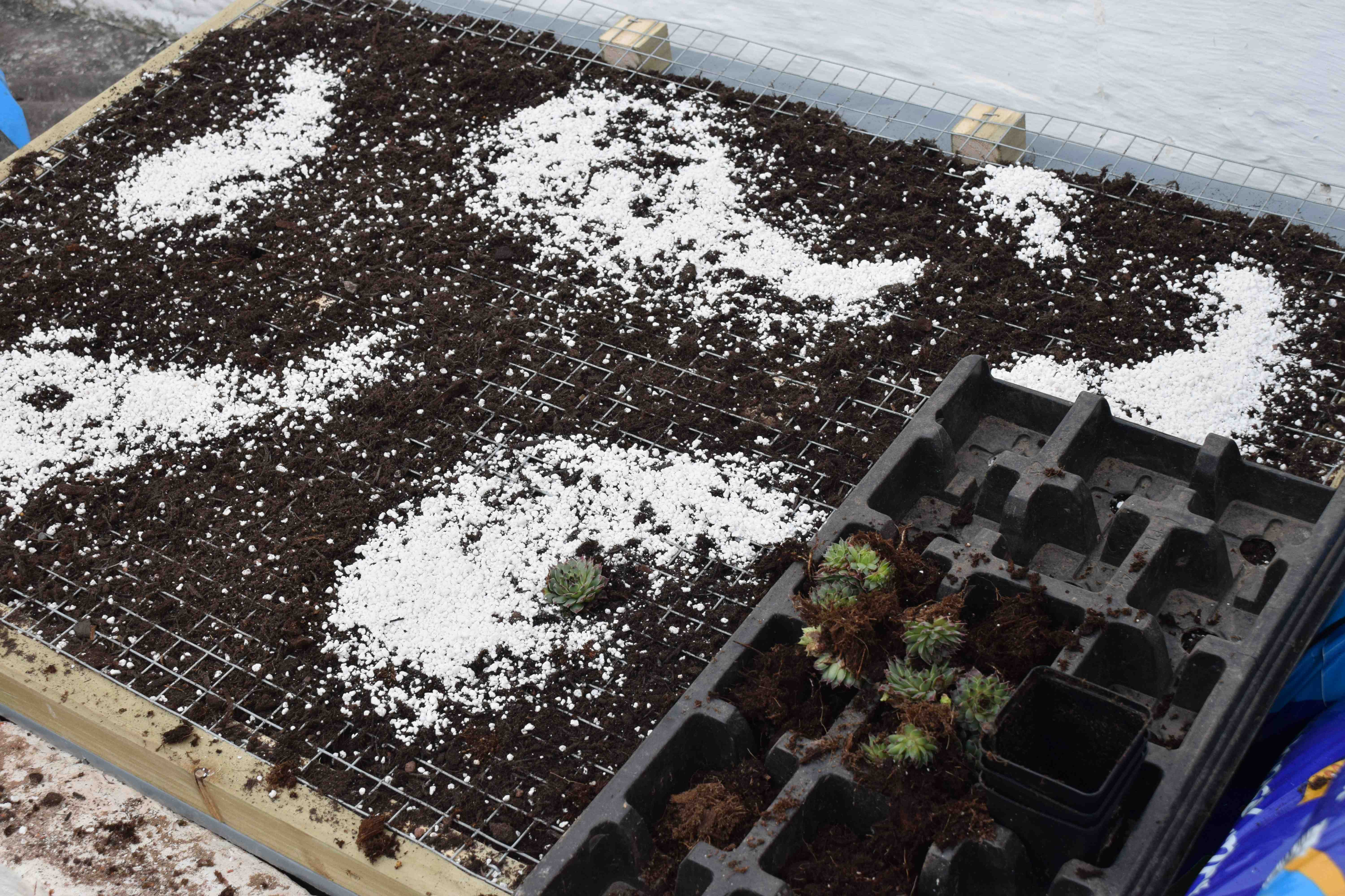 I am trying a few new projects, in between the barrowing of muck and the manic seed sowing, and one of these is to make a living picture, to hang on a wall, with succulents. The project is not complete but I thought I would show the early stages. The picture is about 1.2 x 1m in size and the first job was to make the structure to be planted. The marine ply back was covered in a plastic sheet and then a frame of timber about 3cm square and this is covered in stout wire mesh with holes about 2.5cm square. Once made it was ‘filled’ with compost – a mix of multipurpose with some loam and perlite and with some controlled-release fertiliser added. I gave it a good shake and a tap to make sure it was filled as evenly as possible but I am adding more compost as I go along. I thought about the pattern long and hard but decided to use a rough ‘Paisley pattern’ as the scheme and I roughly marked out where the teardrop shapes were to go with perlite.