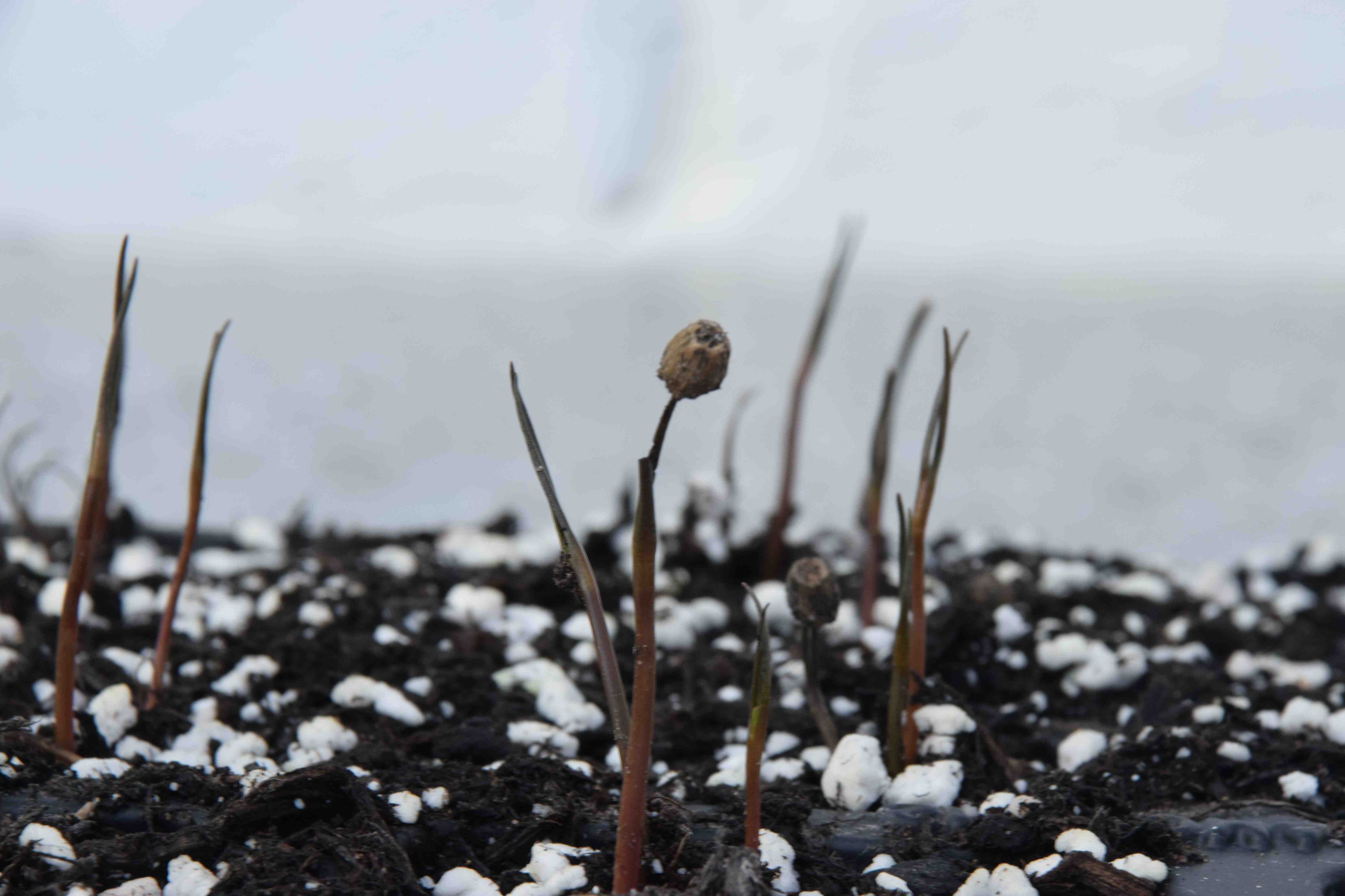 But starting with actually getting it to germinate, the problem is that not only is the germination rate low but the seeds will not grow if the temperatures are too warm. Most seed companies warn to sow it early or in autumn (in a polytunnel). I sowed four seeds per cell and, just over two weeks later the seedlings are appearing. I kept the trays in the unheated greenhouse, kept them moist and so far I have one or two plants in each cell, suggesting a germination rate of 25-50% – so far! I can be that precise because the seeds (or fruits) are large and easy to count out. (as you can see in the image above where the seedling is proudly holding the seed coat aloft)