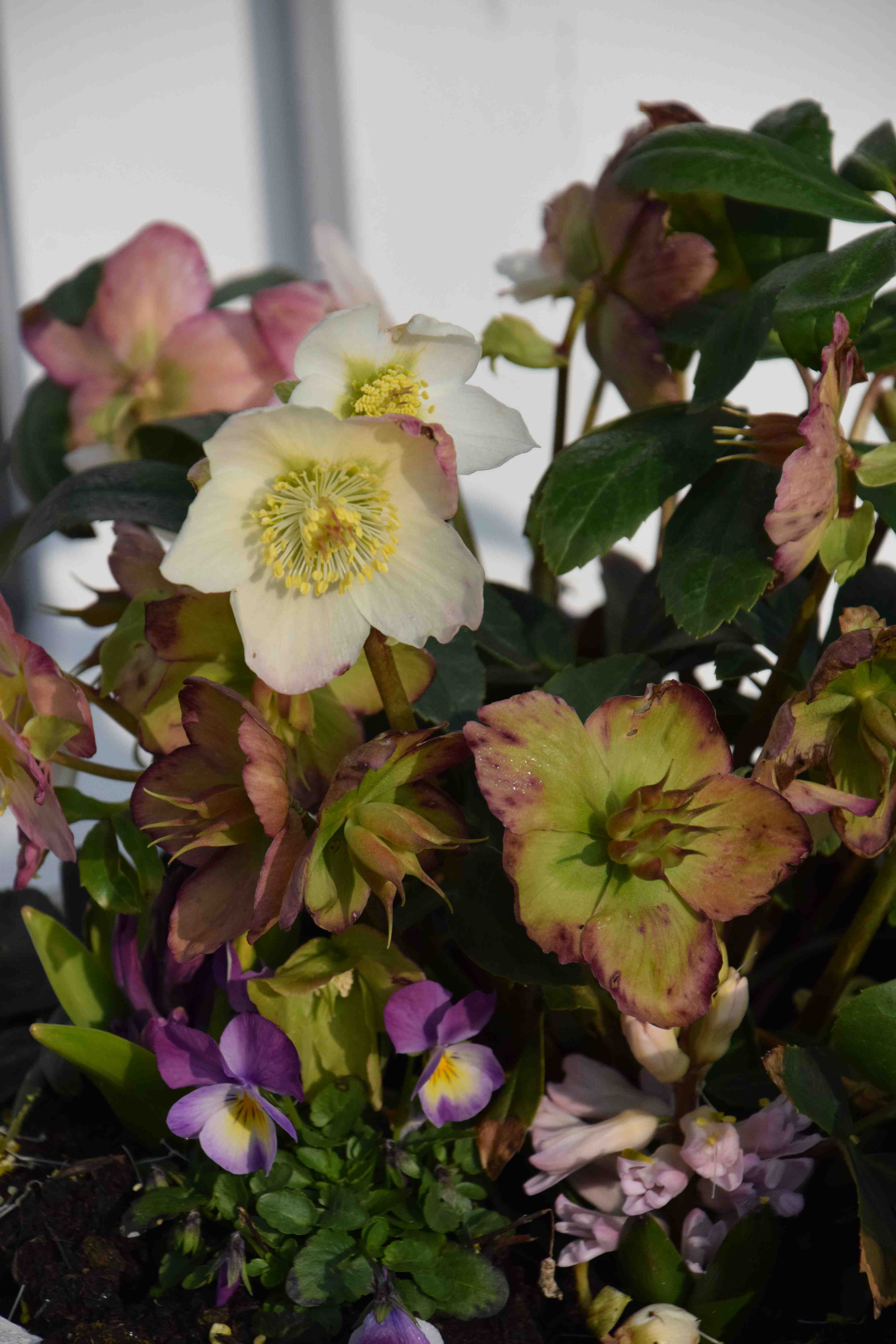 It must have been a week ago that I said ‘no more hellebore posts this year’. So I apologise for this but the two H. niger that I put in two urns together with some violas and hyacinths are looking so nice, even as they fade, that I couldn’t resist breaking my promise! Being in a sunny spot the flowers are a bit more exposed than they would like and so develop a ruddy glow prematurely but it does mean the old, green flowers are stained with red too and they actually look pretty good and the violas pick up the colours nicely. And there is another hellebore coming up in a couple of days too – in a combination. But that really will be the last.