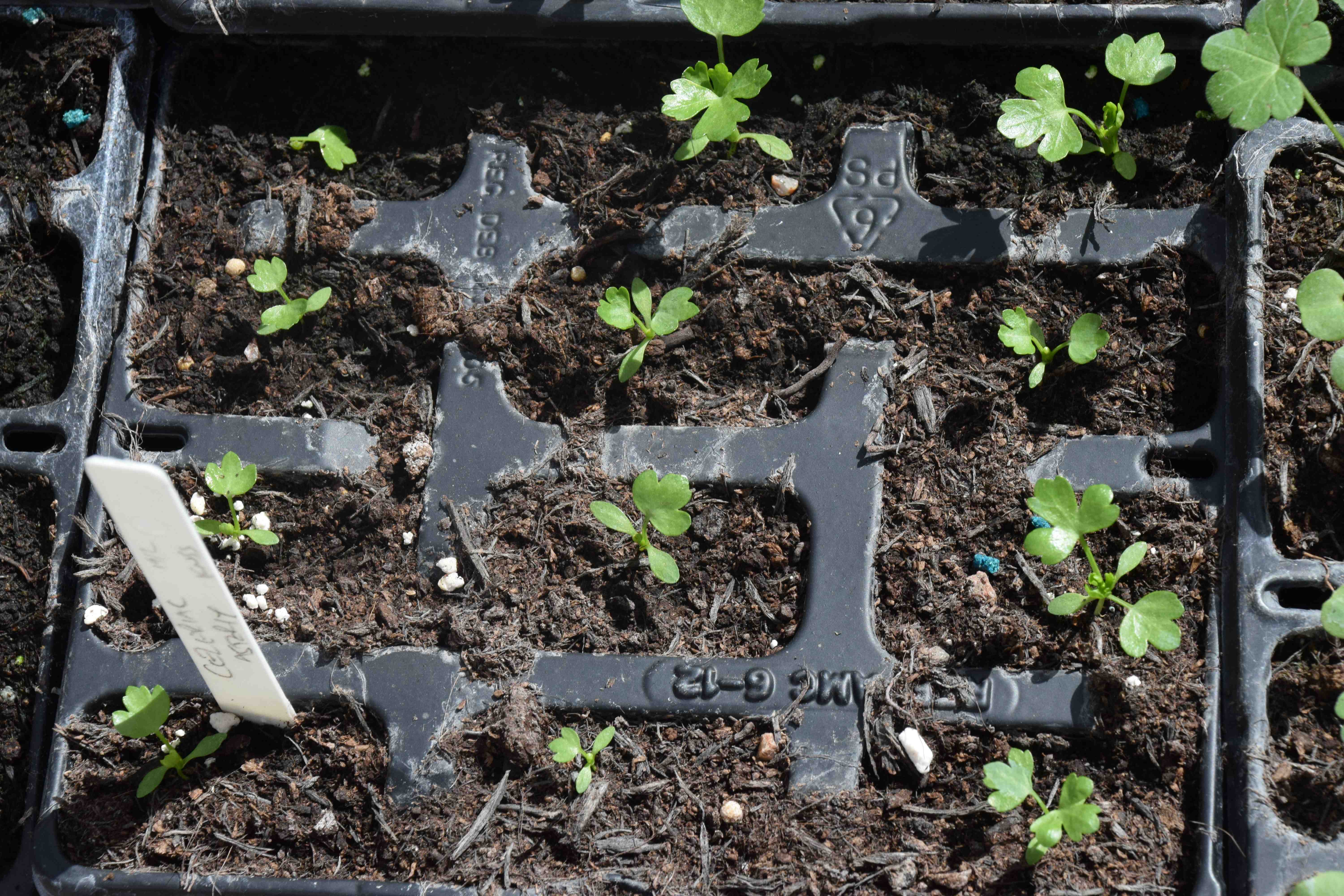 This is a new addition to the garden here but an old friend and one of my favourite geraniums. This is G. pyrenaicum ‘Bill Wallis’. It is a short-lived perennial that usually self seeds and has a loose habit and masses of small, lilac/lavender flowers all summer. It is best in informal situations and these will go in grass in part shade. The seeds were sown in February in a cell tray and kept at ambient temperature (no artificial heat). They were transplanted into these cells a week ago. The white form of the species ‘Celtic White’ is one plant I wish I had not put in the garden and is a *@&&?* nuisance.