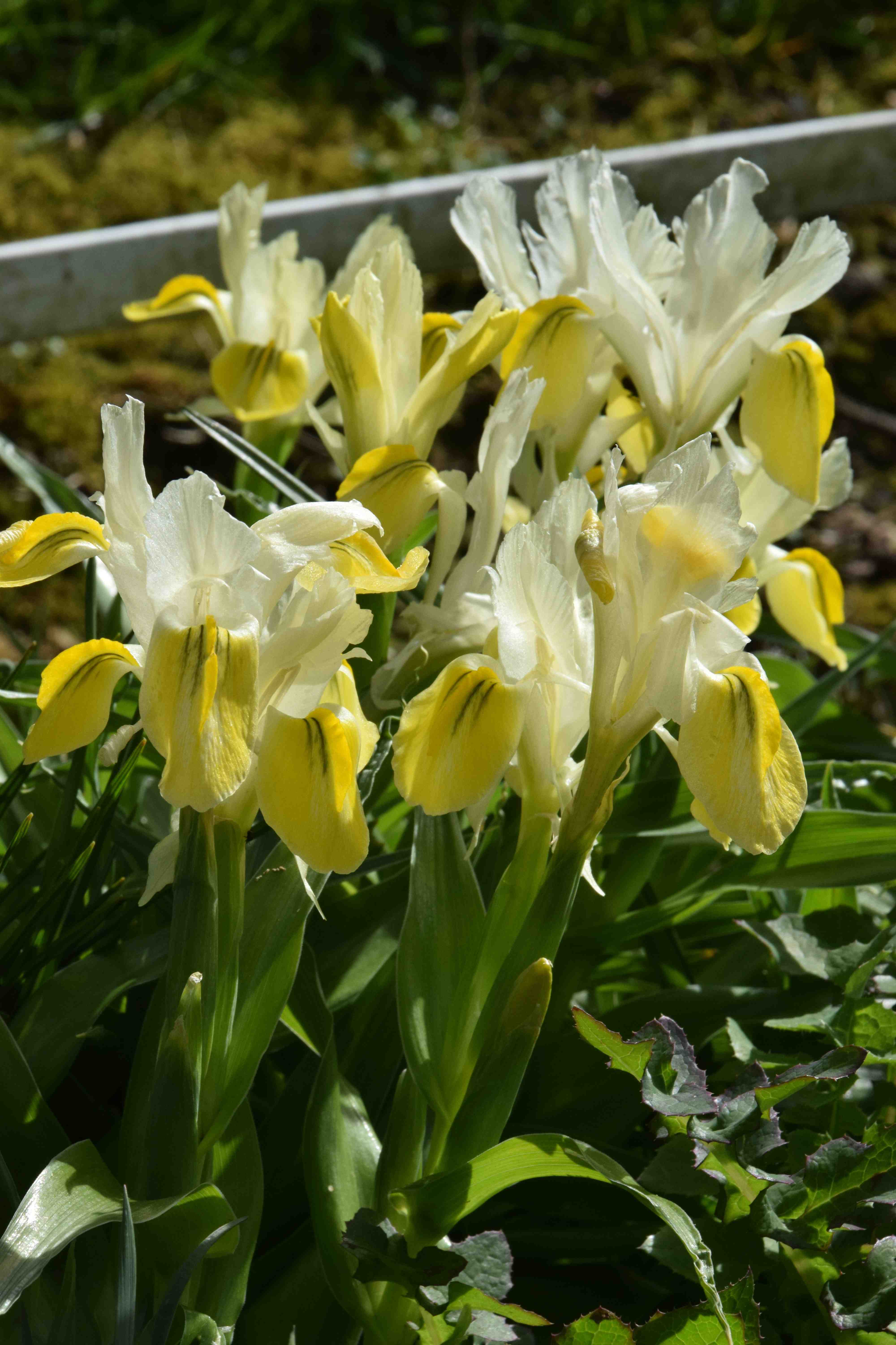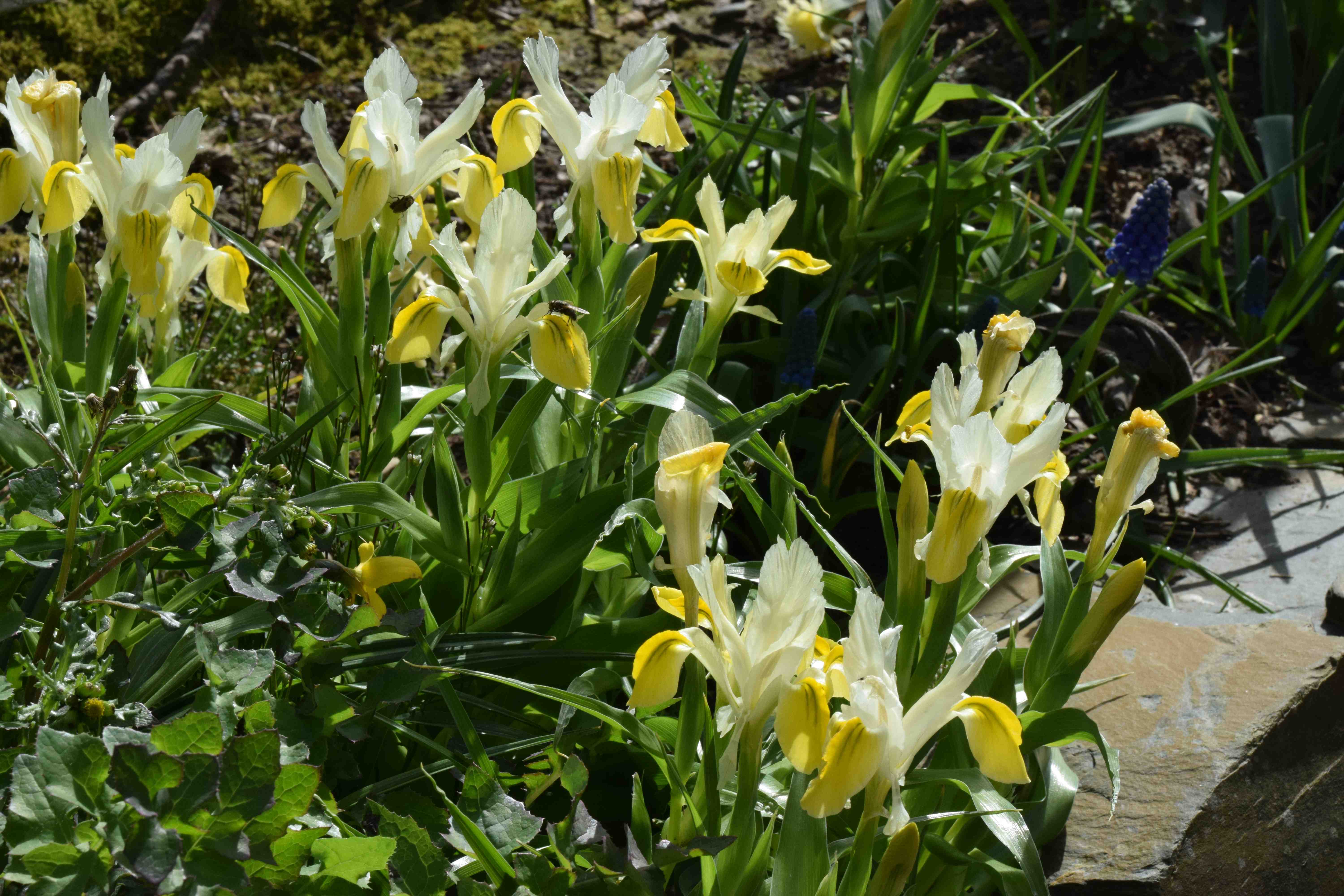 I always look forward to the bearded iris starting to bloom but I don’t want to wish spring away so make the most of what is flowering at each season. But one of my favourite iris is the Juno Iris bucharica. I mentioned this last year when it flowered the first time from the ‘bulbs’ (really fleshy roots and bulbs). The real test was what would happen this year. Junos need well-drained soil and it was winter wet that would be the problem. But they are planted at the top of a dry-stone wall even though the soil behind it is wet and clay. So how would they do? Well I am pleased to say that they have done really well. The individual spikes have a few less buds than last year but the bulbs have increased and there are many more stems than last year.