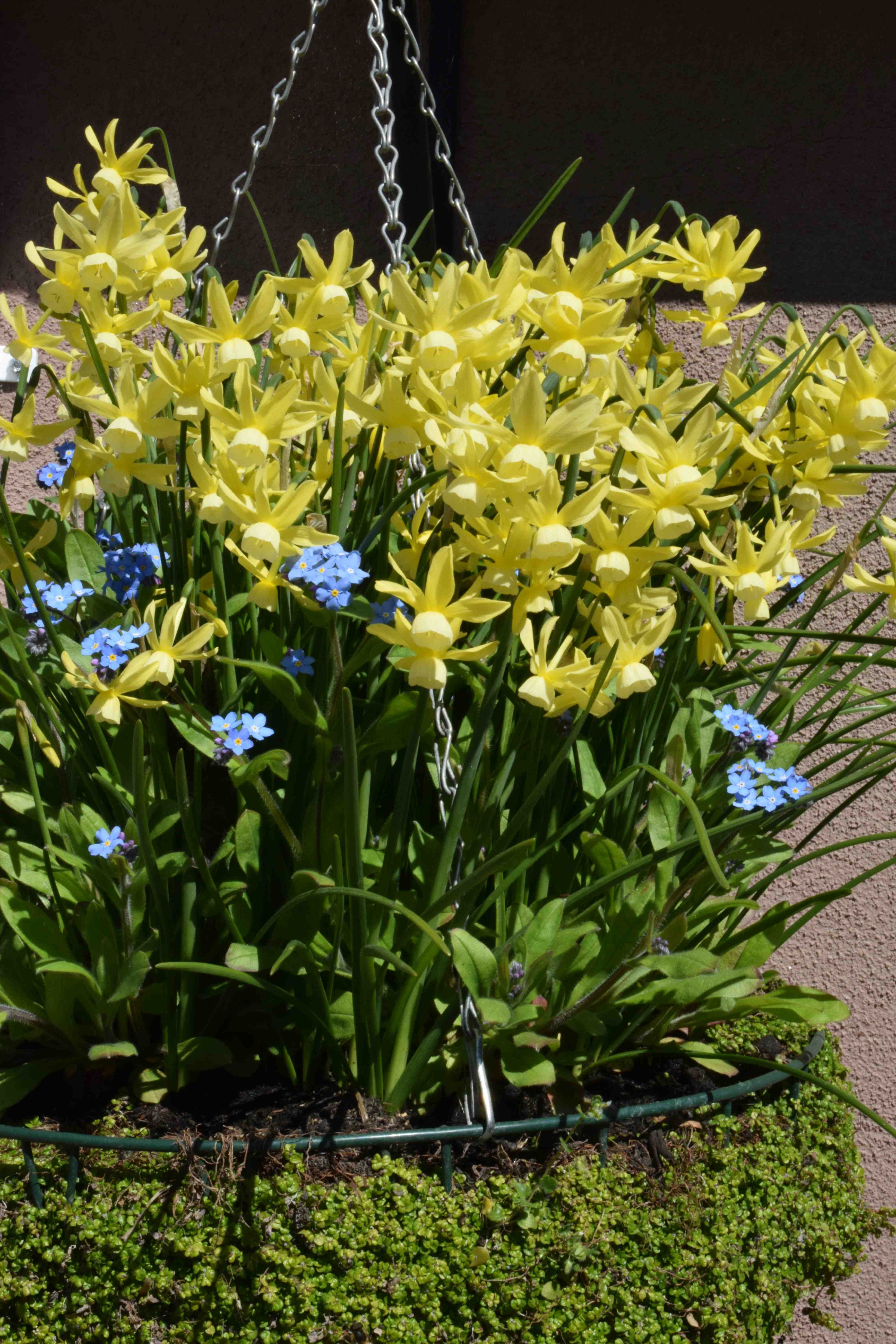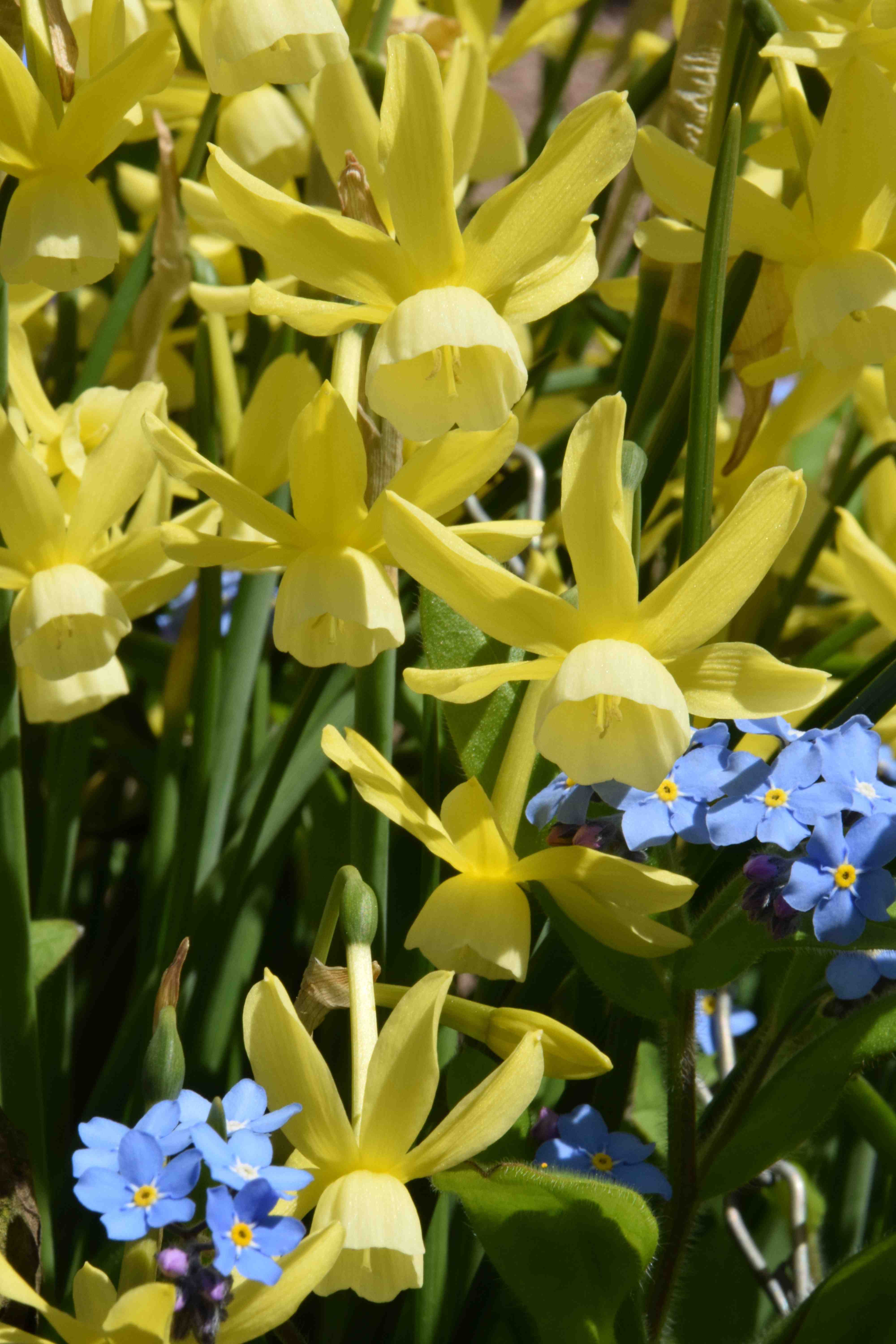 After those two slightly freaky customers we move on to an exquisite beauty. ‘Hawera’ is a well established (old) and easily available daff from New Zealand that deserves a place in every garden. Reaching about 20cm high in flower it likes a bit more sun than most daffs and the small bulbs need planting en masse for best effect. But then the narrow stalks and leaves will almost disappear as the sulphur yellow flowers open. They are elegant but bright and I packed them into a basket with some forget-me-nots and I like the combination. The forget-me-nots are just about managing to flower in time to make a contrast. Oh and it has a moderate fragrance too.