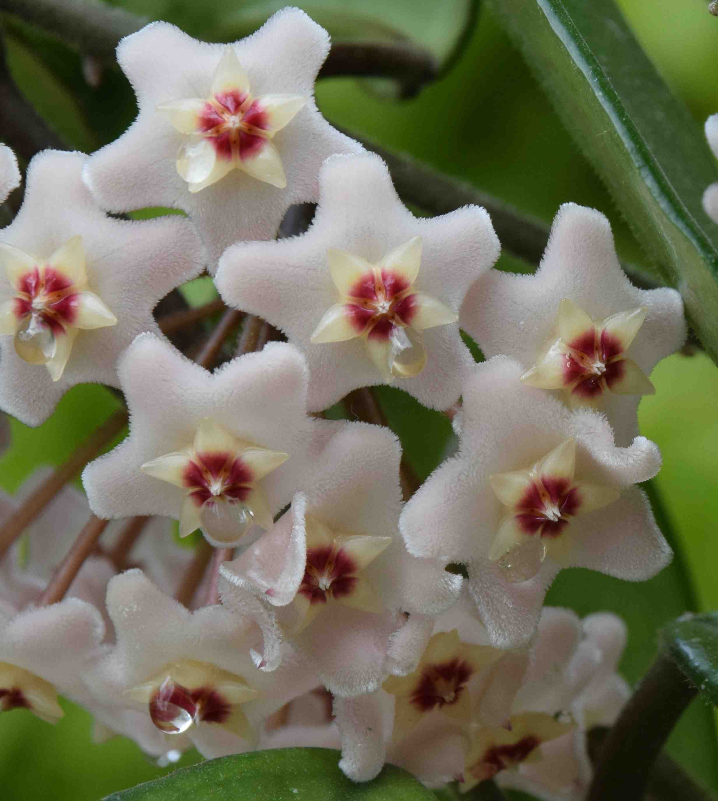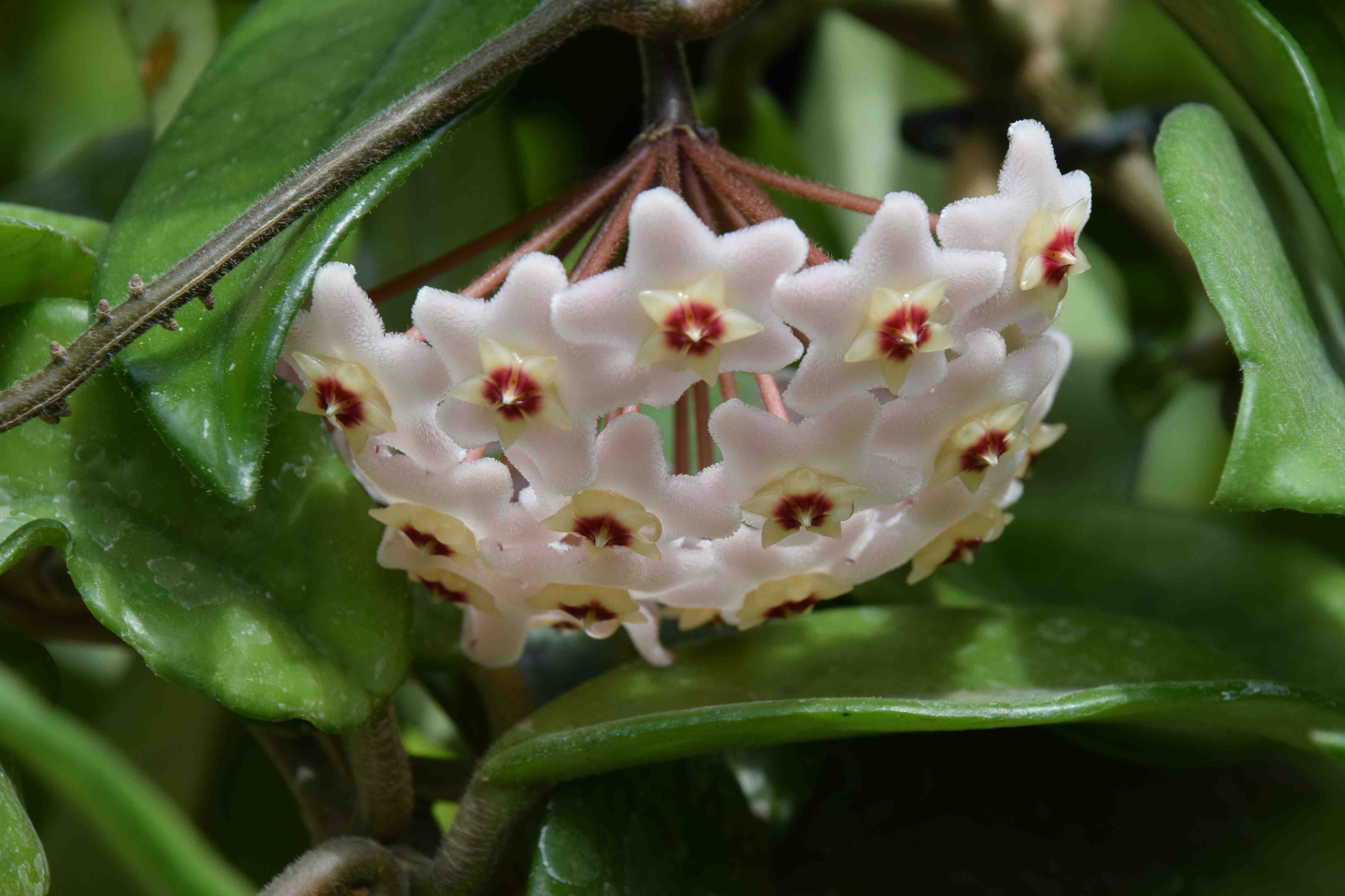 The flowers are white, blushed pink, with a red centre, carried in clusters of 20 or more, and they drip nectar. This is one of the reasons why it is not a perfect houseplant – when the flowers drop they make a bit of a sticky mess so don’t stand it on your aunt’s favourite lace doily. One of the oddities of this plant is that the flower stem (peduncle) that carries the individual flowers, should be left in place once the blooms have dropped because more flowers will grow from it every year. I can not quite decide what the flowers smell of. They are pleasant but sometimes have a spicy note, especially at night, that I won’t quite rave about.