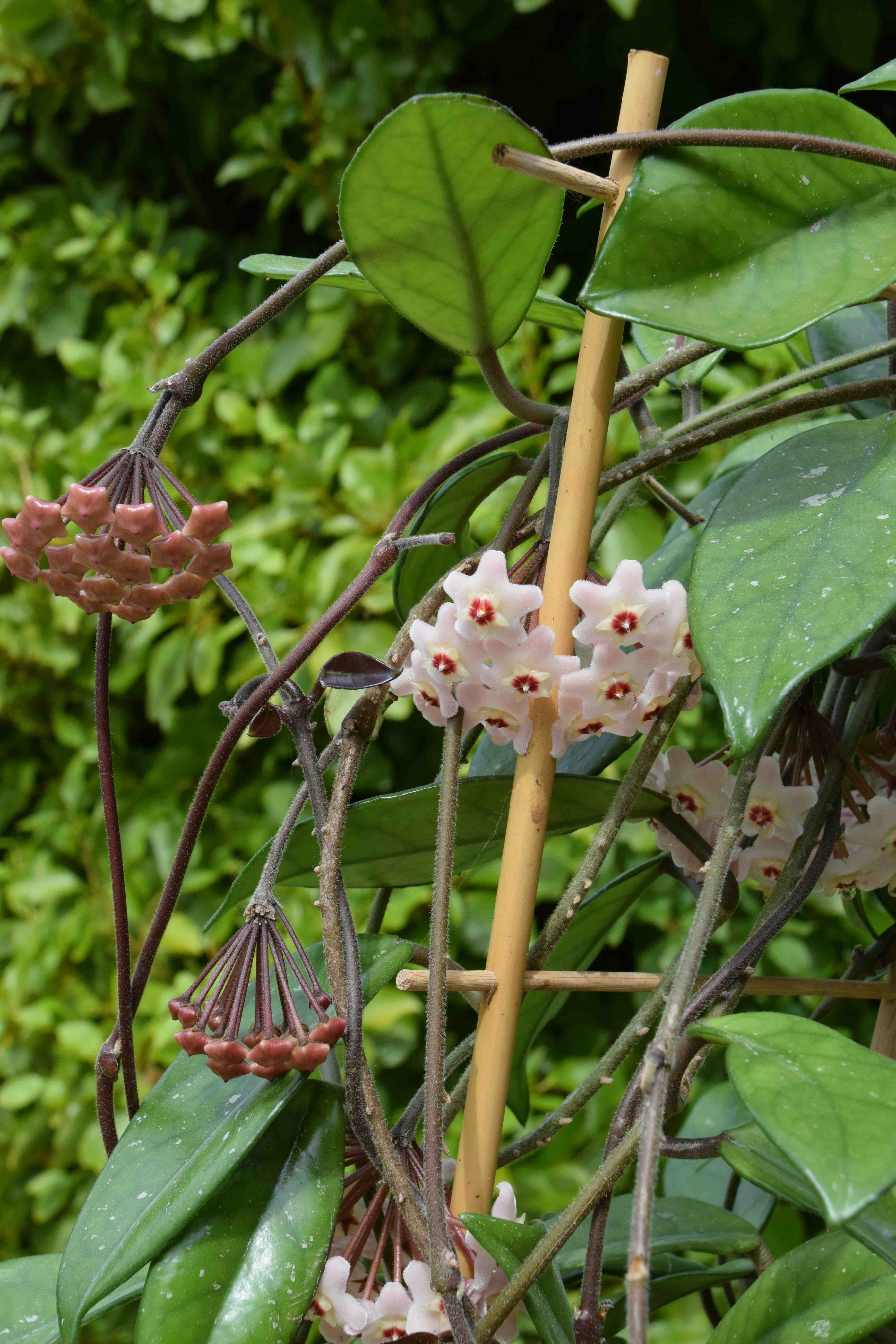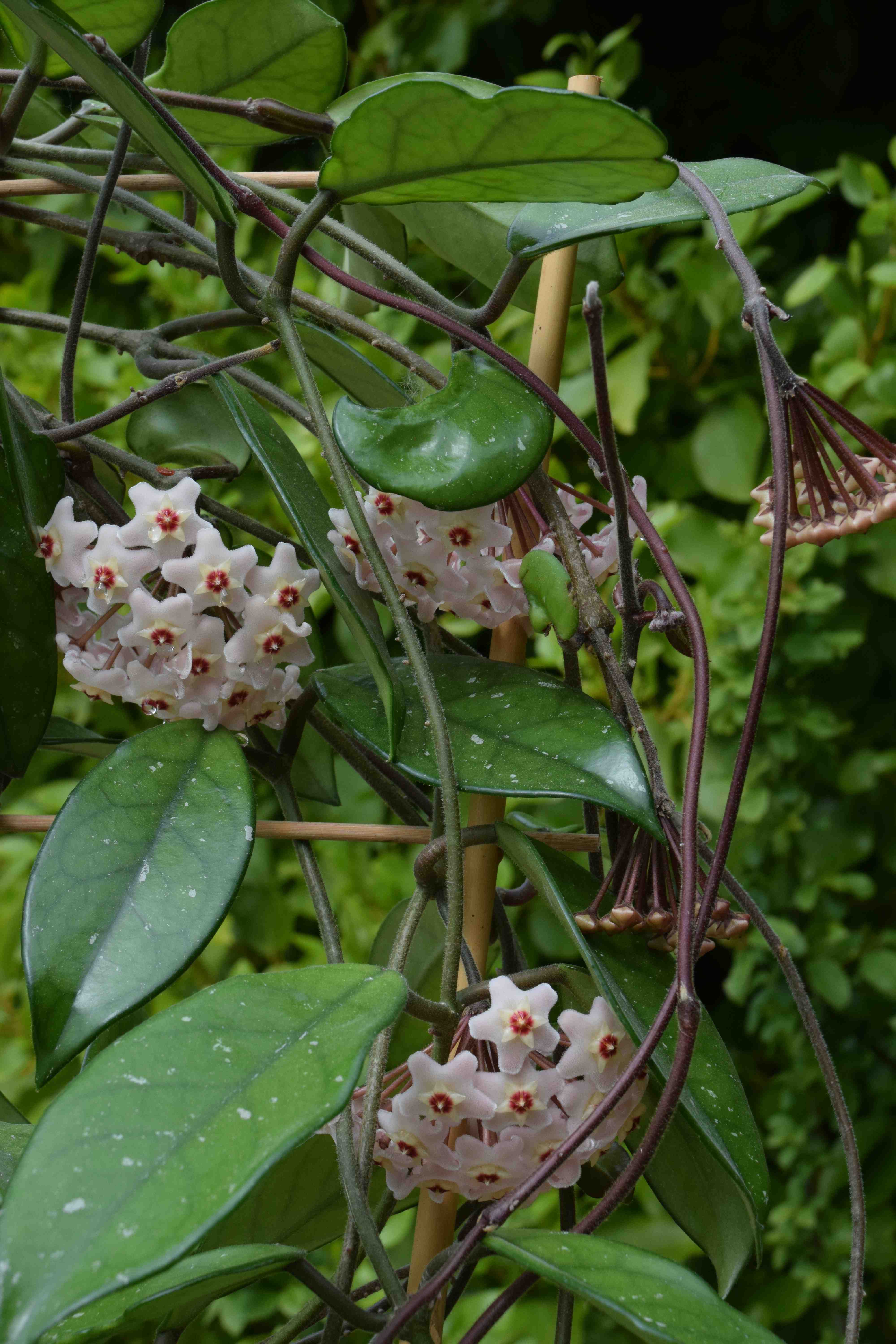 Despite the fact that almost every day I write this blog (I can’t cope with doing it on the move) I can look at my hoya if I lift my eyes above my laptop, I have managed to avoid mentioning it. I bought the plant two years ago at a church fair on the plant stall and it was a lopsided single stem tied to a split cane. As such I am not sure of its precise name and it looks for all the world like Hoya carnosa, the common wax flower, apart from the random silver speckles on the leaves. There are forms of Hoya carnosa that have this leaf marking so in the absence of any more accurate name I will call it this.