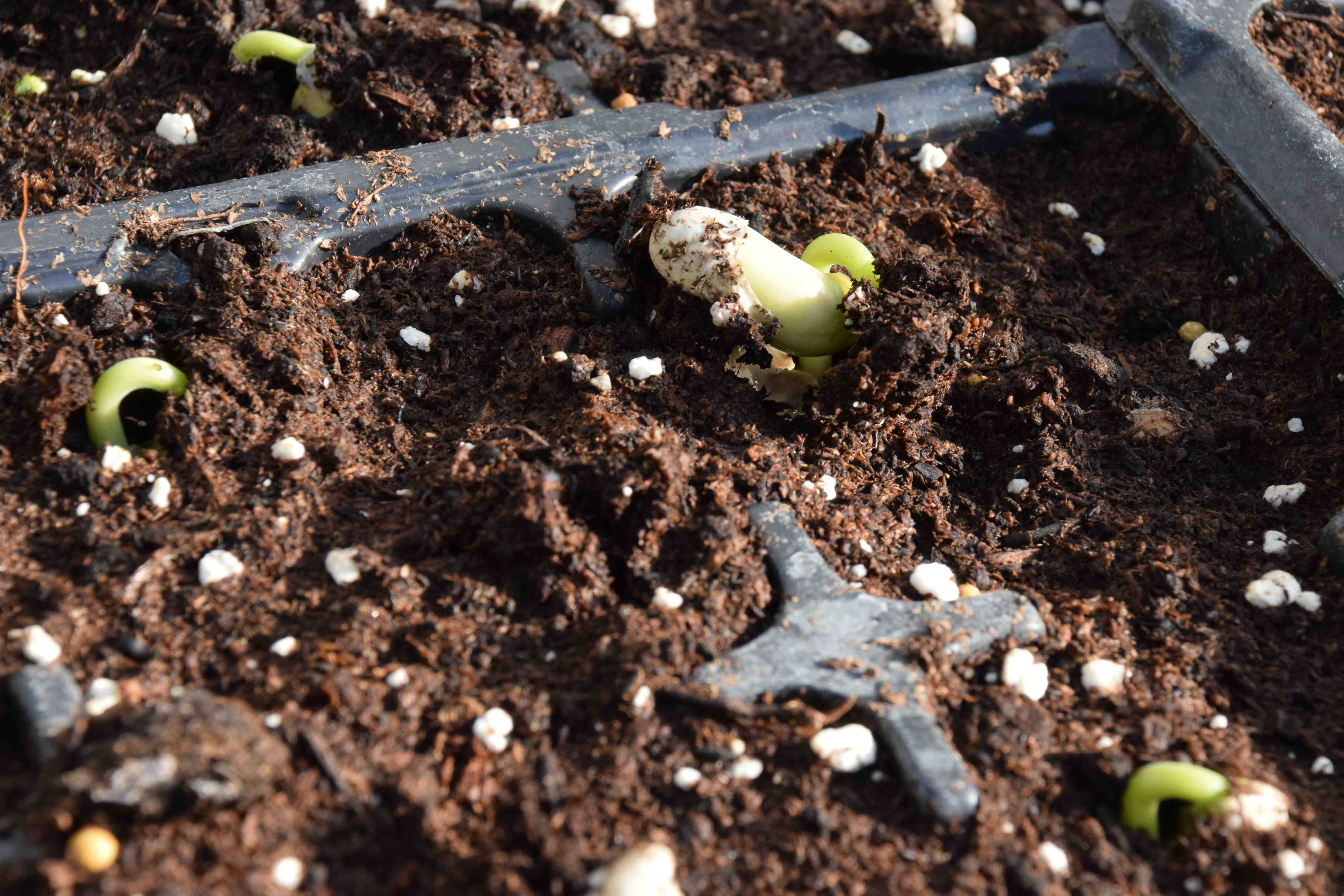 And only five days after sowing, the ‘Hunter’ French beans are already pushing through the compost. Because French beans HATE cold soil I always sow the climbing French beans in cell trays in warmth. I will sow dwarf varieties in situ in June for a later crop when the soil is nice and warm. Climbing French beans crop over a long period and are more reliable than runner beans – but I grow them too