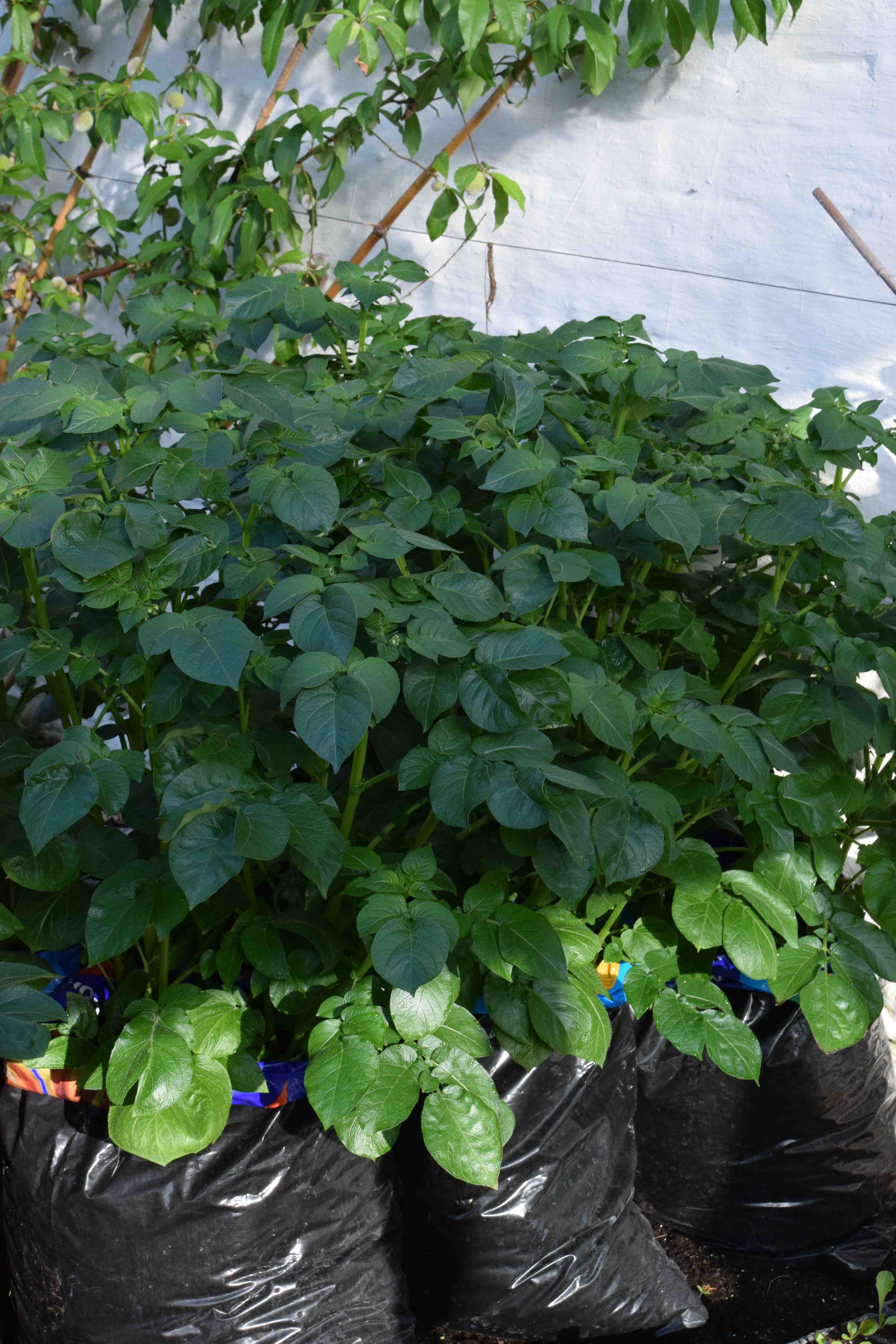 The ‘British Queens’ are doing well in their bags. I added controlled-release fertiliser to the compost as I topped them up. Flowers are now forming in the tops so I hope I will be able to rummage around for some spuds soon