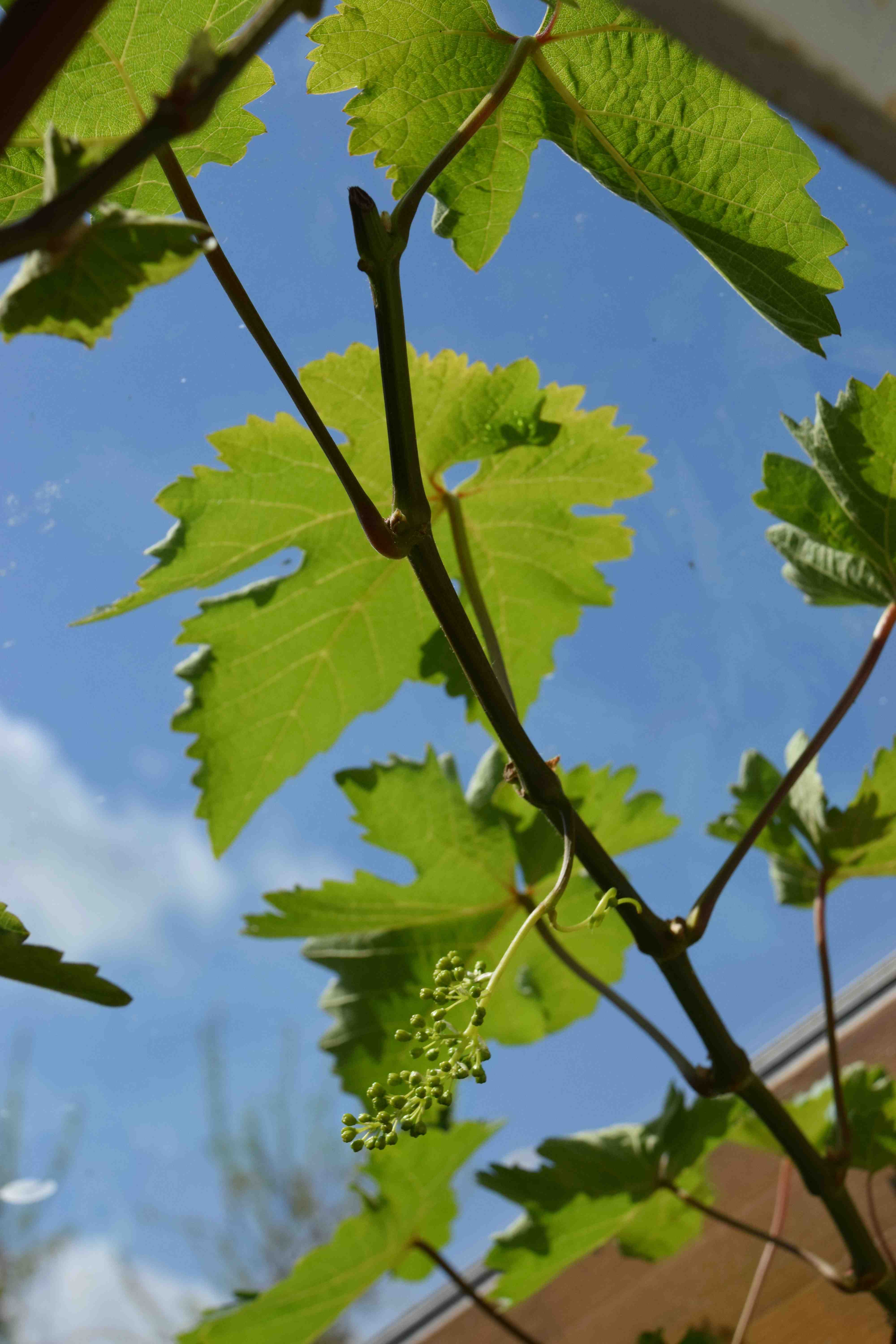 You can also help pollinate the flowers and get good bunches of grapes if you brush your hand over the flowers when they are open. Do not expect flowers of great beauty – they are small and green, and they open over several days so you should repeat it a couple of times. It is not always essential but it can help pollination and help ‘set’ even bunches.