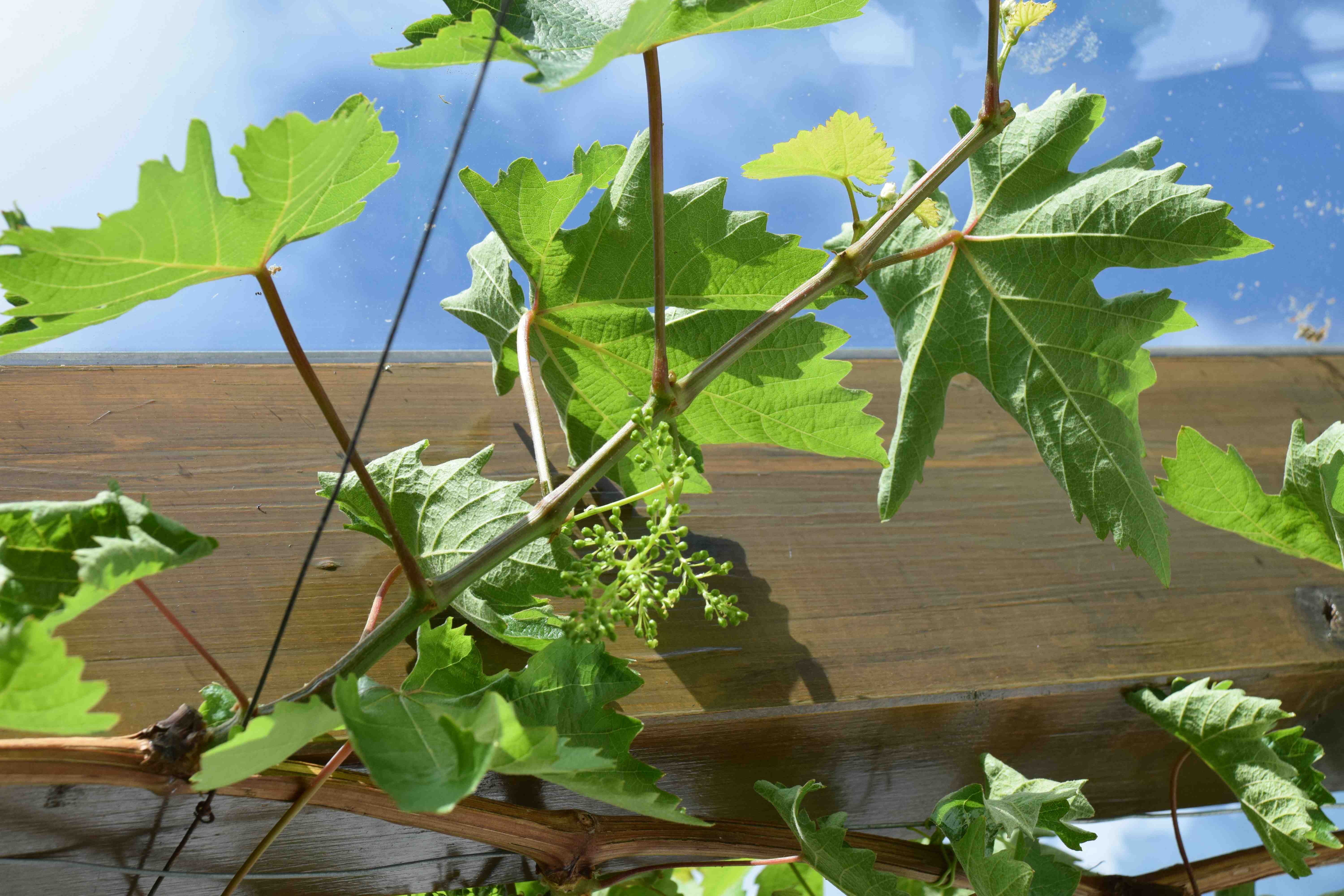 You leave two leaves beyond the bunches of grapes to help ‘pull’ sap up to the developing fruits.