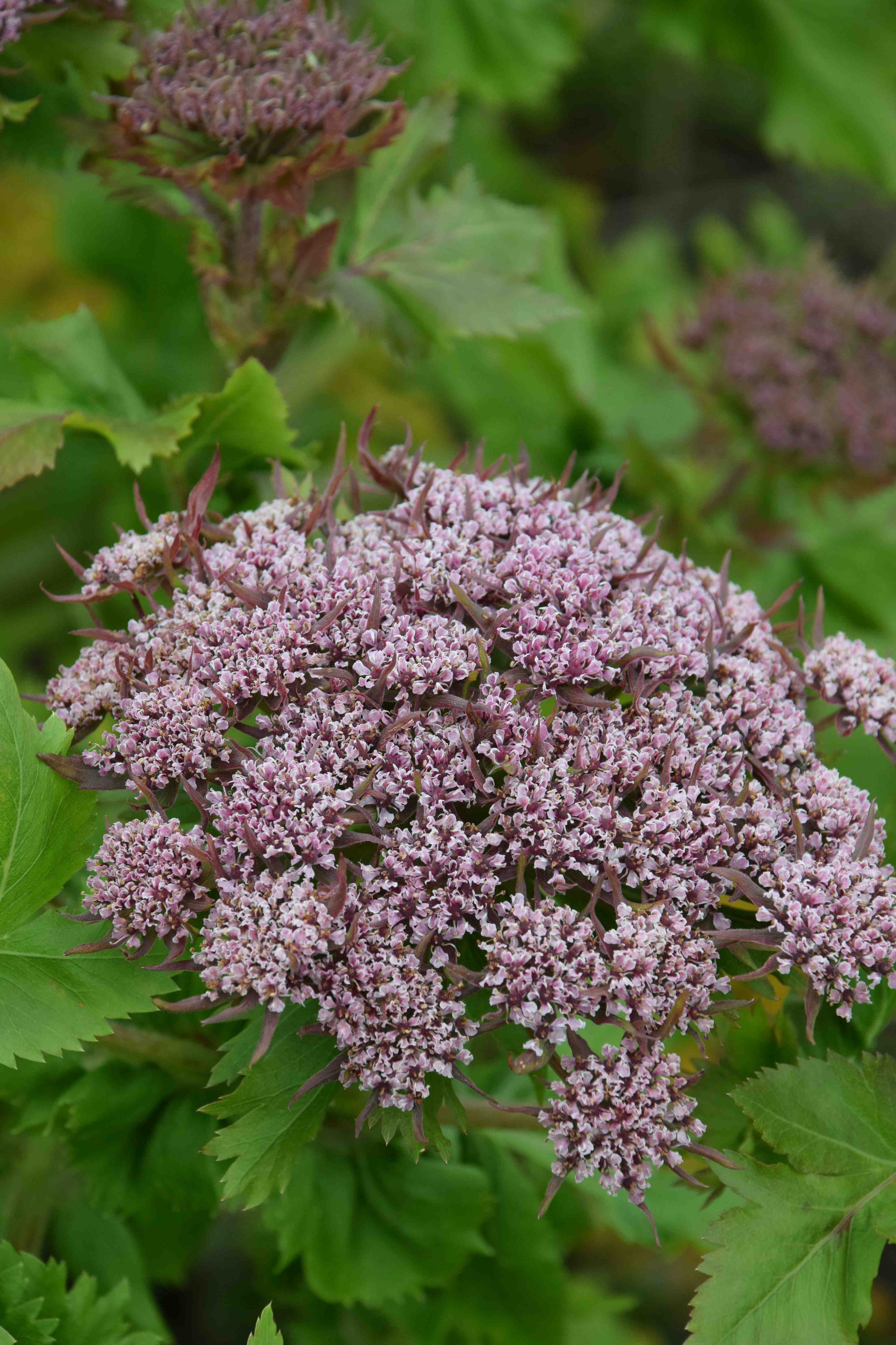Most of the big umbellifers have stage presence because of their structure in the border but melanoselinum has something more. Instead of the very common white flowers in the family, these flowers, though tiny, are actually a rich pink and surprisingly showy.