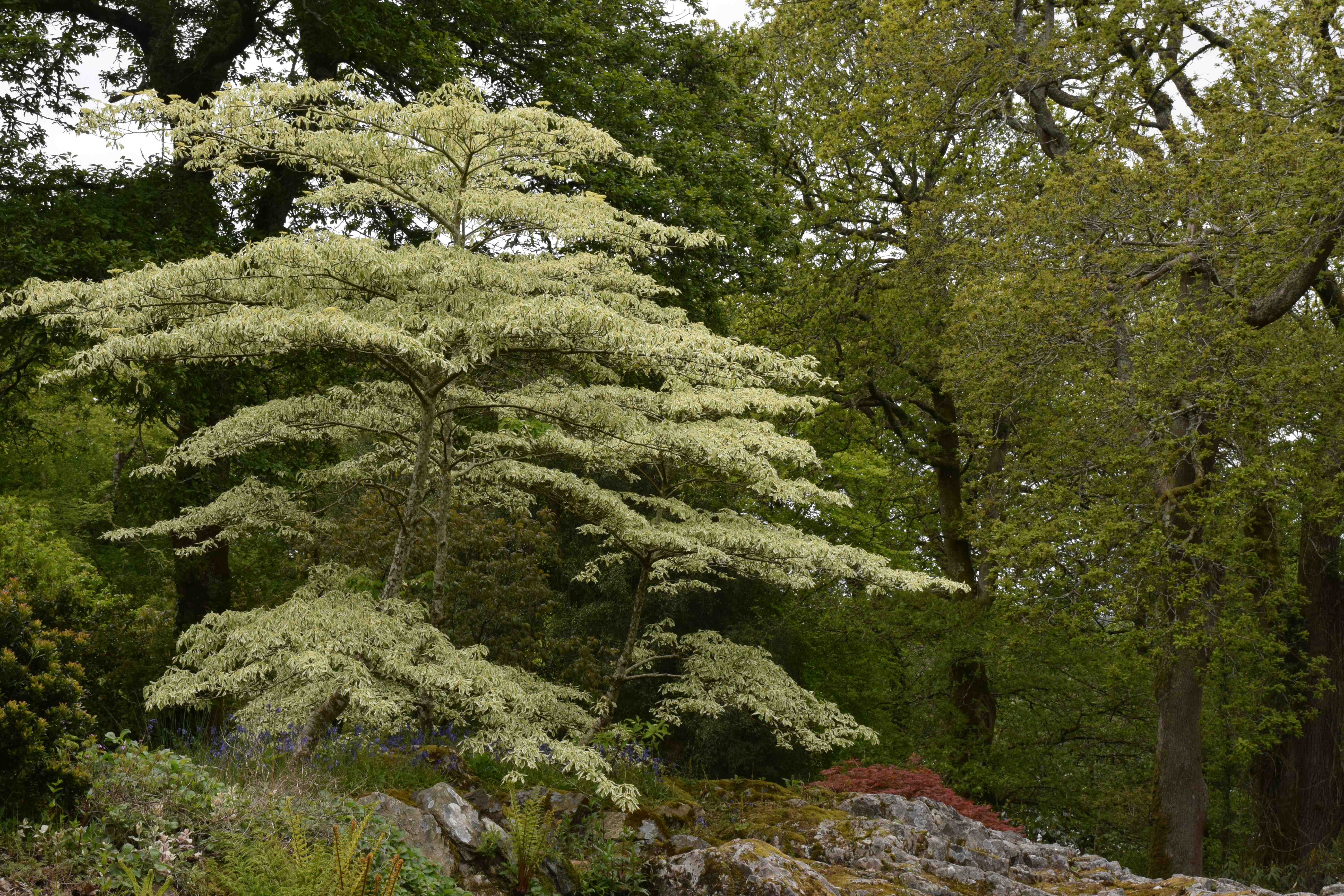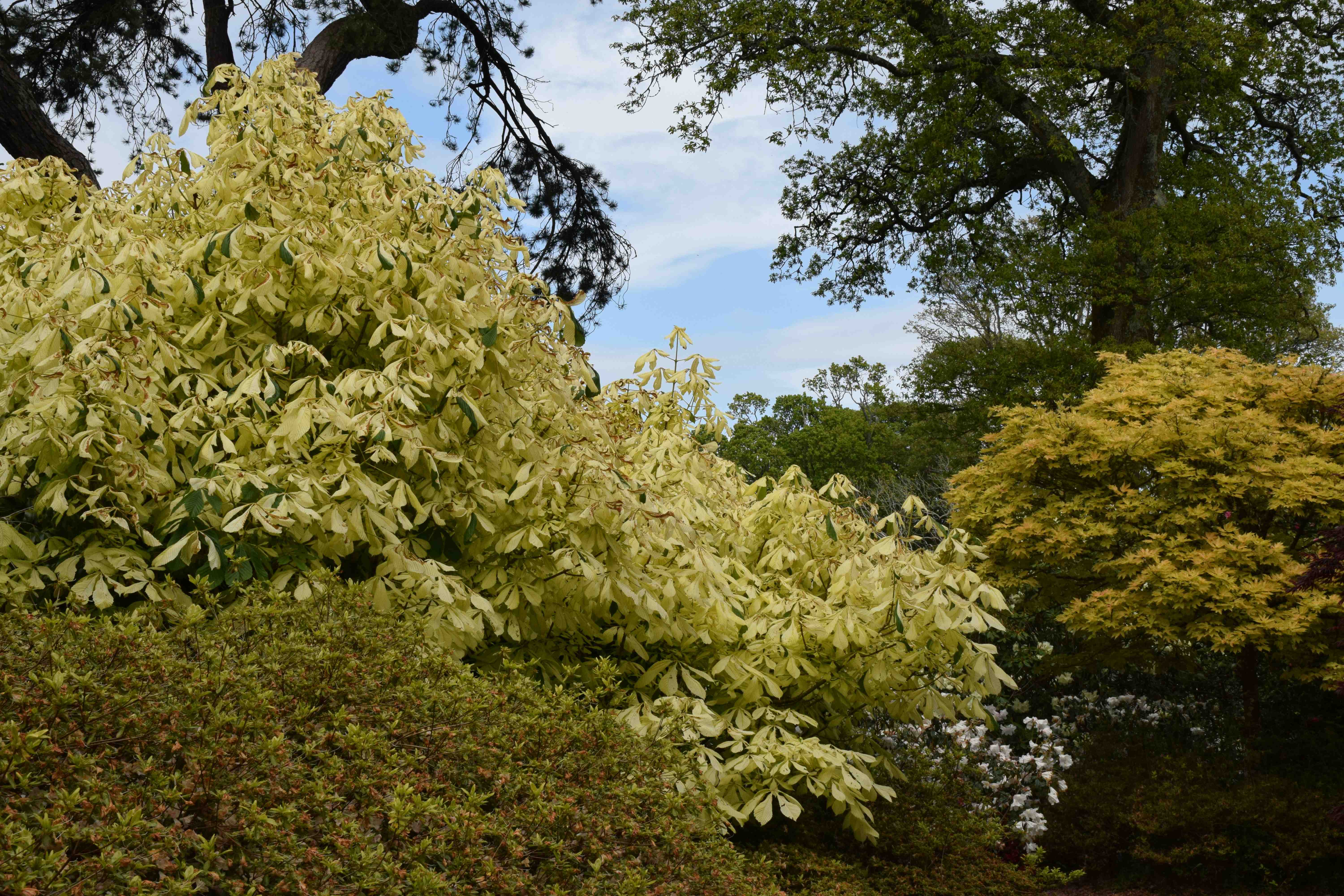 An extraordinary horse chestnut: Aesculus hippocastanum ‘Hampton Court Gold’ with fragile-looking primrose yellow leaves with green streaks here and there