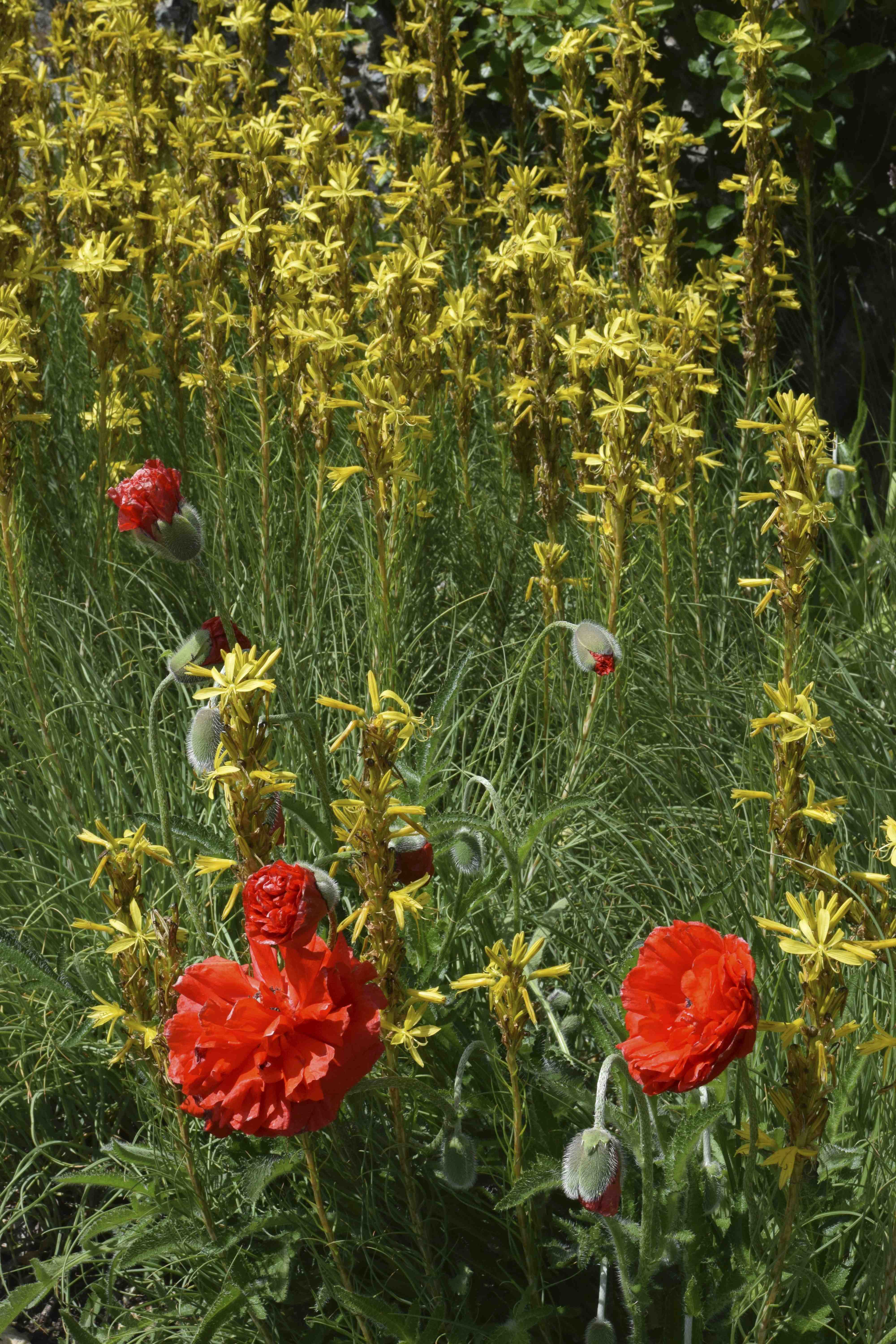 In the walled garden there was masses of colour including this contrasting pair of double oriental poppies and Asphodeline lutea.