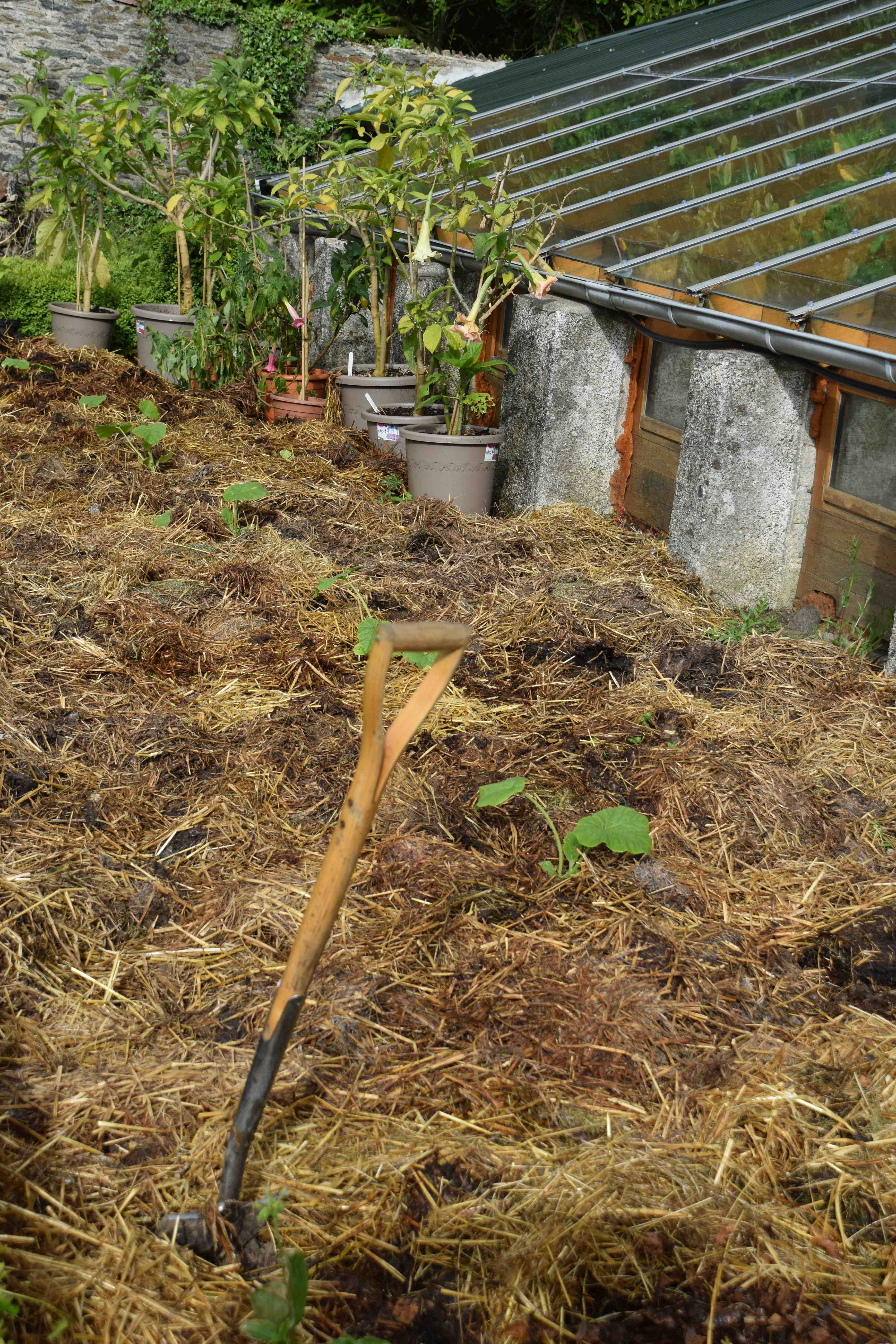 Most of the bed where I planted the squash, and all the beds where I am growing big pumpkins, have had a thick mulch of strawy manure. The soil was first covered in mushroom compost and that was rotovated in first. The strawy manure has only been stacked for a few months so it is not really good for digging in but is ok for mulching and any unrotted straw will provide a clean surface for the pumpkins to sit on. The mulch will keep in soil moisture and also act as a buffer against the wind so the young seedlings, which are very brittle, are not too bashed around. The main problem with partially composted straw is that it can encourage slugs so I will protect the young plants.