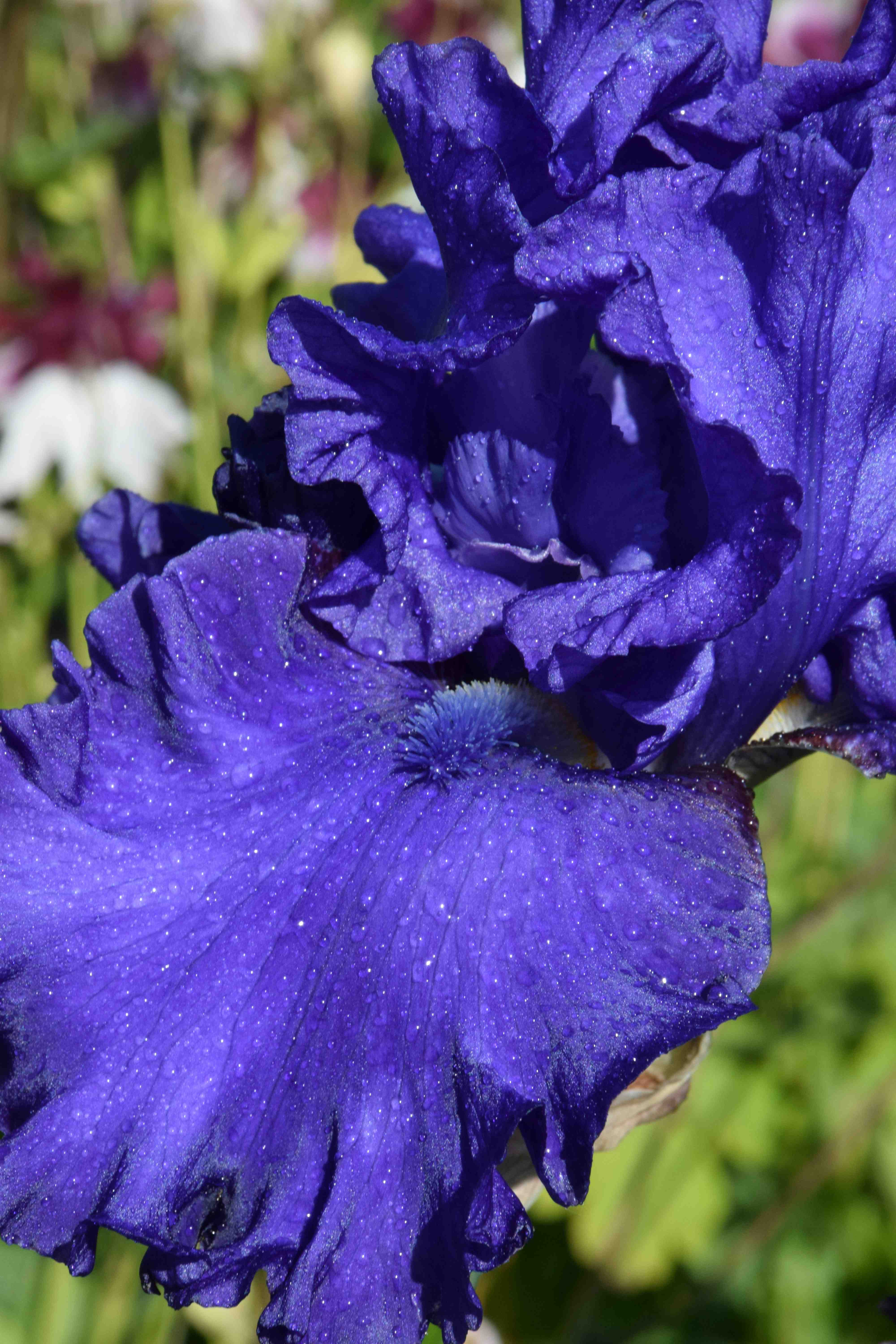 It has tall (1m) strong stems that have withstood the awful winds and perfectly formed flowers with waved standards that, again, have managed to keep their shape despite the wind. But, apart from that pleasingly ruffled shape that is full but does not mask the classic iris flower shape, it is that colour! Rich, inky blue. No fading, flushing, stipples, contrasts or other nonsense. Even the beard is the same colour. It is just beautiful, saturated, intense blue to get lost in. WOW.