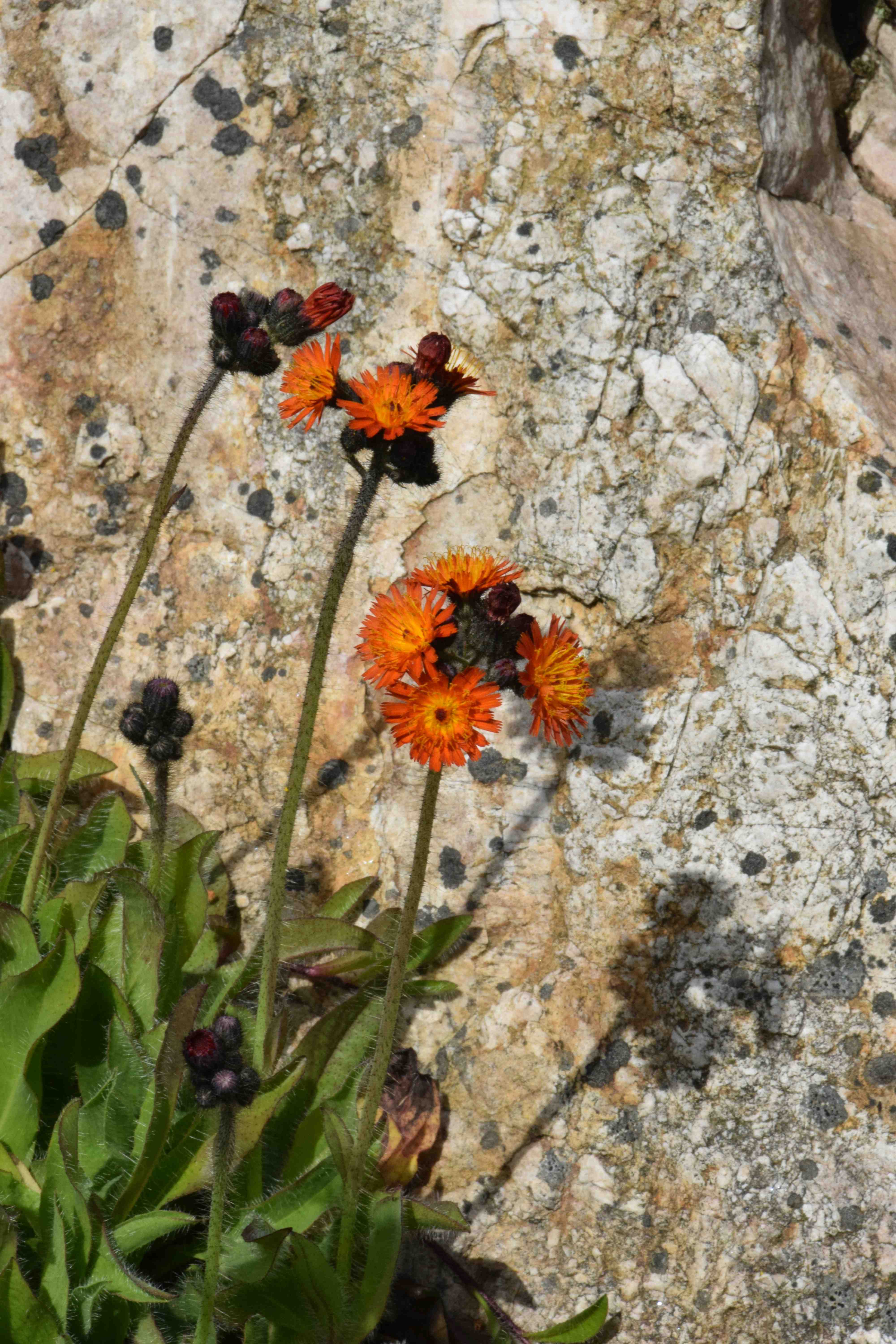 Lowly plants are welcome here. Although it can be a weed (well IS a weed) I love Hieracium aurantiacum (now Pilosella aurantiaca) or fox-and-cubs and here it looks perfect against the orange-hued rocks