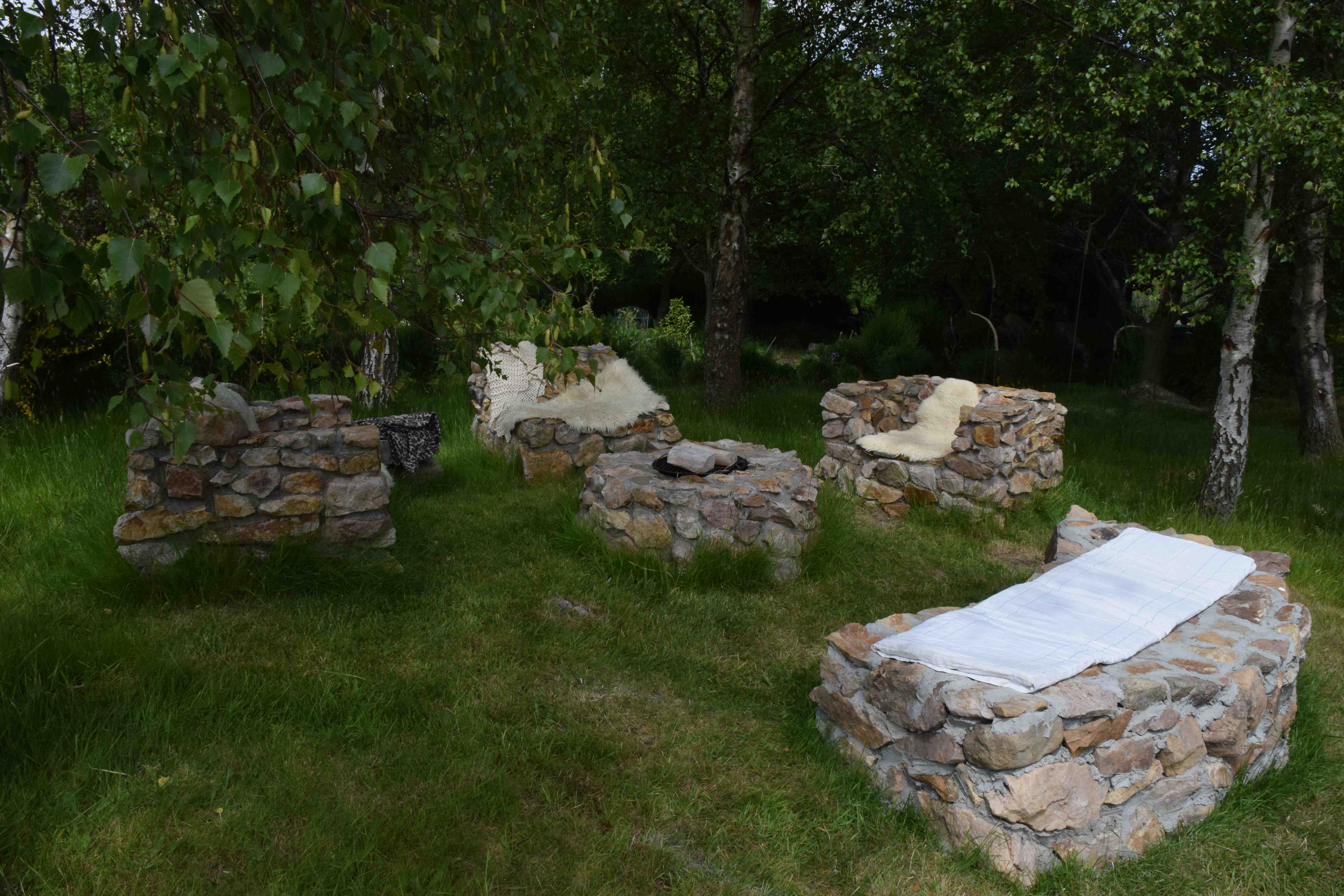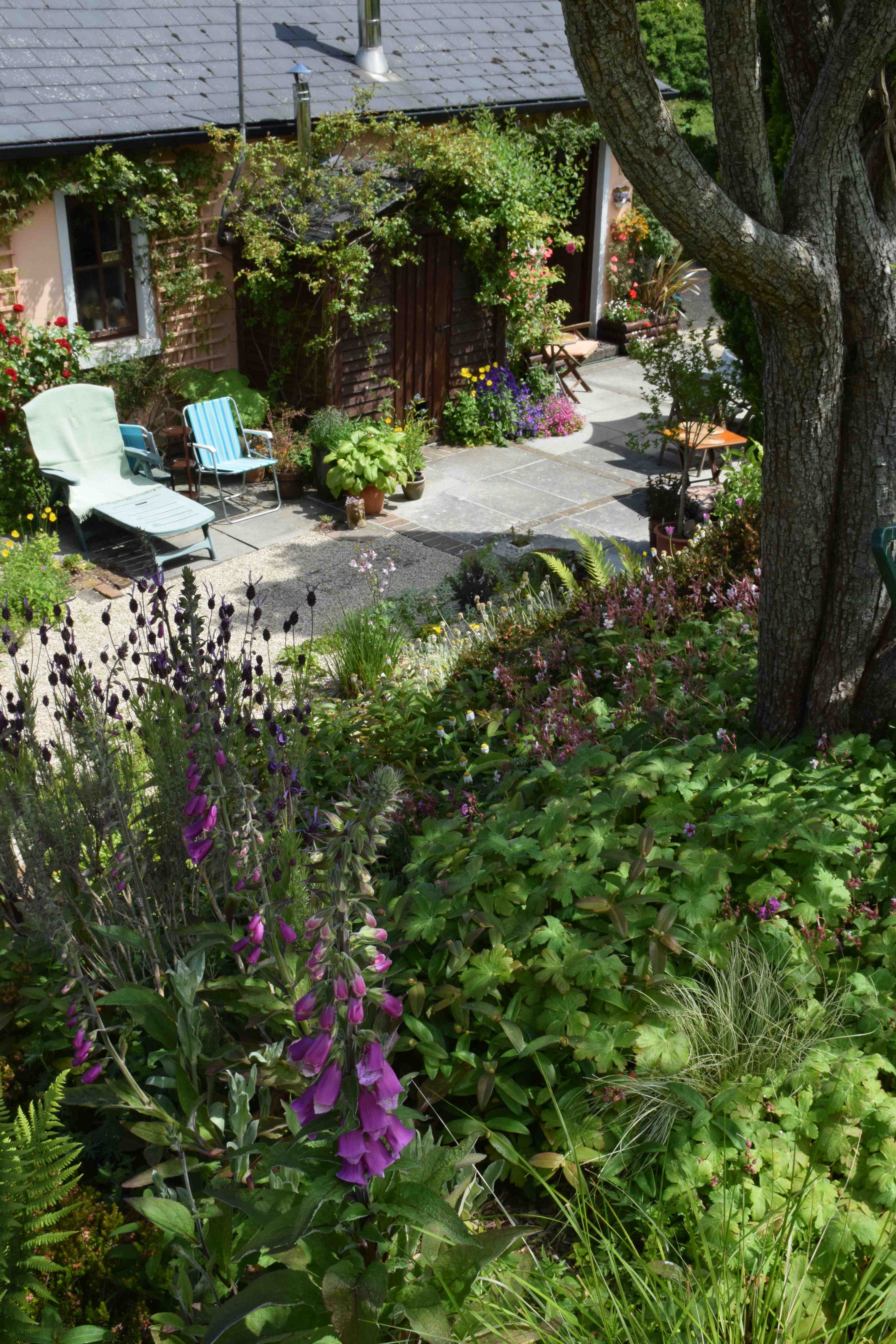 Merriel has created the garden over the past 20-odd years and had a formidable job. Although the garden benefits from a wonderful view of the Big Sugar Loaf (I sound like an estate agent!) this comes with some problems. Apart from the gorse which covered the site at first – and was a fire risk – the garden is windy and littered with rocks. Merriel has used these to her advantage but, despite the fact that the site slopes steeply, she has still managed to fit in a long, narrow, flat lawn with borders on either side that you have to ‘discover’ as you walk round. It is typical of the generous nature of the garden that this formal, grand ‘set piece’ is not the first thing you see but comes as a surprise as you climb up and down the meandering paths that network the site. It is difficult to know where the garden begins and ends because Merriel has planted the boundaries too and this is a garden that can be seen from every angle. The garden is not huge but deceptively spacious (there I go again with the estate-agent jargon) because of the many paths. In most parts of the garden there is a light hand, with wild foxgloves seeding where they will and ox-eye daisies mingling with carefully placed perennials – this is not easy gardening – but where a firmer hand is needed, such as the formal borders, Merriel is not afraid to take charge and where neat is needed, neat is what you get. The heart of the garden is Merriel’s small home and the planting around this is perfect. A visit ends with tea and cakes on the patio at the back of the house with the gentle sound of her trickling small pond – just perfect.